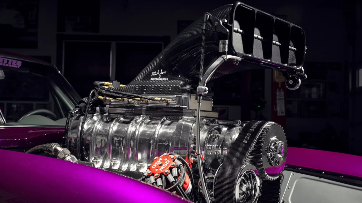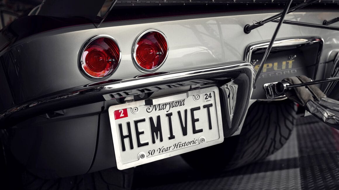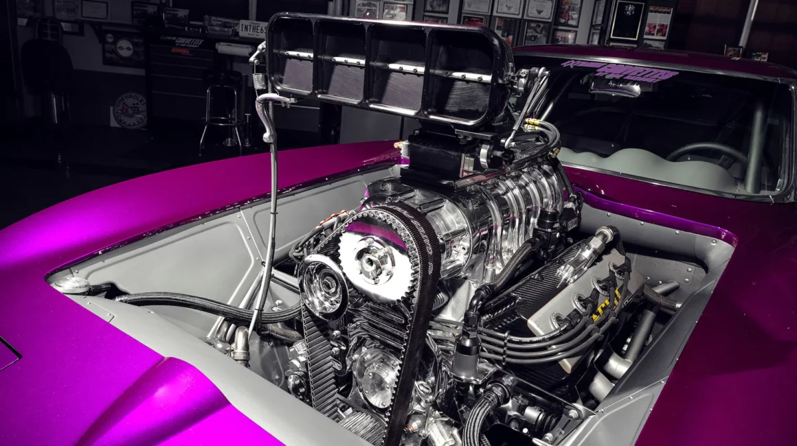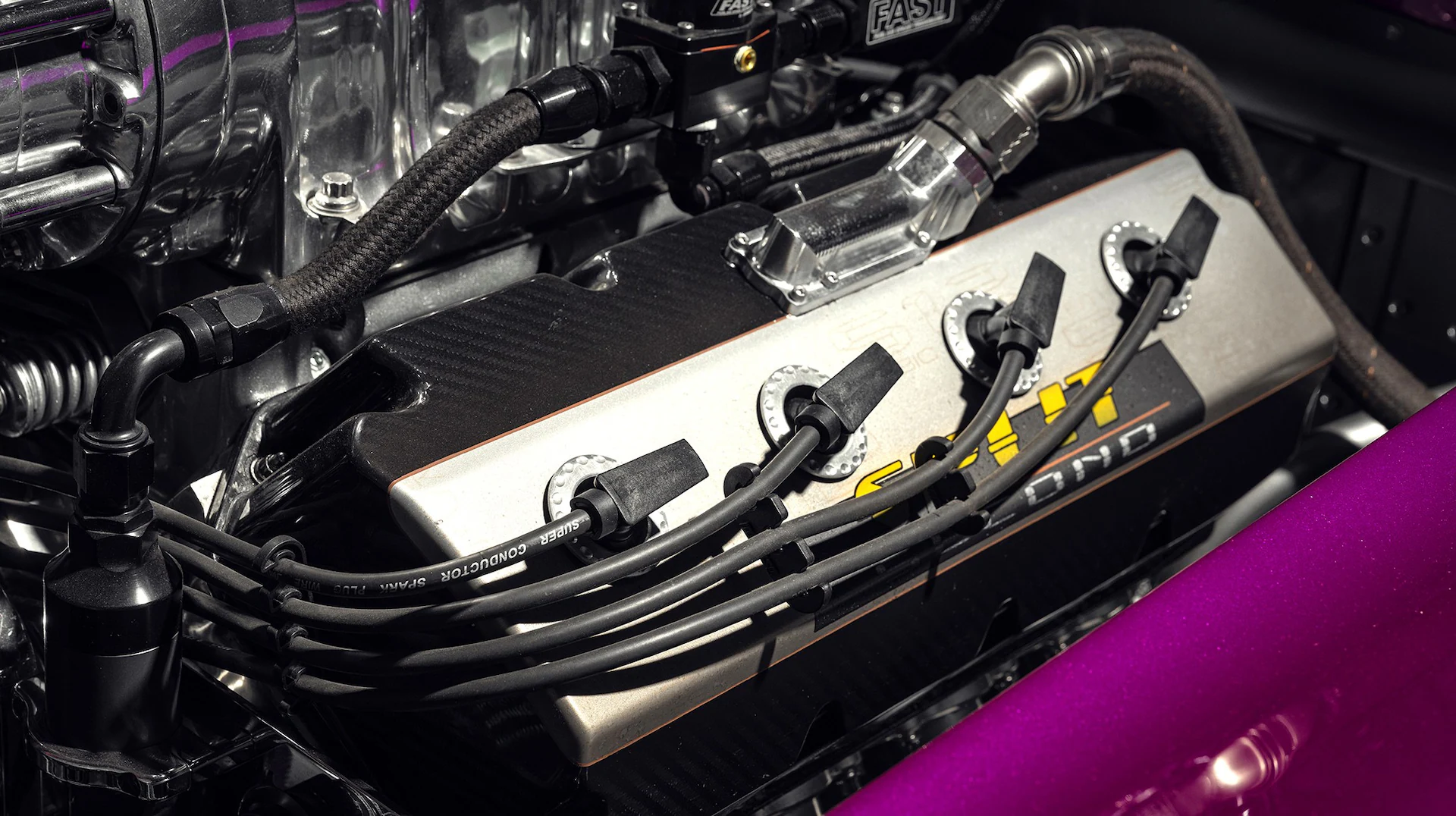Le Hemi a de même été reconstruit de A à Z tout en aluminium pour obtenir une cylidrée de 513ci de type Dragster Top Alcohol délivrant 3.500cv pensant qu’il aurait fière allure. “Mike Janis Race Engines” a débridé le V8 Hemi à un niveau de folie quasi déraisonnable et y a ajouté un système EFI Holley comportant un tas d’électronique. Du carburant de course à 110 octanes est nécessaire pour faire tourner ce moteur de dragster, qui est surmonté d’un énorme compresseur 14-71 Littlefield… Un système MagnaFuel avec quelques pièces de chez “FAST” transporte l’essence de course au Hemi affamé…
