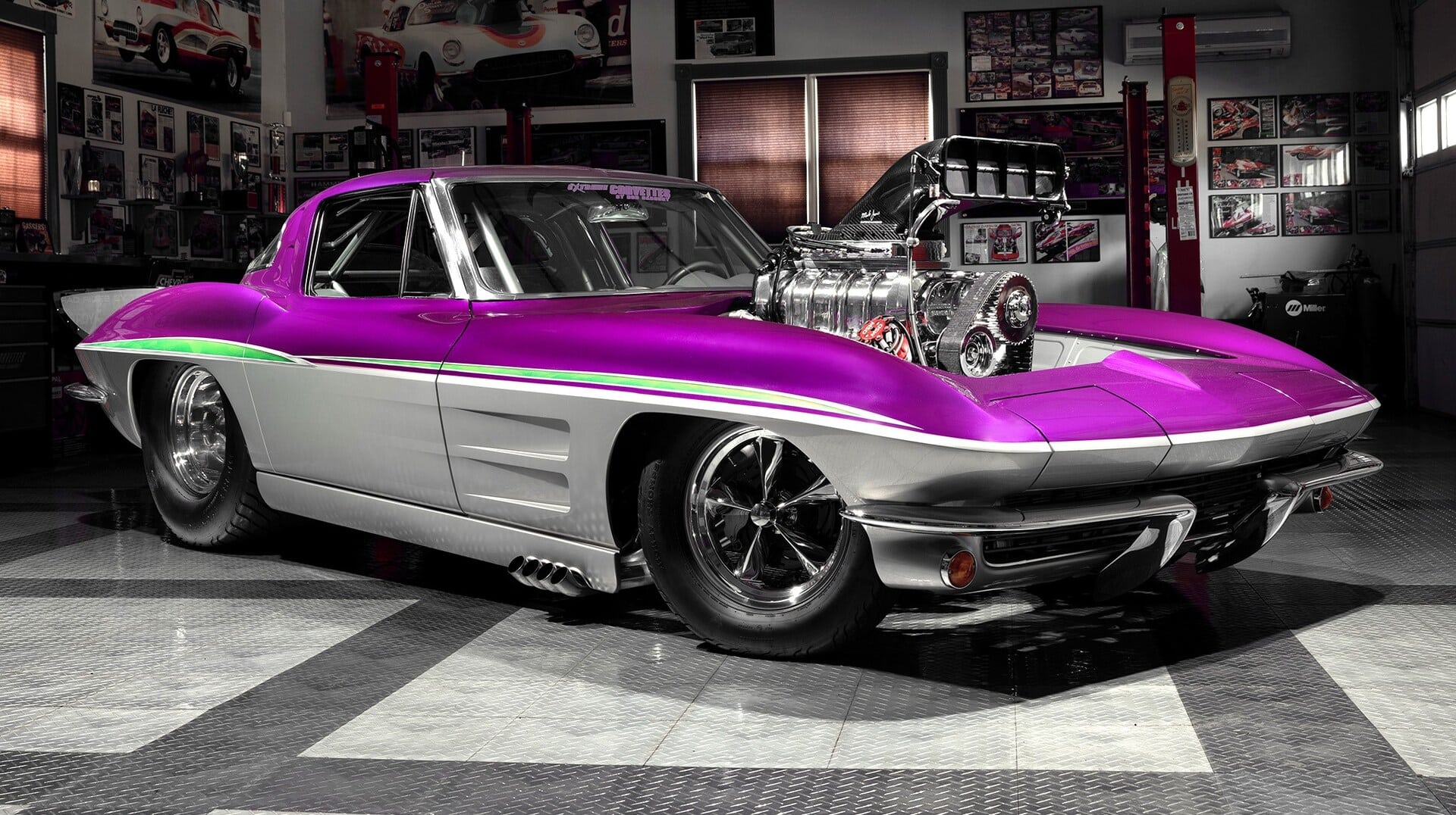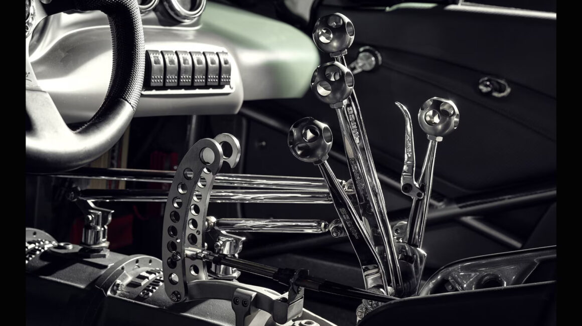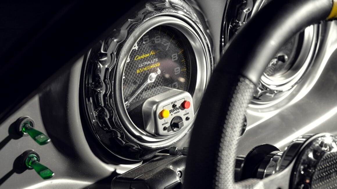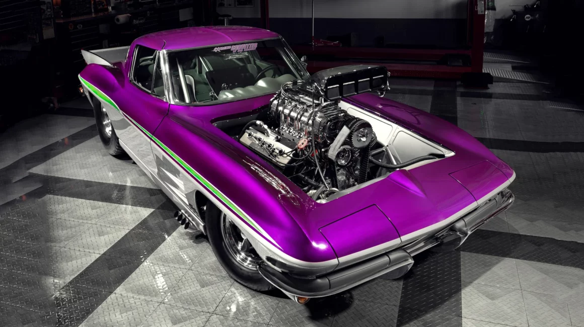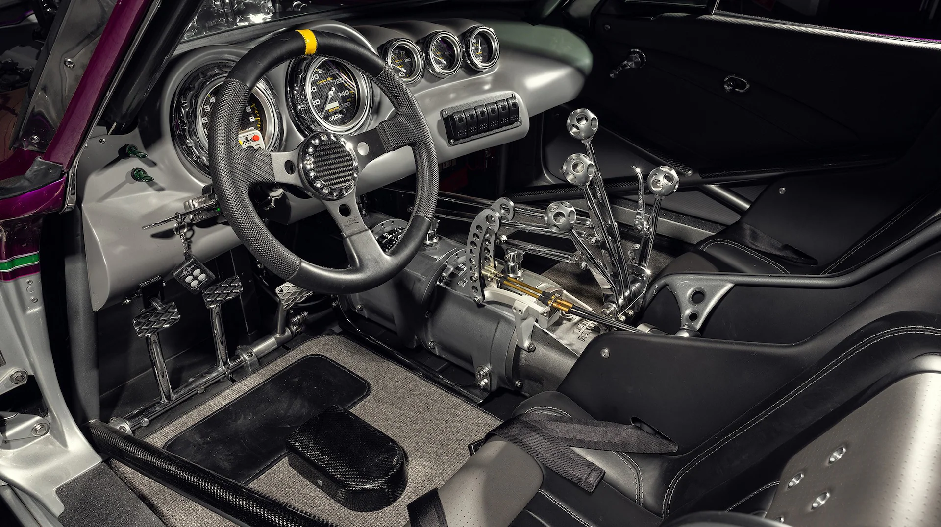 À l’avant, ise trouve une suspension basée sur des jambes de force Lamb et une autre paire de freins à disque Mark Williams. La Corvette roule sur des jantes Billet Specialties, 15×4 à l’avant et 15/15 à l’arrière, enveloppées de caoutchouc Mickey Thompson. Les graphismes personnalisés sauvages et le travail parfait de carrosserie ont été réalisés avec brio par Bob Thrash chez “Rad Rides by Troy”. À l’intérieur, des vitres électriques ont été ajoutées, mais les portes doivent être ouvertes par télécommande puisqu’il n’y a officiellement pas de poignées. (il y a une astuce de sauvegarde invisible).