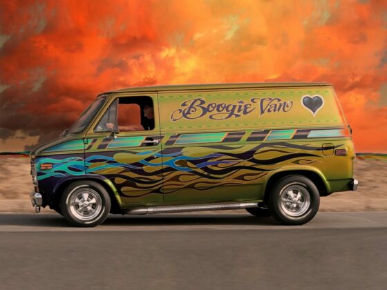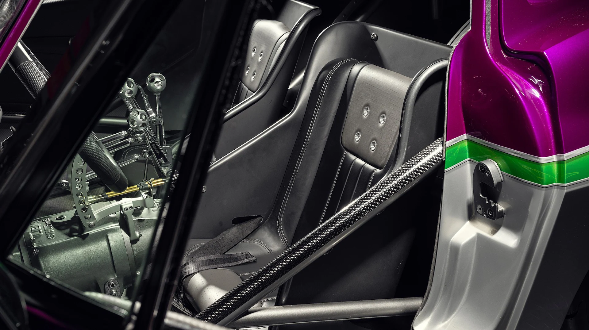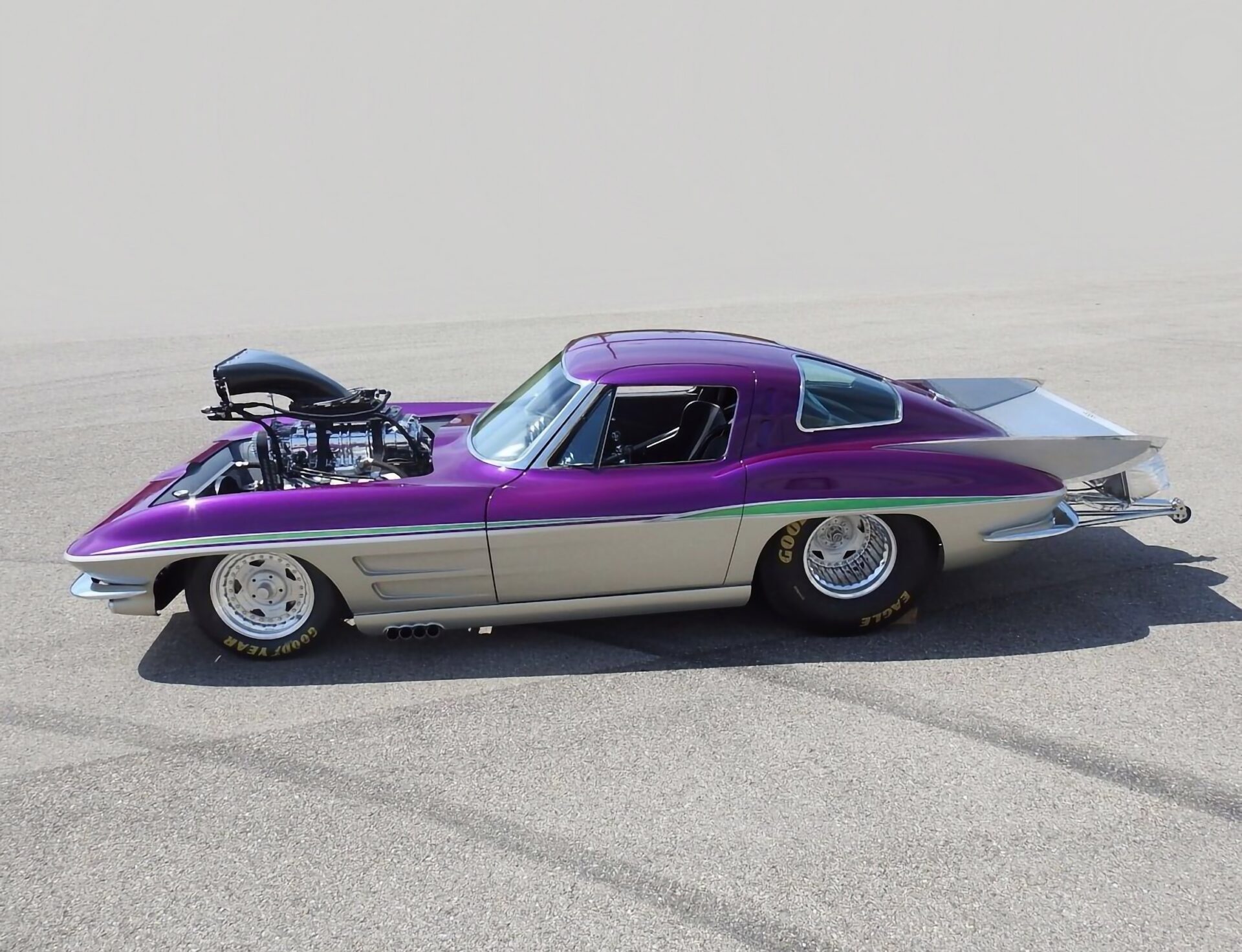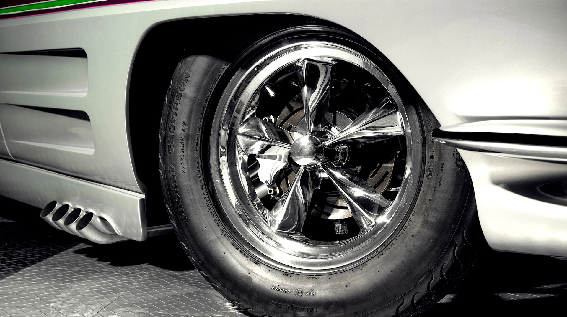 À l’avant, ise trouve une suspension basée sur des jambes de force Lamb et une autre paire de freins à disque Mark Williams. La Corvette roule sur des jantes Billet Specialties, 15×4 à l’avant et 15/15 à l’arrière, enveloppées de caoutchouc Mickey Thompson. Les graphismes personnalisés sauvages et le travail parfait de carrosserie ont été réalisés avec brio par Bob Thrash chez “Rad Rides by Troy”. À l’intérieur, des vitres électriques ont été ajoutées, mais les portes doivent être ouvertes par télécommande puisqu’il n’y a officiellement pas de poignées. (il y a une astuce de sauvegarde invisible).