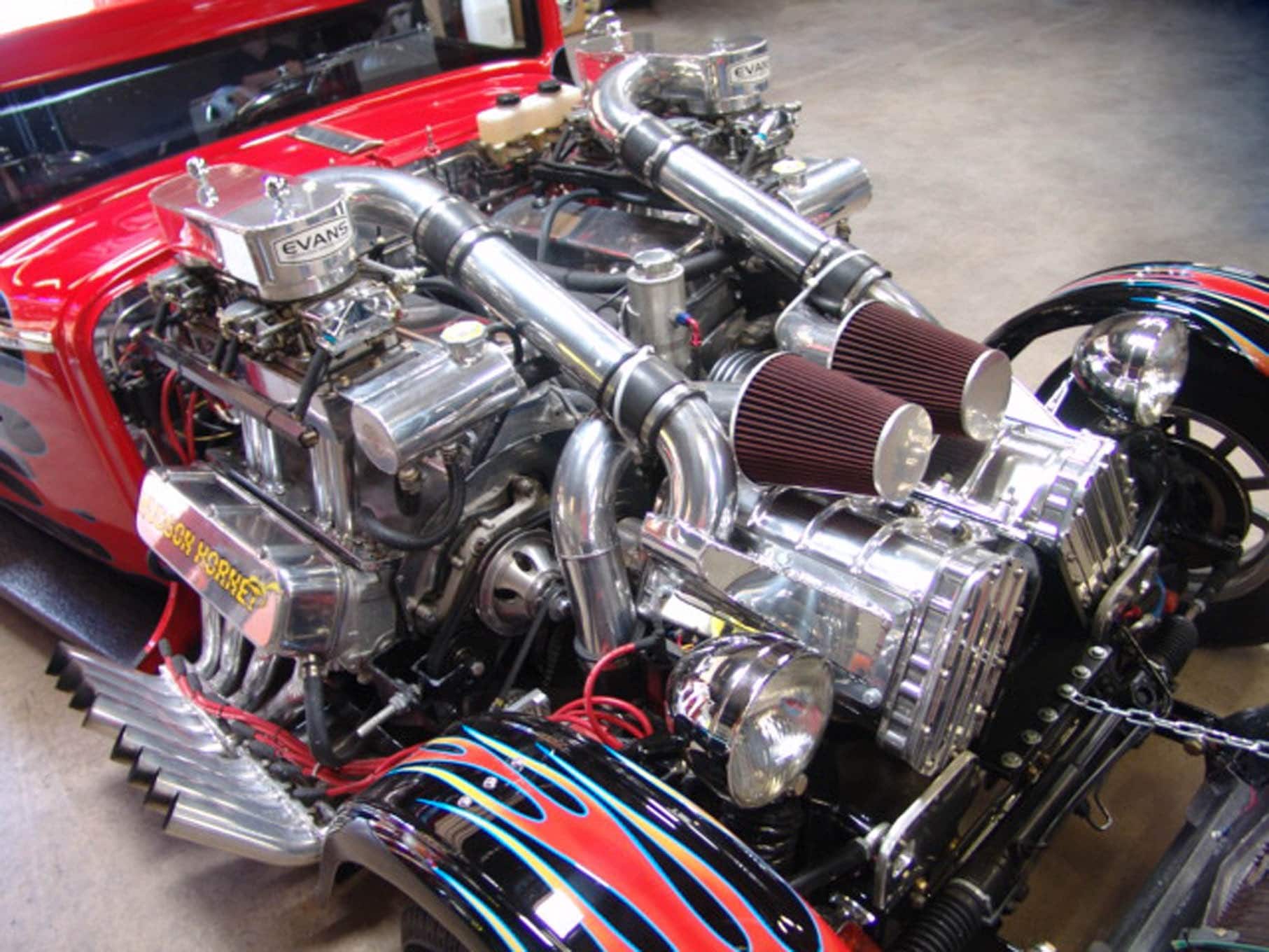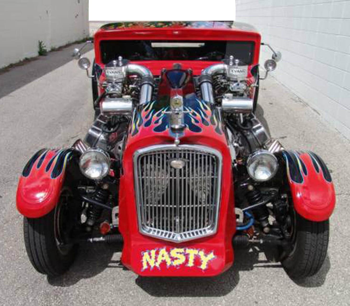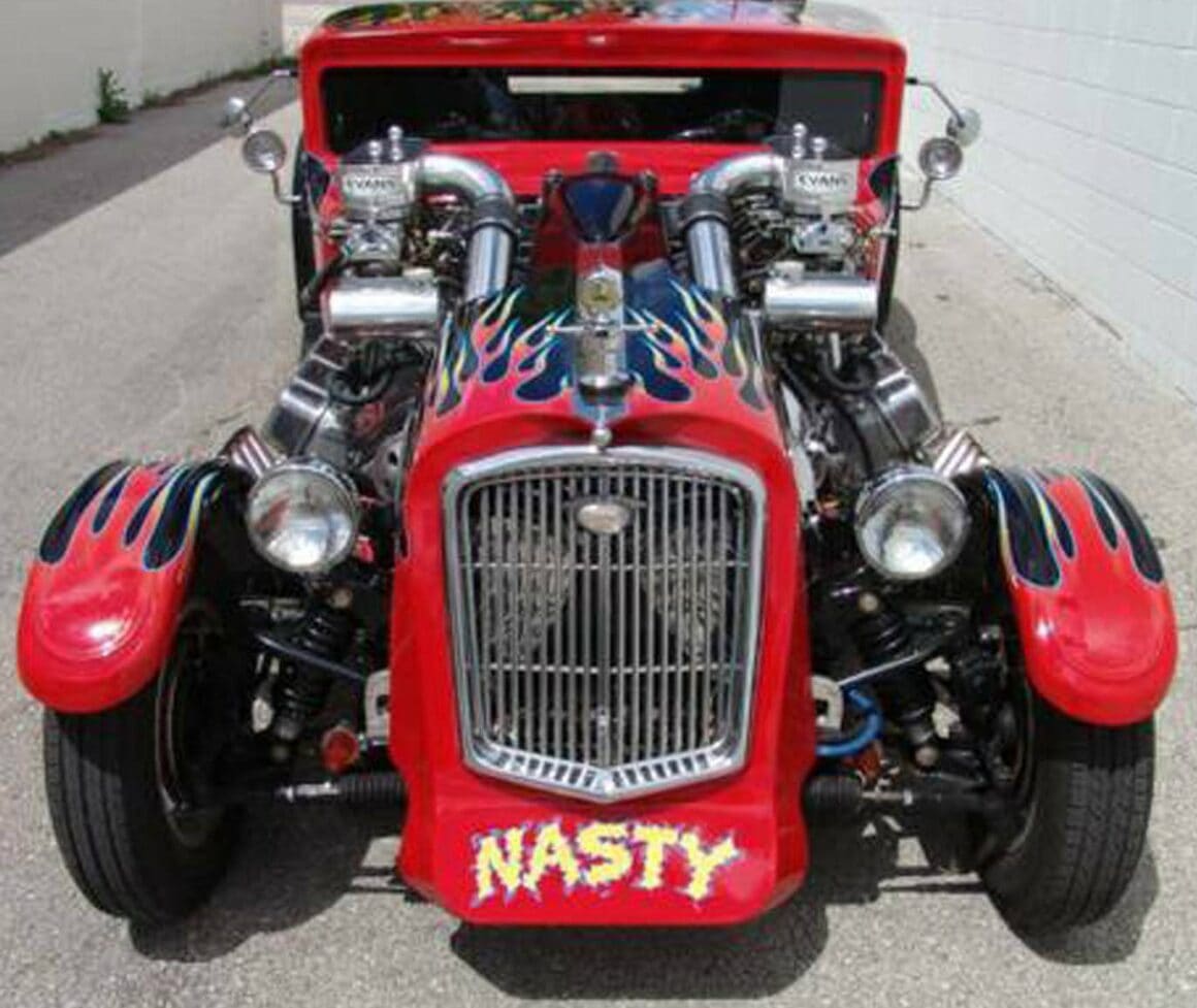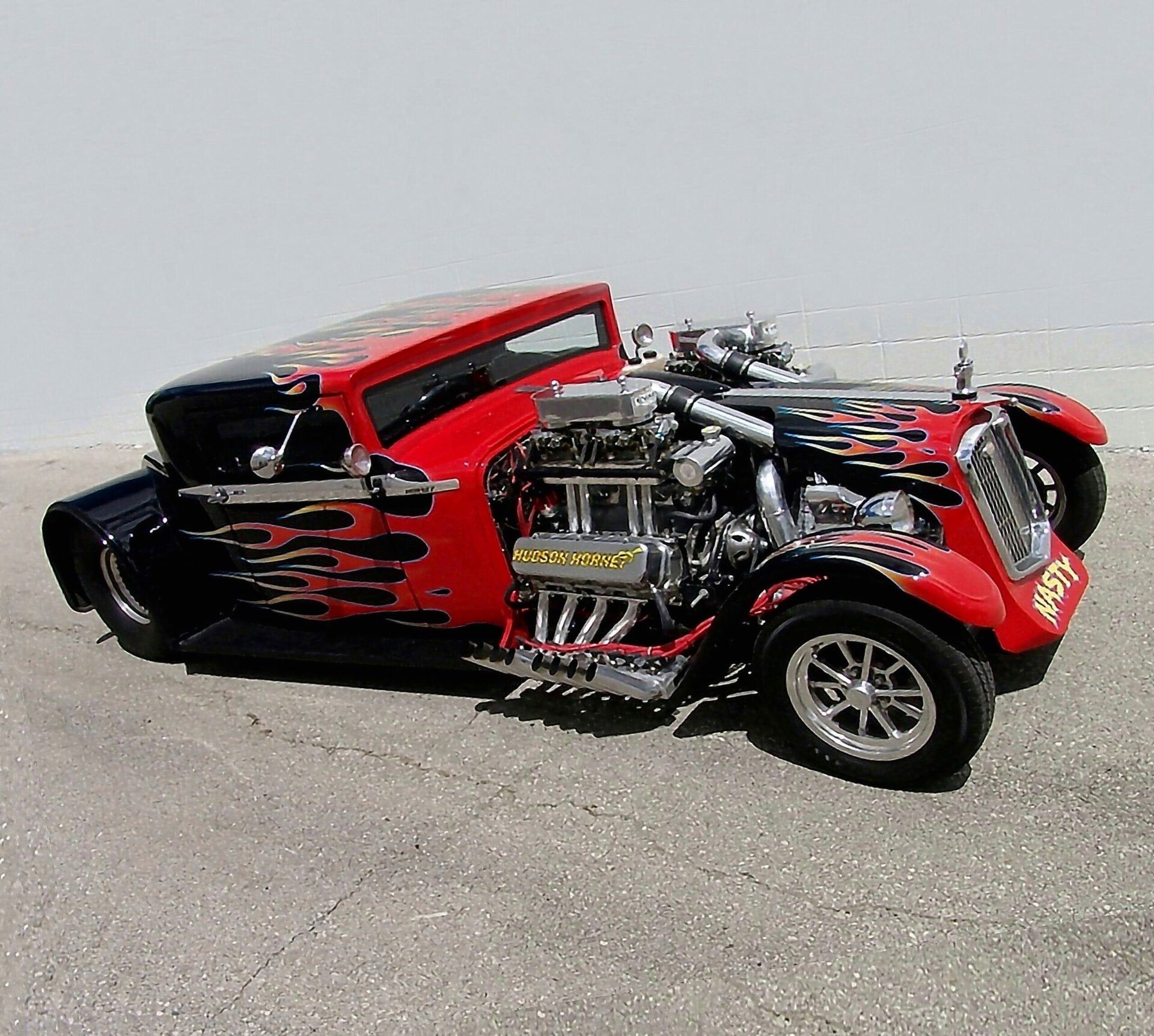 Cet “Humadon” est le diable personnifié en Hot Rod… Cette machine apocalyptique a été basée sur une Hudson Hornet 1930. Le toit a été Top-choppé de 3 pouces, puis élargi de 13 pouces pour correspondre à la largeur des deux big-blocs Chevy. Les ailes arrière et le coffre reformés “à la main”, mesurent “un bonker” de 7 pieds et 4 pouces de large. Les ailes avant sont d’authentiques ailes de Ford Model T, tandis que les feux arrière sont des dons venant de plusieurs vénérables 1959 Cadillac. Les jantes avant sont des Rocker Gasser de 15 x 4,5 pouces, avec des pneus de dragsters “boilloires-massives” de 15 x 15 pouces à l’arrière. Le châssis a été construit sur mesure, comme vous pouvez l’imaginer, selon la place nécessaires aux deux big-blocs 468ci surmontés des deux compresseurs/blowers 6-71 et deux boites de transmission Turbo 400, le tout dans un paquet bien rangé.