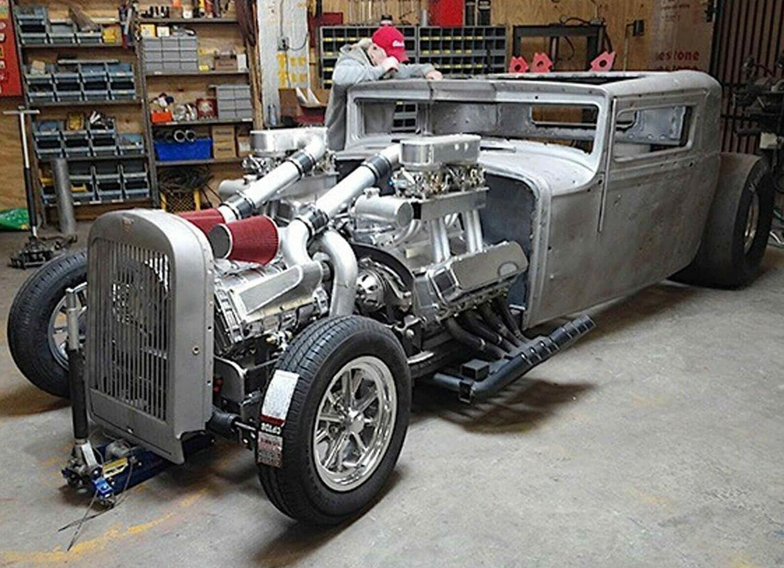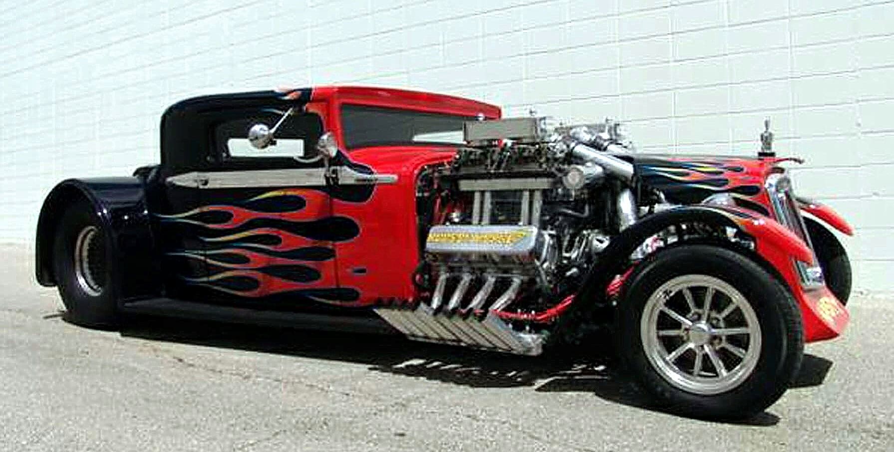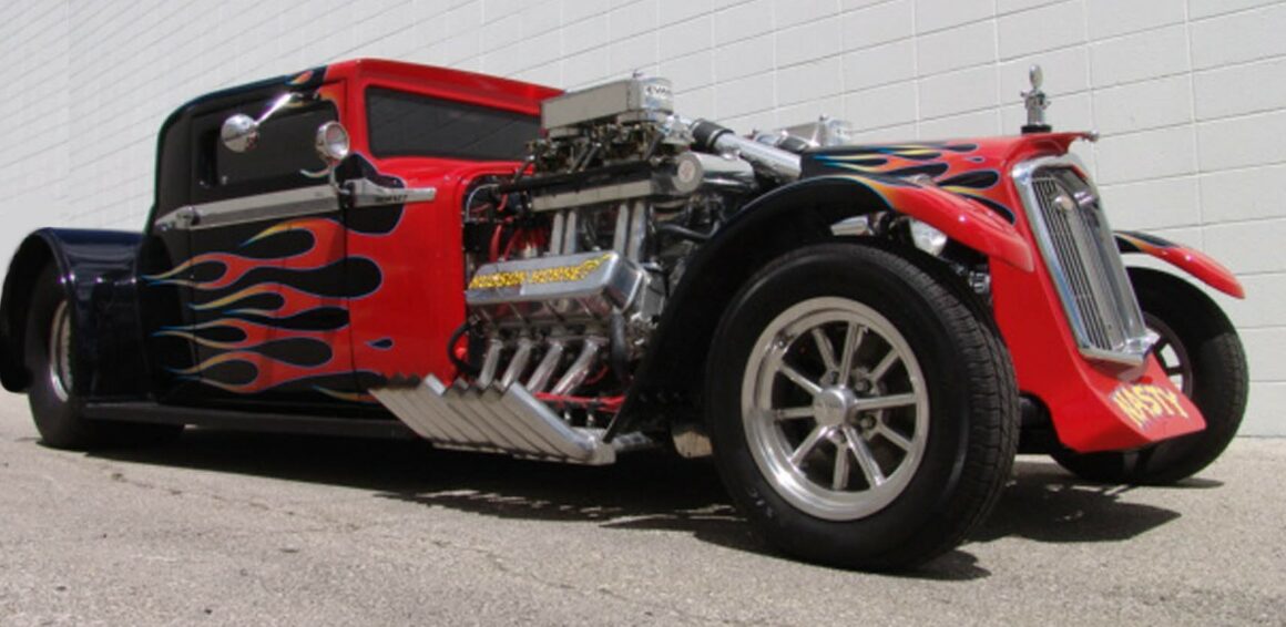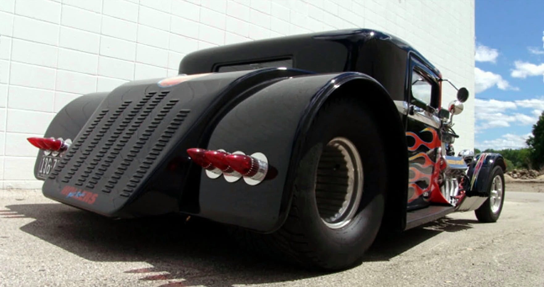 Cet “Humadon” est le diable personnifié en Hot Rod… Cette machine apocalyptique a été basée sur une Hudson Hornet 1930. Le toit a été Top-choppé de 3 pouces, puis élargi de 13 pouces pour correspondre à la largeur des deux big-blocs Chevy. Les ailes arrière et le coffre reformés “à la main”, mesurent “un bonker” de 7 pieds et 4 pouces de large. Les ailes avant sont d’authentiques ailes de Ford Model T, tandis que les feux arrière sont des dons venant de plusieurs vénérables 1959 Cadillac. Les jantes avant sont des Rocker Gasser de 15 x 4,5 pouces, avec des pneus de dragsters “boilloires-massives” de 15 x 15 pouces à l’arrière. Le châssis a été construit sur mesure, comme vous pouvez l’imaginer, selon la place nécessaires aux deux big-blocs 468ci surmontés des deux compresseurs/blowers 6-71 et deux boites de transmission Turbo 400, le tout dans un paquet bien rangé.
