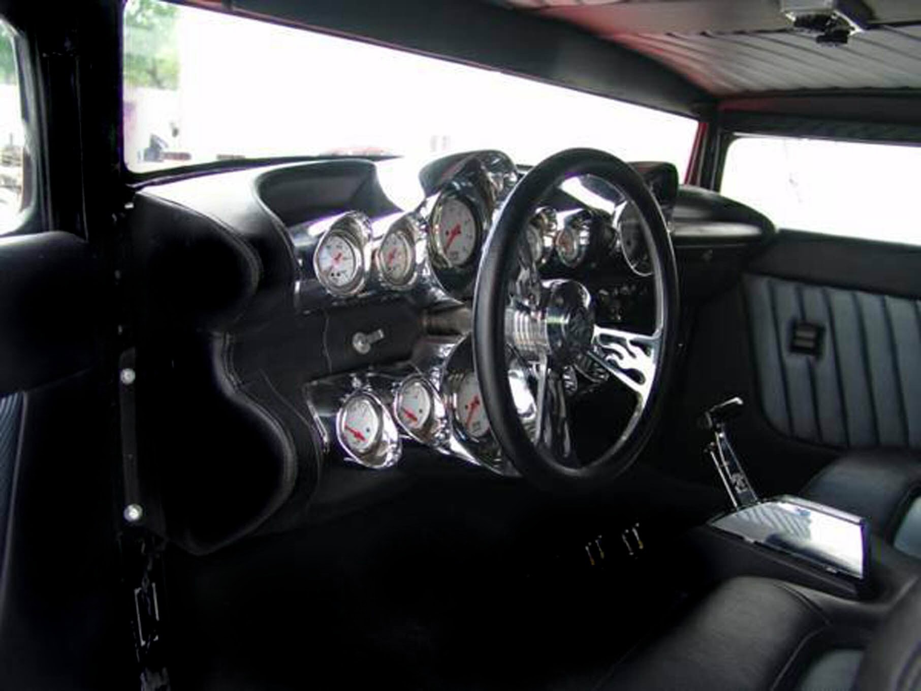 Aucun d’entre vous ne sait quelle est l’histoire, mais je peux vous dire qu’elle est criblée d’impacts de balles, comme si le Hot Rod avait été pris entre des feux croisés lors d’une fuite à grande vitesse. La carrosserie de l’Hudson a été complètement modifiée. Le toit a été Top-Choppé de 3 pouces et étiré de 13 pouces en largeur. Les ailes et passages de roues arrière ont été entièrement fabriqué, mesurant sept pieds et quatre pouces. Les ailes avant proviennent d’un authentique modèle T de 1927. Le capot avant inclinable a été entièrement fabriqué et il complète très bien la carrosserie. Comme vous pouvez le constater, les portes et les panneaux de carrosserie s’alignent exceptionnellement bien et e travail de peinture est d’une beauté époustouflante. Les jantes arrières sont des Centerline 15×15 (33/22/15) et les jantes avant sont des Rocker-Gasser en 4 1/2 x 15.