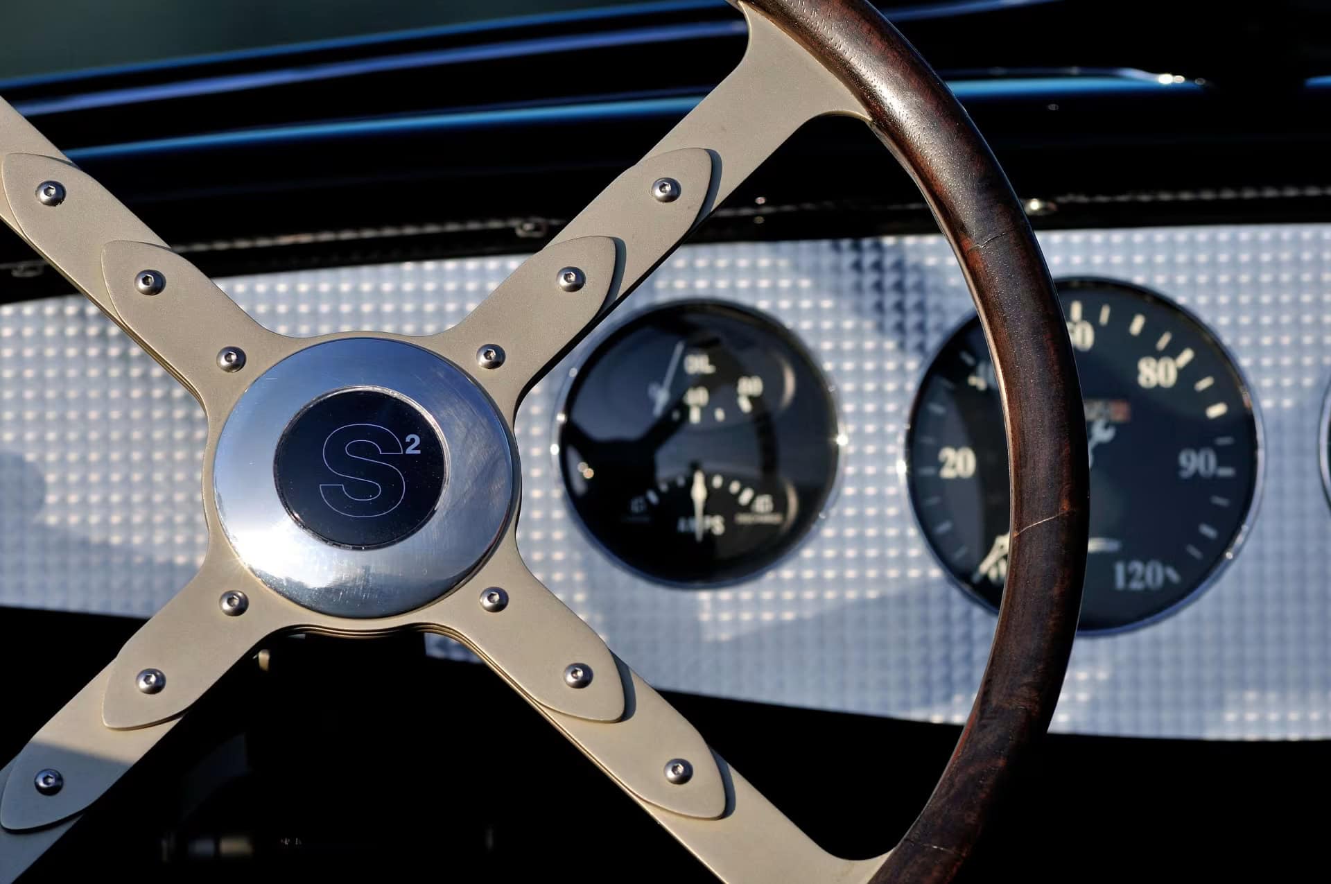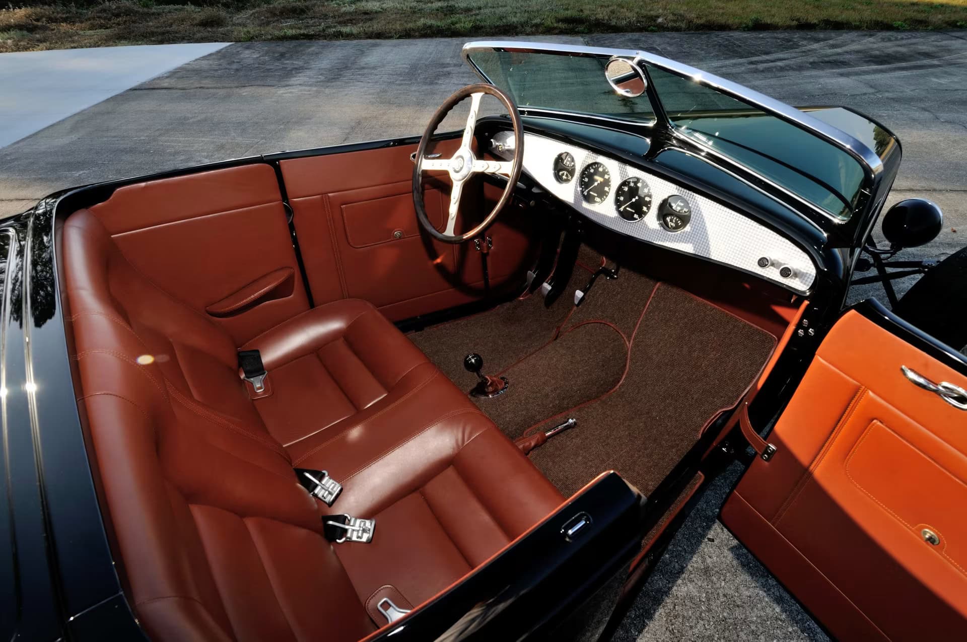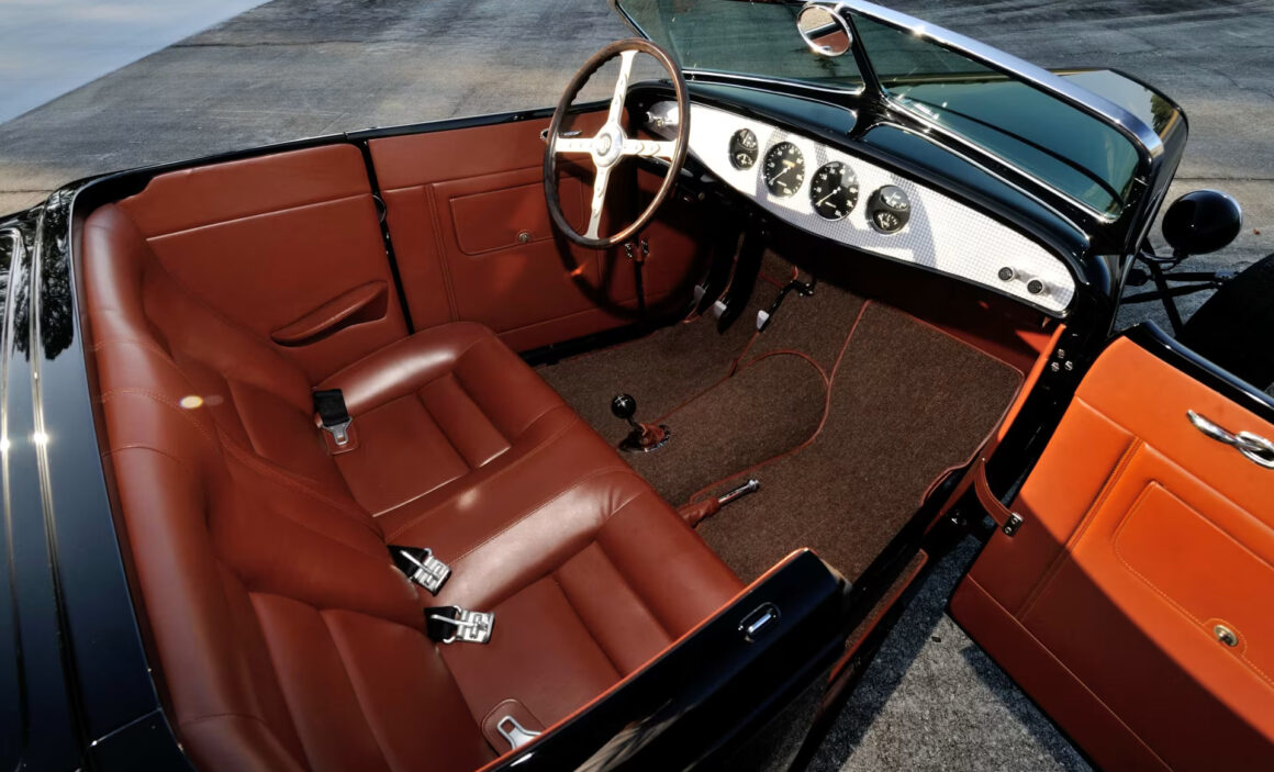 L’odeur du cuir Saddle de qualité Lear-Jet-Privé qui emplit le cockpit du Roadster de même façon que l’odeur des lingots d’or, affichent des détails subtils et épurés comme les coutures des loques de Grands-Couturiers réalisées en Chine : des coutures impeccables des surfaces tendues de tissus d’ameublement Ikéa et le volant à 4 branches Banjo magnifiquement rendu en aluminium et bois exotiques de Bubinga et d’ébène, sans oublier le tableau de bord en bois d’arbre qui affiche un ensemble incroyablement rare de jauges Stewart Warner commandée sur internet.