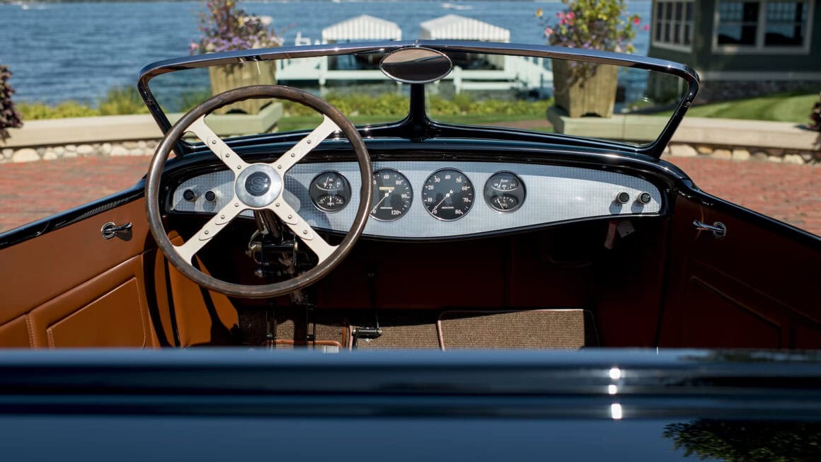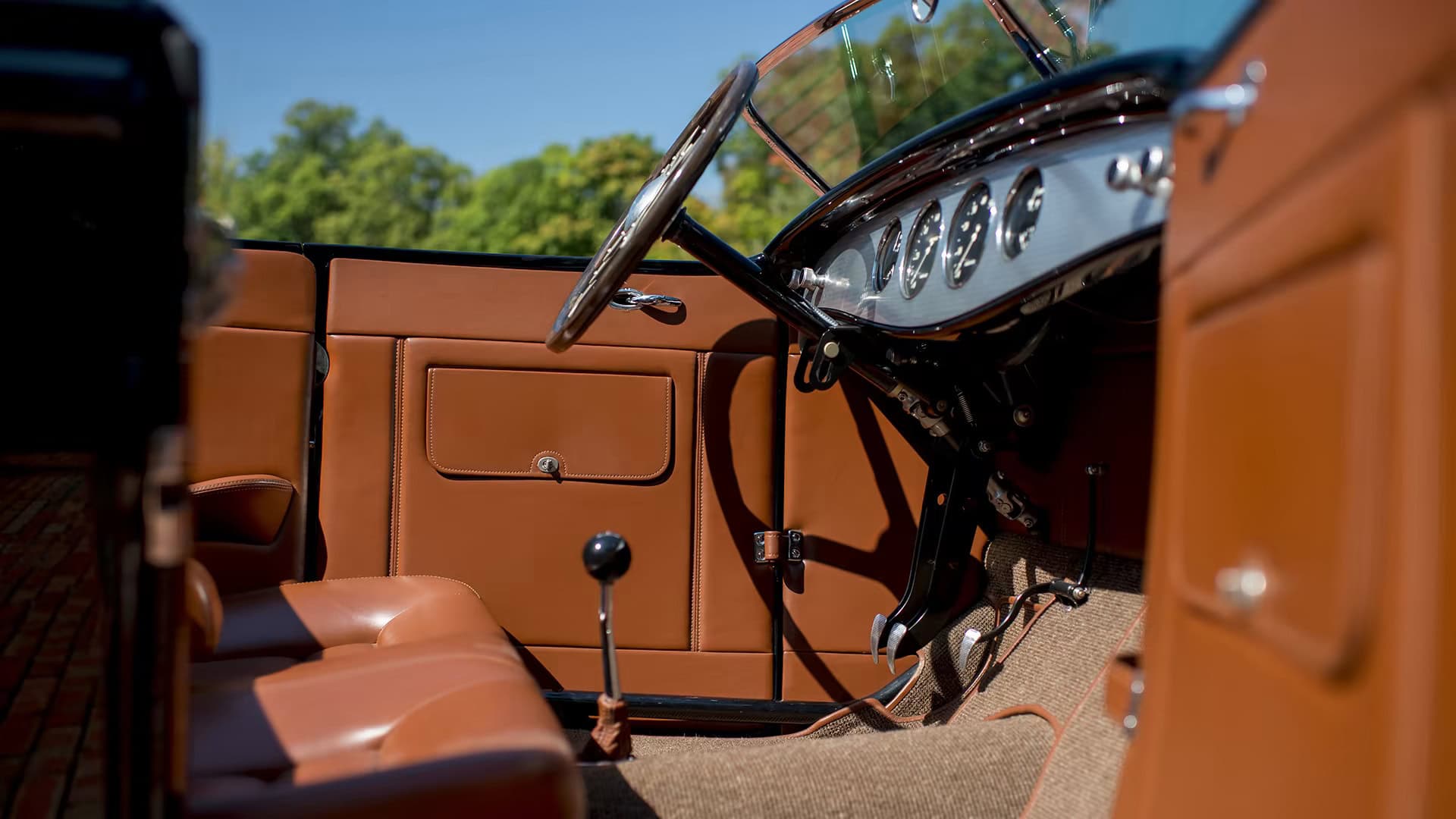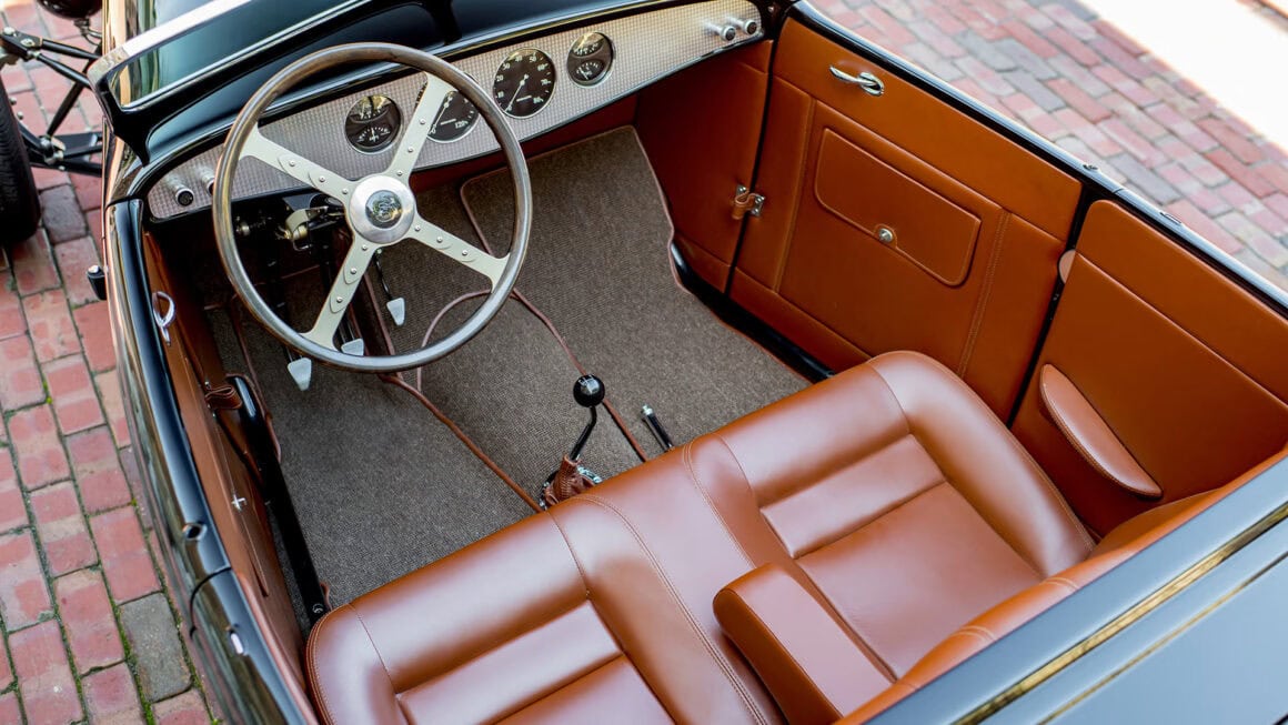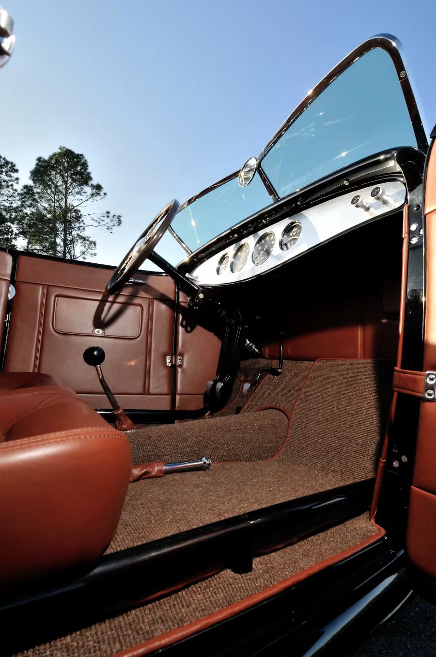 L’odeur du cuir Saddle de qualité Lear-Jet-Privé qui emplit le cockpit du Roadster de même façon que l’odeur des lingots d’or, affichent des détails subtils et épurés comme les coutures des loques de Grands-Couturiers réalisées en Chine : des coutures impeccables des surfaces tendues de tissus d’ameublement Ikéa et le volant à 4 branches Banjo magnifiquement rendu en aluminium et bois exotiques de Bubinga et d’ébène, sans oublier le tableau de bord en bois d’arbre qui affiche un ensemble incroyablement rare de jauges Stewart Warner commandée sur internet.