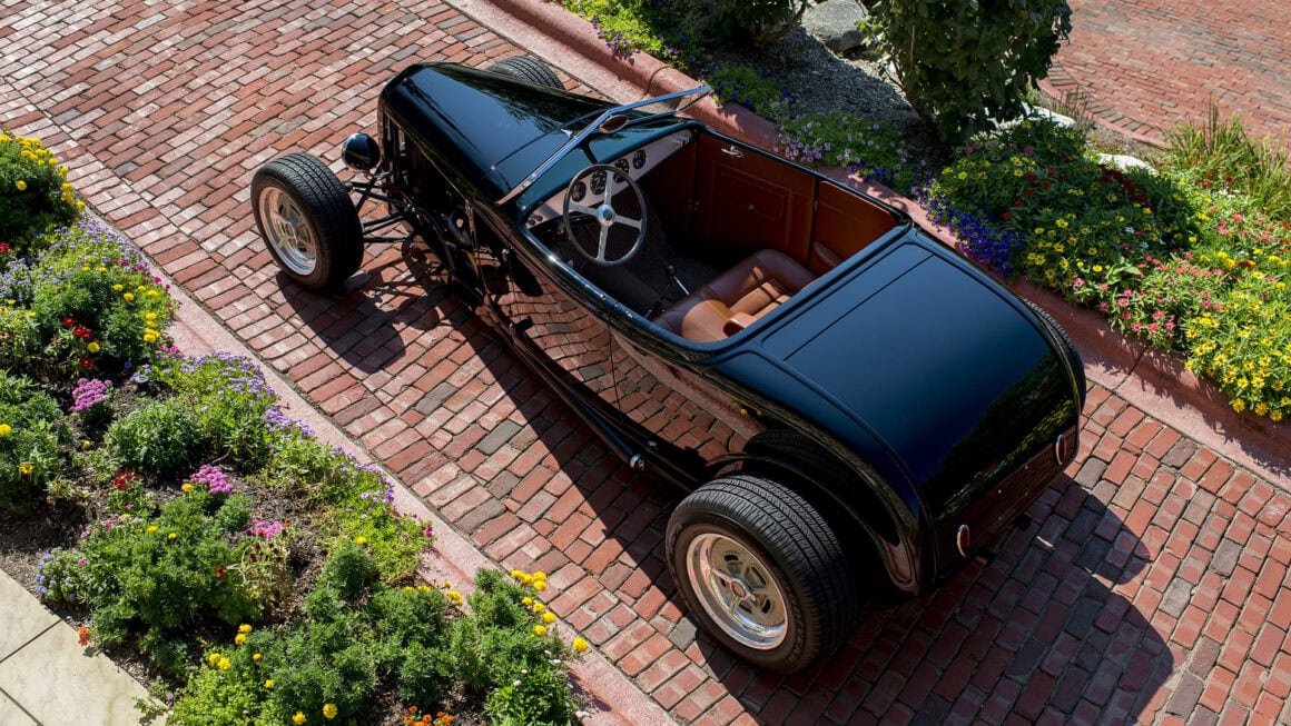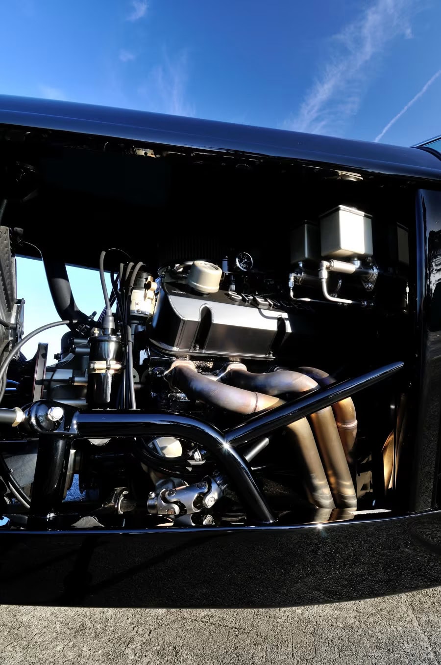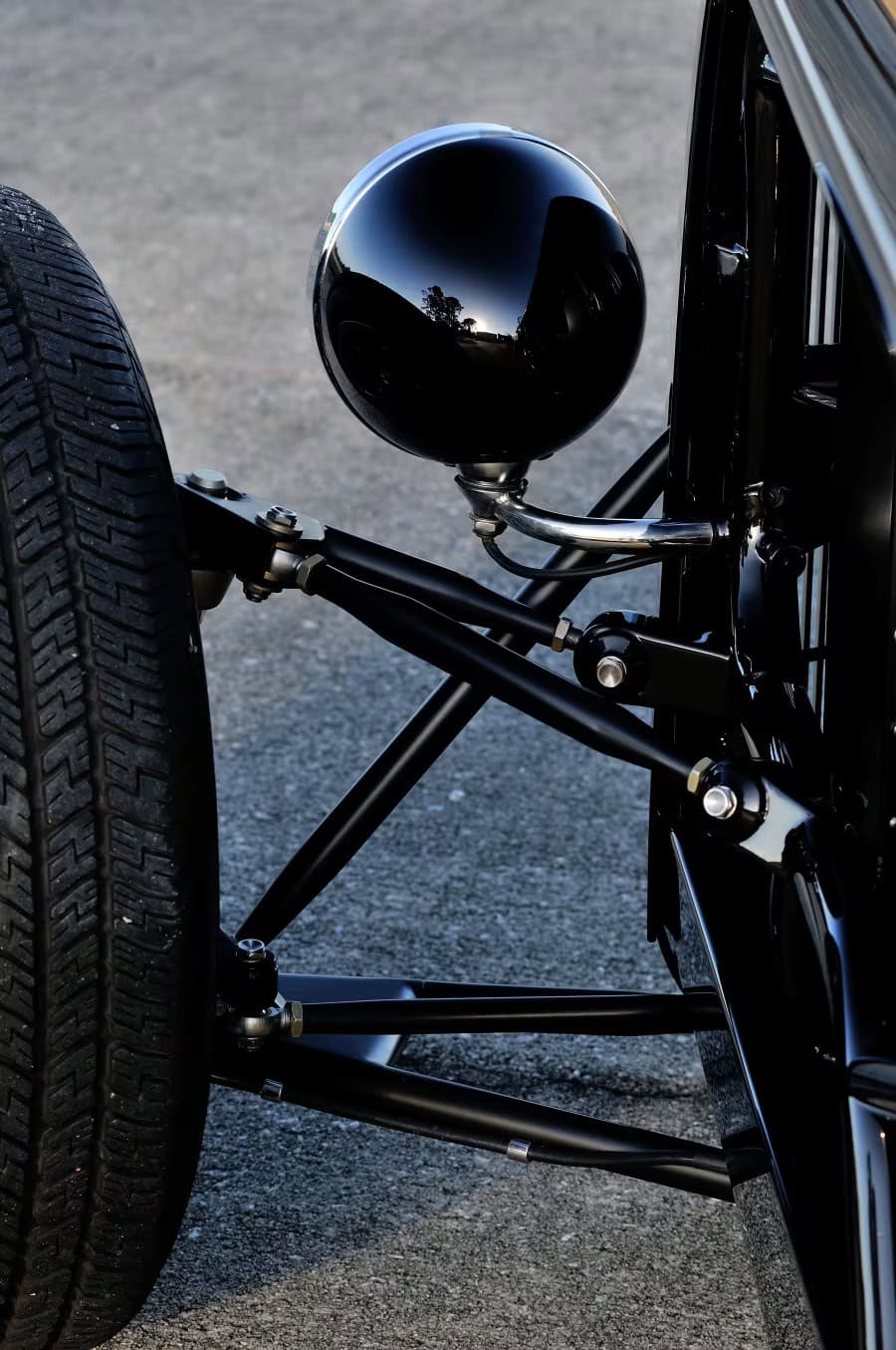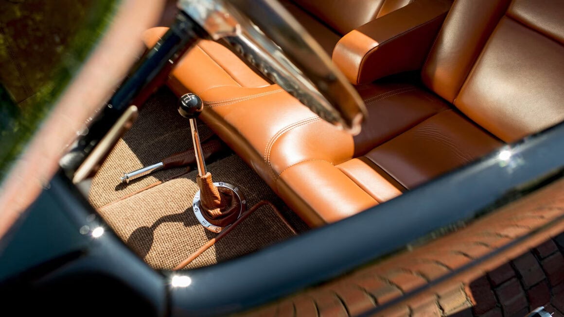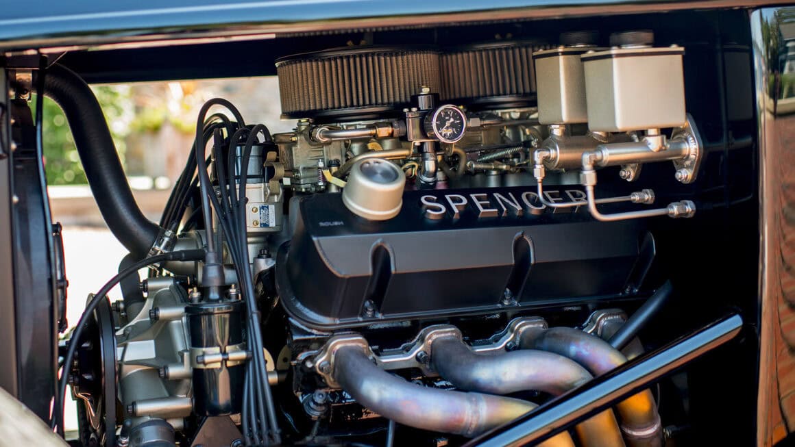 Les collecteurs en acier inoxydable issus du moteur Roush 289ci/405cv testé au banc d’essai portent toujours leurs cordons de soudure ; Les biellettes de direction forgées à la main et la suspension avant indépendante sont montées devant le radiateur pour un moment polaire minimal, et des écopes personnalisées dirigent l’air frais vers les roulements du moyeu arrière qui n’en ont aucun besoin… Les nombreux détails orientés vers la course alors que ce n’est pas une McLaren ou une Ferrari de piste de course, invitent à des heures de contemplation….
