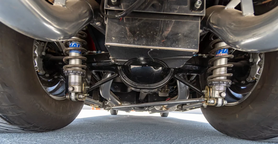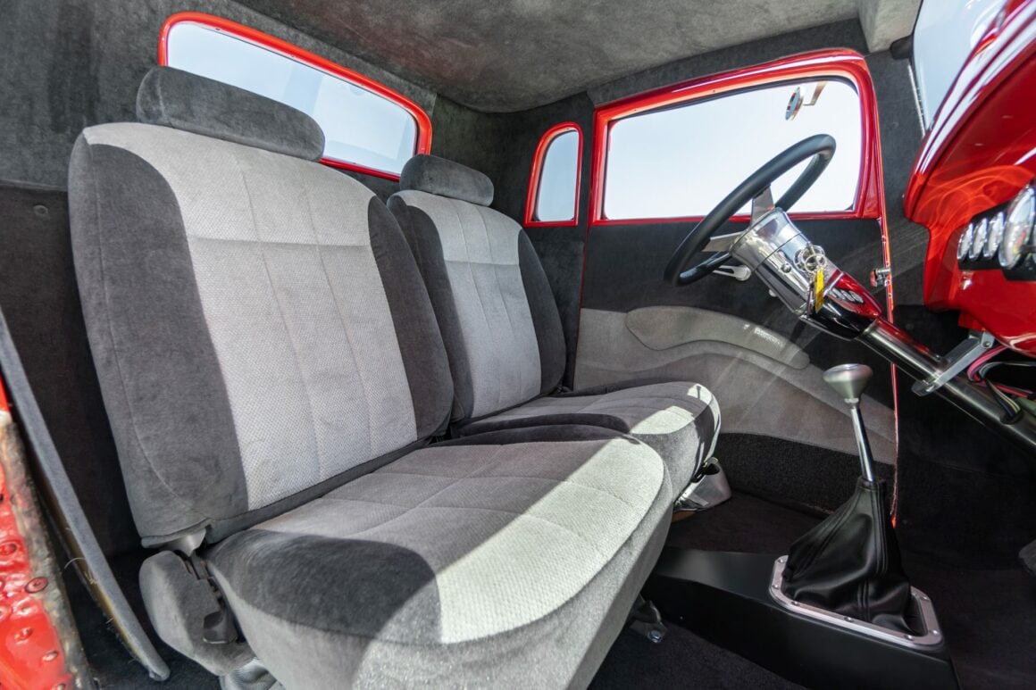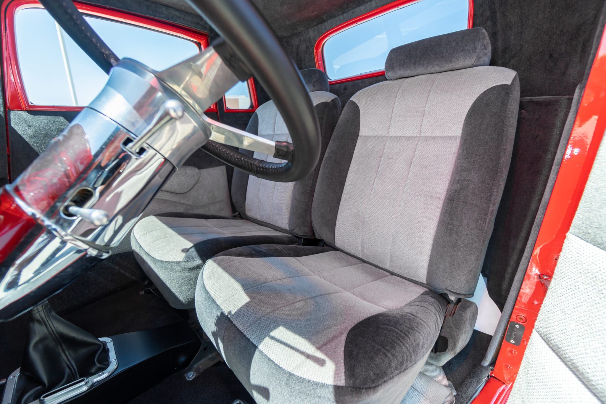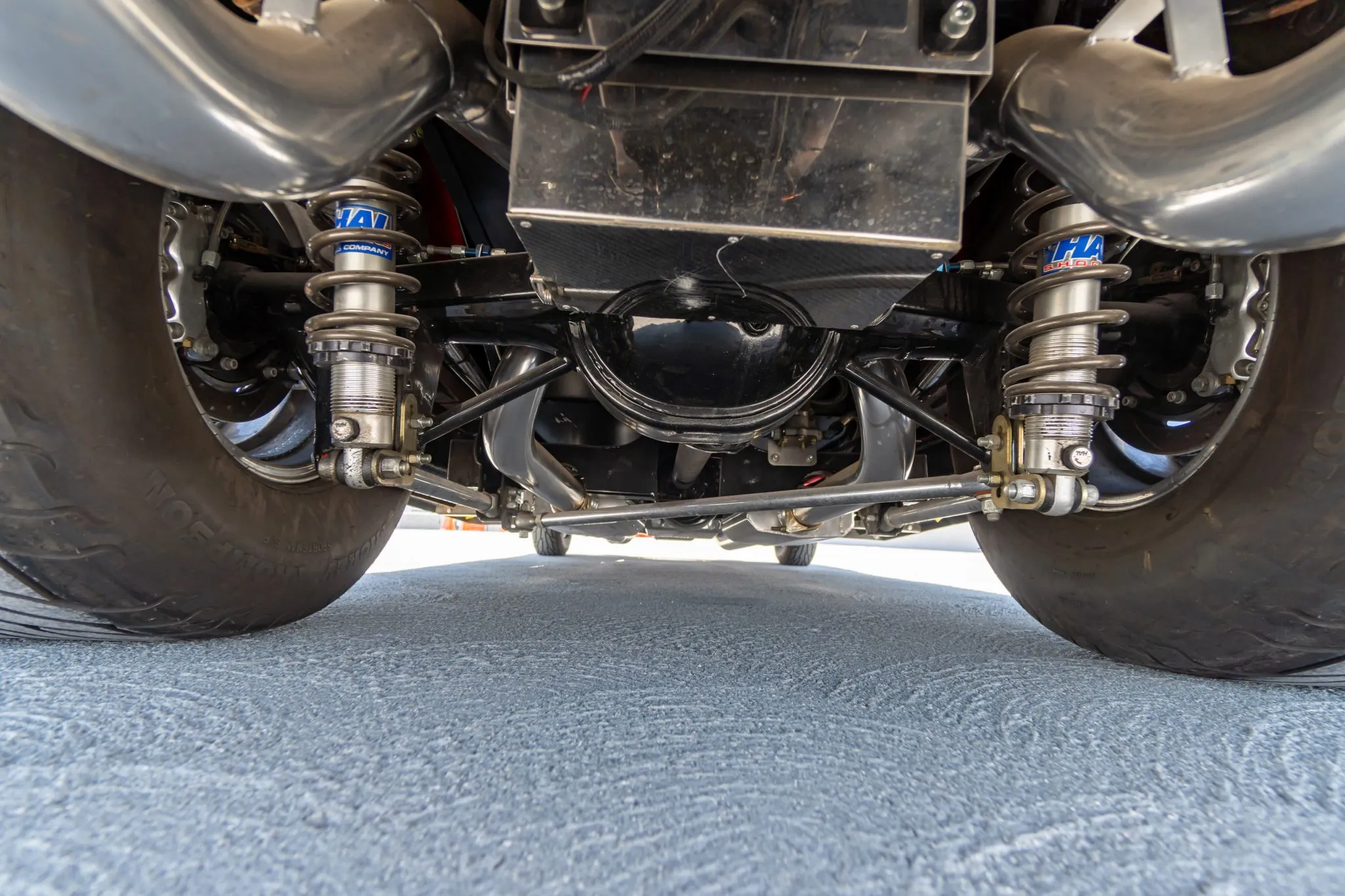 En même temps on a refermé l’extrémité supérieure du moteur, installé un levier de vitesses Lokar et retapissé l’intérieur. Ce dernier est doté de sièges baquets, d’une colonne de direction inclinable et de compteurs AutoMeter. Les portes à charnières inversées ont des loquets de style Bear-Claw. Les jantes de 15po à cinq rayons sont montées avec des pneus Mickey Thompson Sportsman S/R de 26×6po avant et 31×16po arrière. Des combinés filetés réglables sont installés aux quatre coins. Le freinage est assuré par des disques Wilwood assistés.