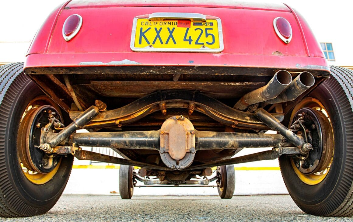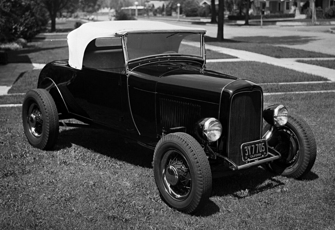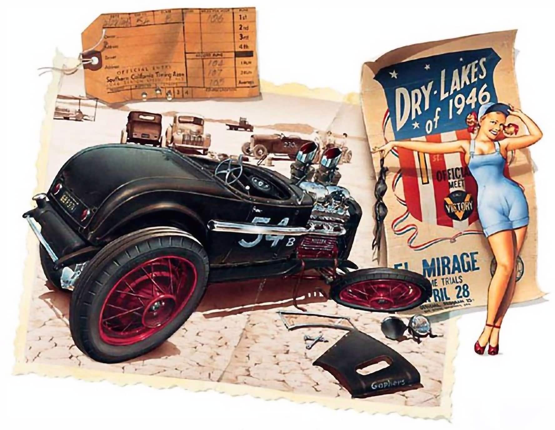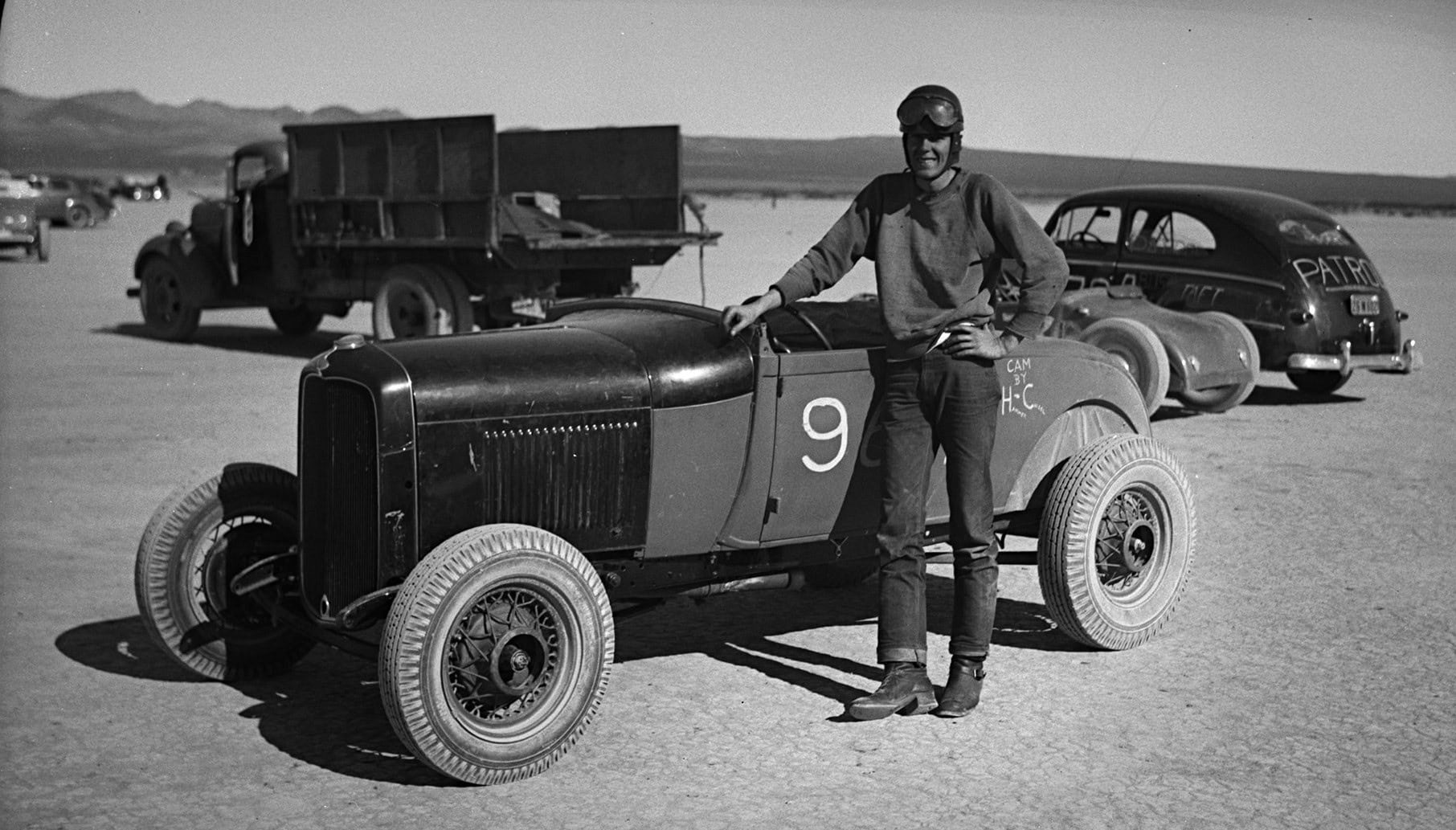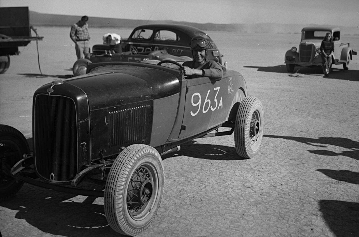 Le système de castes du lycée de l’époque stipulait en effet que vous n’étiez rien jusqu’à ce que vous soyez en dernière année, mais cela ne prévalait pas parmi les Hot Rodders. Pomona n’avait pas de club de roadster à l’époque, alors Tom et un ami, Jack Clifford, sont devenus membres du club automobile Velociteers de Pasadena et étaient leurs représentants locaux dans la région de Pomona… “Bill suivait les autres gars de Pomona lorsque Tom et Jack organisaient des rencontres Russetta à El Mirage. Nous voulions être là quand il courait à 100mph. Les habitants avaient une façon de décrire le travail manuel sur les Hot Rods de Tom et Bud ; C’était construit par Tom ou construit par Bud. S’il avait été construit par Tom, vous ne le trouveriez nulle part ailleurs”… Les photos de la famille de Tom montrent les débuts du roadster : un châssis en construction et une carrosserie nue remorquée derrière le coupé Modèle A Flathead de Tom. Comme le roadster lui-même, l’histoire derrière sa construction survit dans les années 1950, via un article de magazine que Tom a écrit en 1953. Tom a construit la voiture sur un châssis de ’29. Tom a couru à El Mirage de 1949 à 1952, et il a emmené la voiture à Bonneville en 1953.