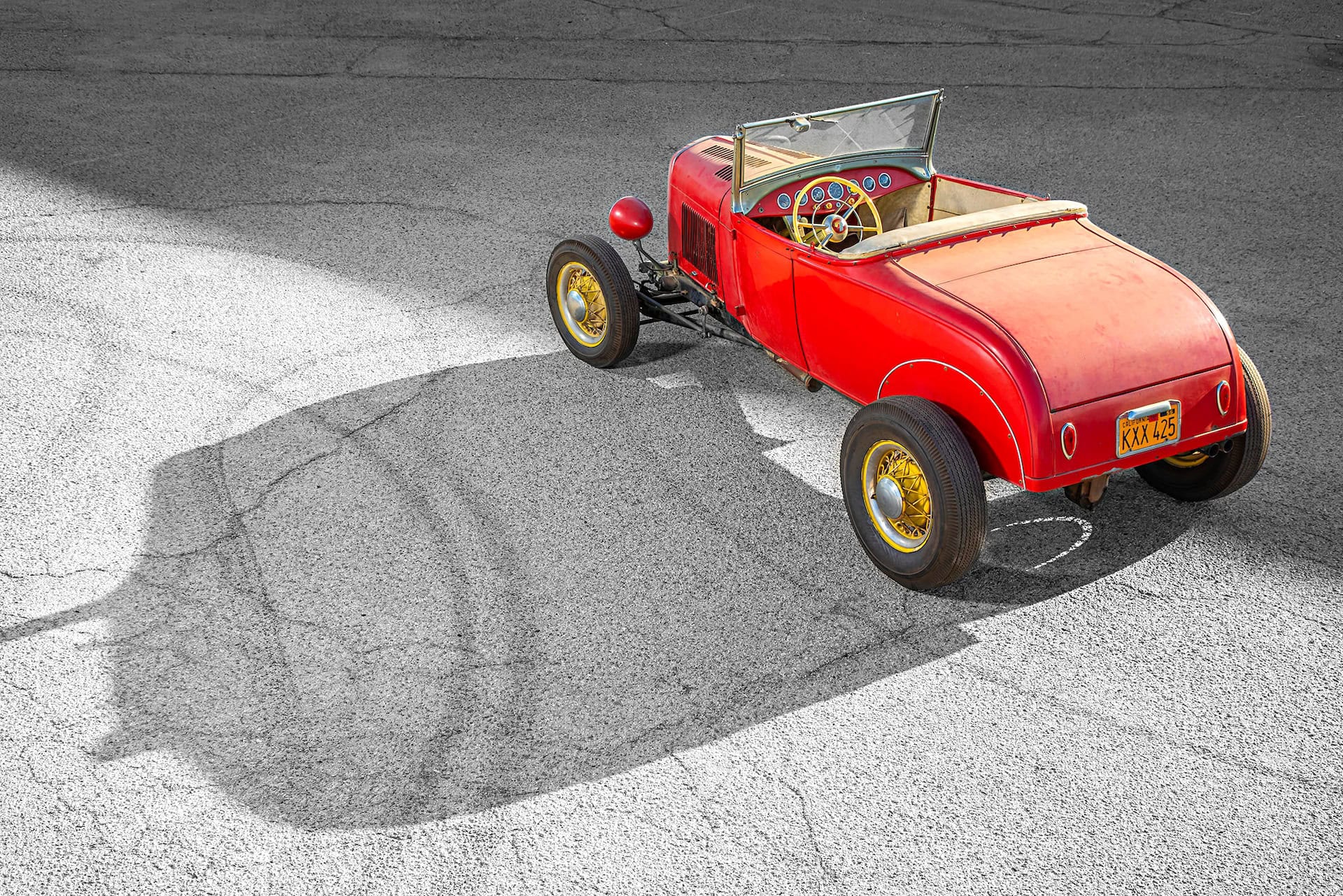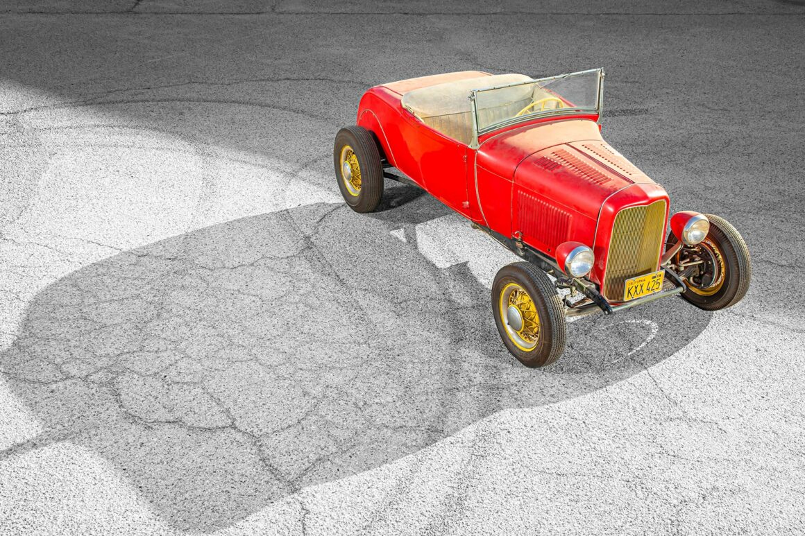 J’en reviens donc au Hot Rod rouge stationné dans un espace, parking ou autre, qu’importe… Il s’agit de prendre référence et acte que ce Hot Rod dont les deux photos le présentant sur un espace, s’il est effectivement sur cet espace et que la qualité des dites photos démontre qu’elles ne datent pas de 1949…