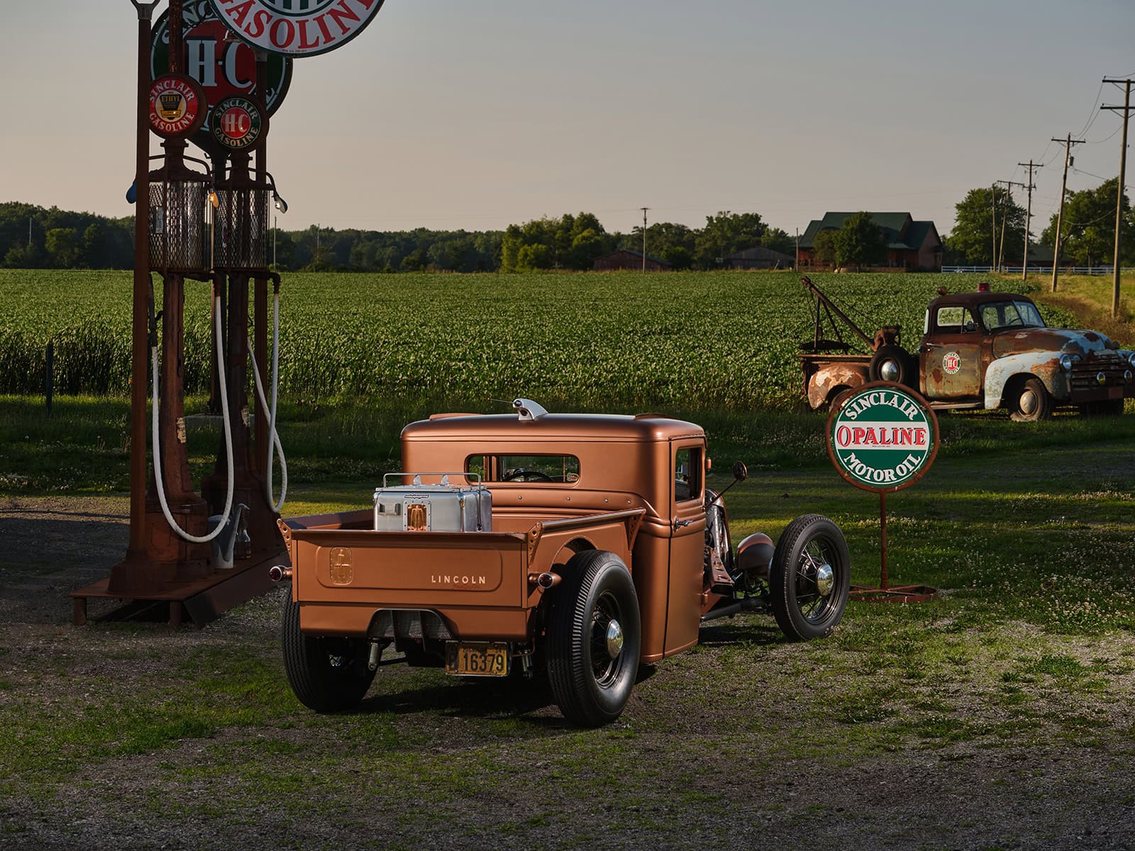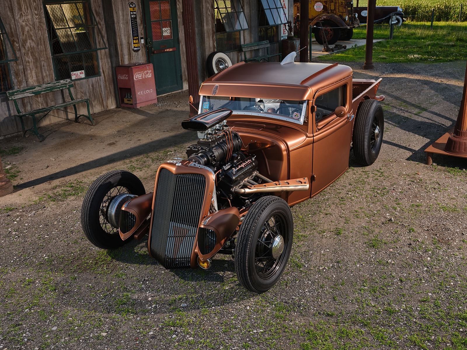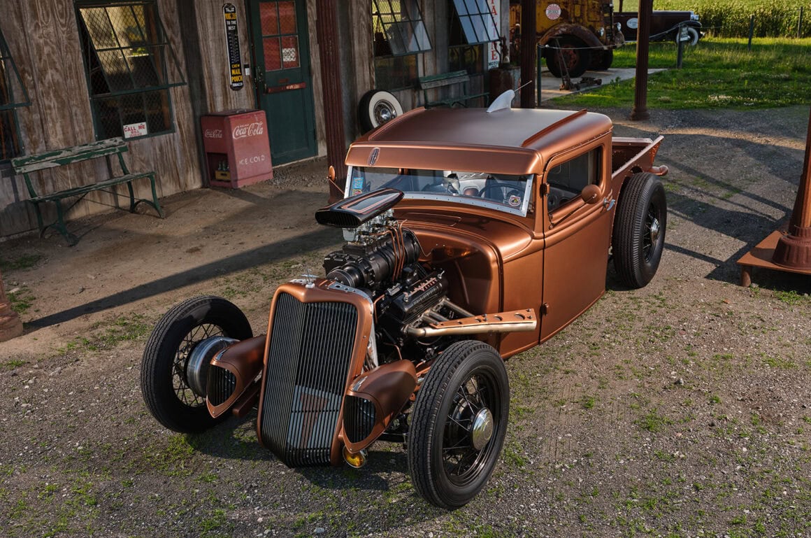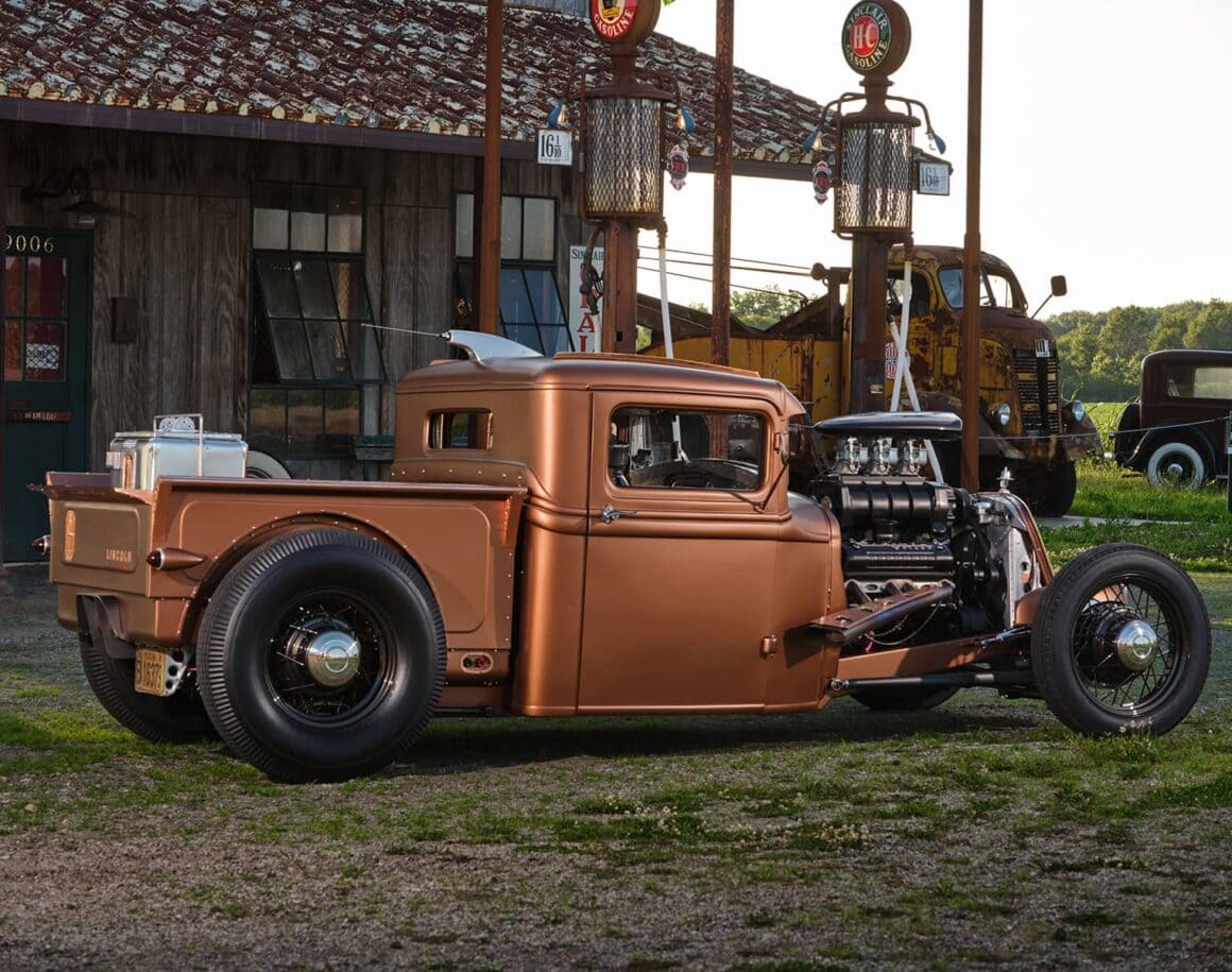 On vient rêver chez Chomes/Gatsby en parcourant/survolant mes 4.500 articles en pestant des longues explications/descriptions techniques “à l’américaine” dont quasi plus personne n’en éprouve le moindre intérêt. Ce qui reste en contenu, de la presse y consacrée aux USA, c’est justement d’avoir des explications techniques infinies… Cela crée un dilemme, d’autant plus dérangeant dans ma tête, que j’aime me laisser aller dans l’écriture philosophique teintée d’humour… Autant écrire/dire qu’une fois mort ou devenu incapable d’assumer cela, il ne vous restera que des souvenirs entre vieux copains qui se verront peu à peu mourir… Ce qui me sauve, provisoirement, c’est que je n’en ai plus rien à foutre de quoi que ce soit… Voilà, c’était une explication en billet d’humeur plutôt que d’humour… Le Hot Rod pick-up Lincoln 1934 de Bill Dinges est un savoir-faire artisanal en mouvement, avec un travail du métal talentueux. De par leur nature même, les Hot Rods sont uniques. Parfois, nous devenons blasés parce que nous voyons plus que notre part de ces voitures.