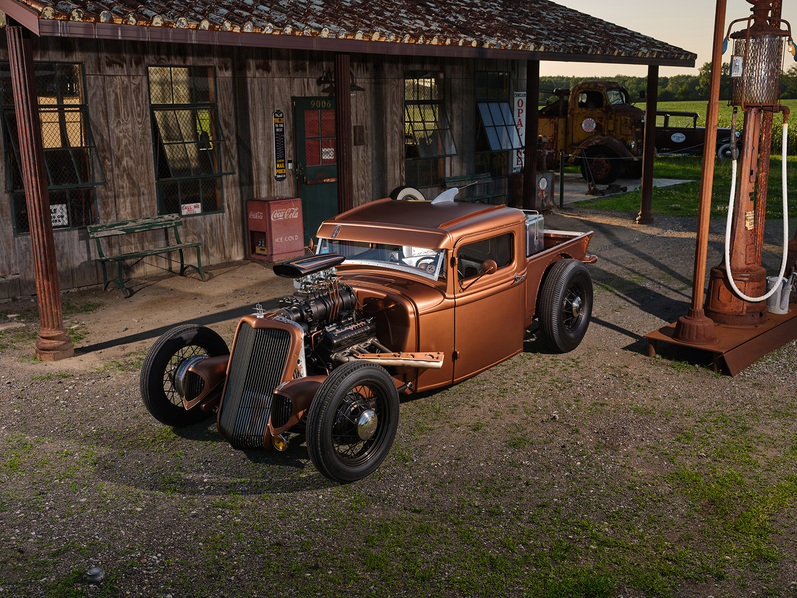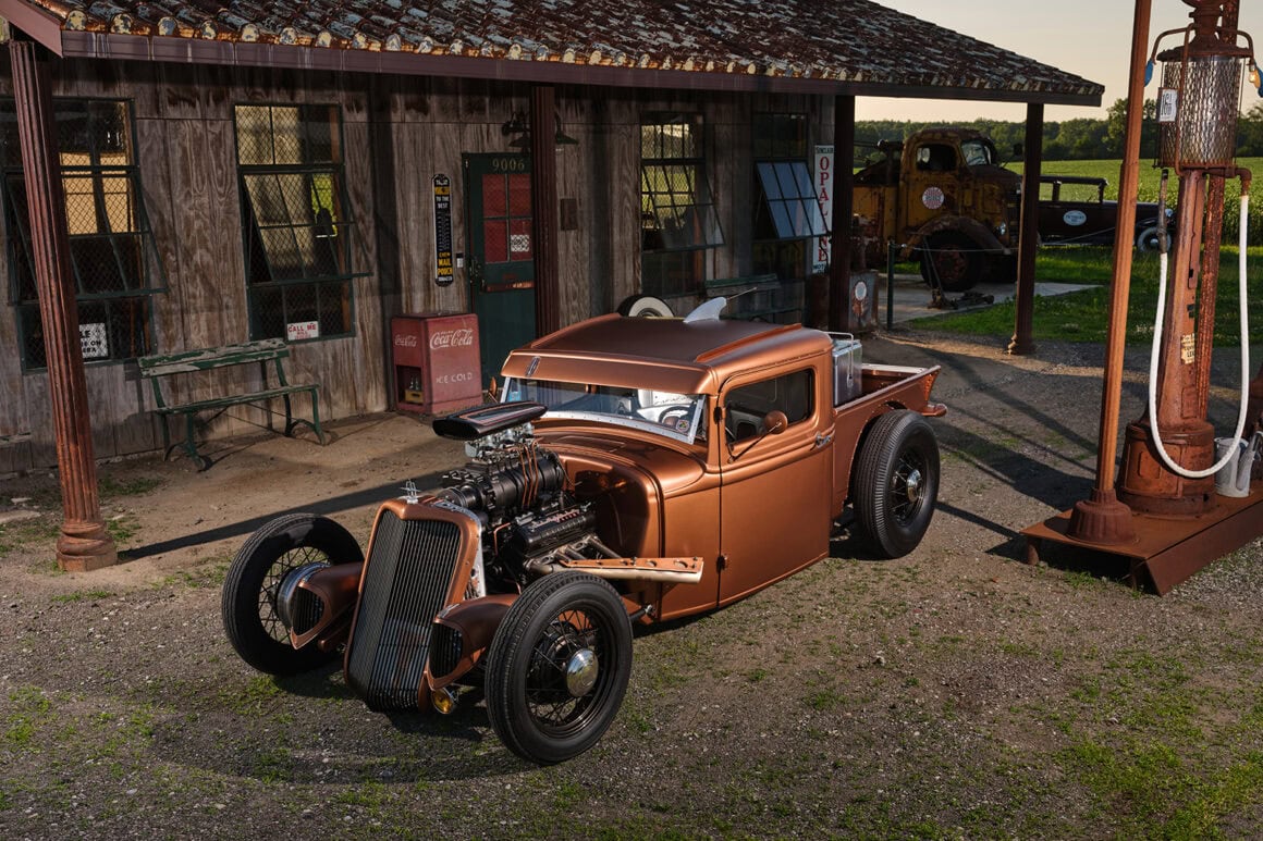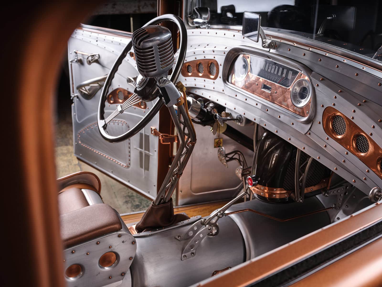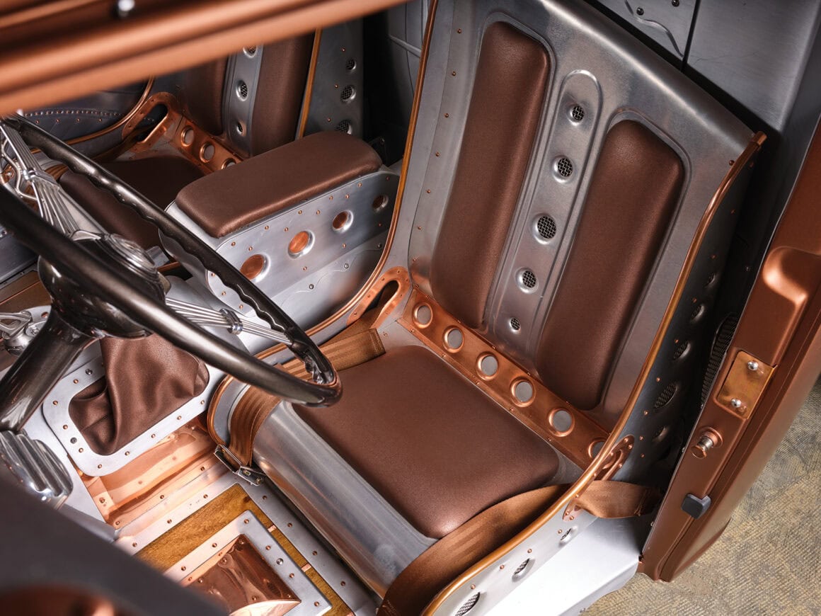 Il l’a réinventée à neuf. Il l’utilise pour garder des produits de nettoyage et autres… mais il fonctionne toujours comme une glacière… Avec les obus de feux avant et arrière de la Studebaker de 38, les supports d’éclairage eux-mêmes sont davantage l’œuvre de Bill. D’autres ferronneries martelées par ses soins sont visibles dans la calandre de la voiture de tourisme Ford 35 qui a été coupée, puis il a fabriqué les barres de calandre individuelles. La carrosserie a été gérée par l’équipe de l’U.S. 12, tandis que le mélange de cuivre personnalisé BASF avec un transparent satiné a été pulvérisé sur la tôle par Brett Miller. Tout au long de la construction, ce ne seront que des centaines de feuilles, caches et lettres en cuivre, toutes posées par Bill. À l’intérieur, il y a le groupe d’instruments distinctif de la Ford Falcon 62 avec des jauges d’origine intégrées dans le tableau de bord en aluminium fabriqué accentué de rivets en cuivre. Donnant vie aux jauges, ainsi qu’à tous les autres composants électriques, est le kit “American Autowire” câblé par Todd Burks.