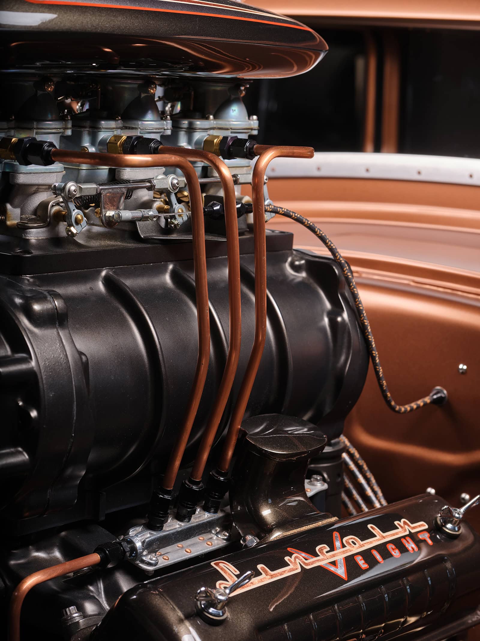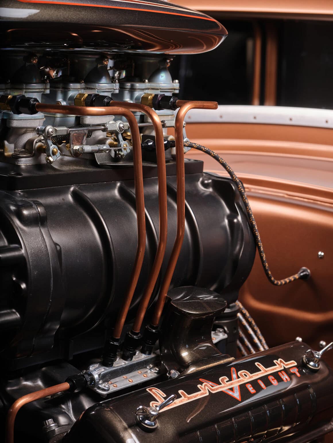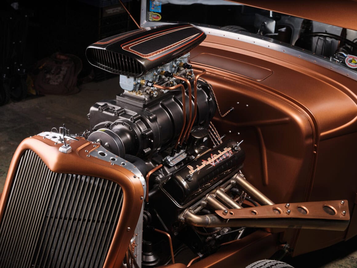 À cela, du caoutchouc Coker Excelsior a été ajouté en 4,50 à l’avant et Coker Firestone Deluxe 7,50 à l’arrière. La puissance provient d’un bloc Y Ford’62 éprouvé déplaçant 292ci sur la base d’un bloc qui a été rectifié en douceur avec le travail géré par Gouger Racing Engines. À partir de là, le bloc a été rempli de pistons 9:1, d’une came Isky et d’un trio de carburateurs Speedway Motors Super7 reposant sur un très rare “Sneaky Pete Robinson” et un Blower “Ohio George Montgomery 6-71” assemblé par le Darren de “Darren Mayer Performance Engineering”, car son atelier est spécialisé dans tout ce qui concerne les Blowers. Le filtre à air est en aluminium personnalisé par Bill. L’allumage est un lance-flammes PerTronix avec des fils de prise vintage (en tissu). Les couvercles de soupapes sont des blocs en Y d’usine, mais ont été lettrés par Bill pour donner l’illusion de cache-culbuteurs Lincoln V-8. L’échappement est basé sur des tubes en acier inoxydable de 1-3/8 pouce avec un bouclier thermique externe en cuivre boulonné aux collecteurs.