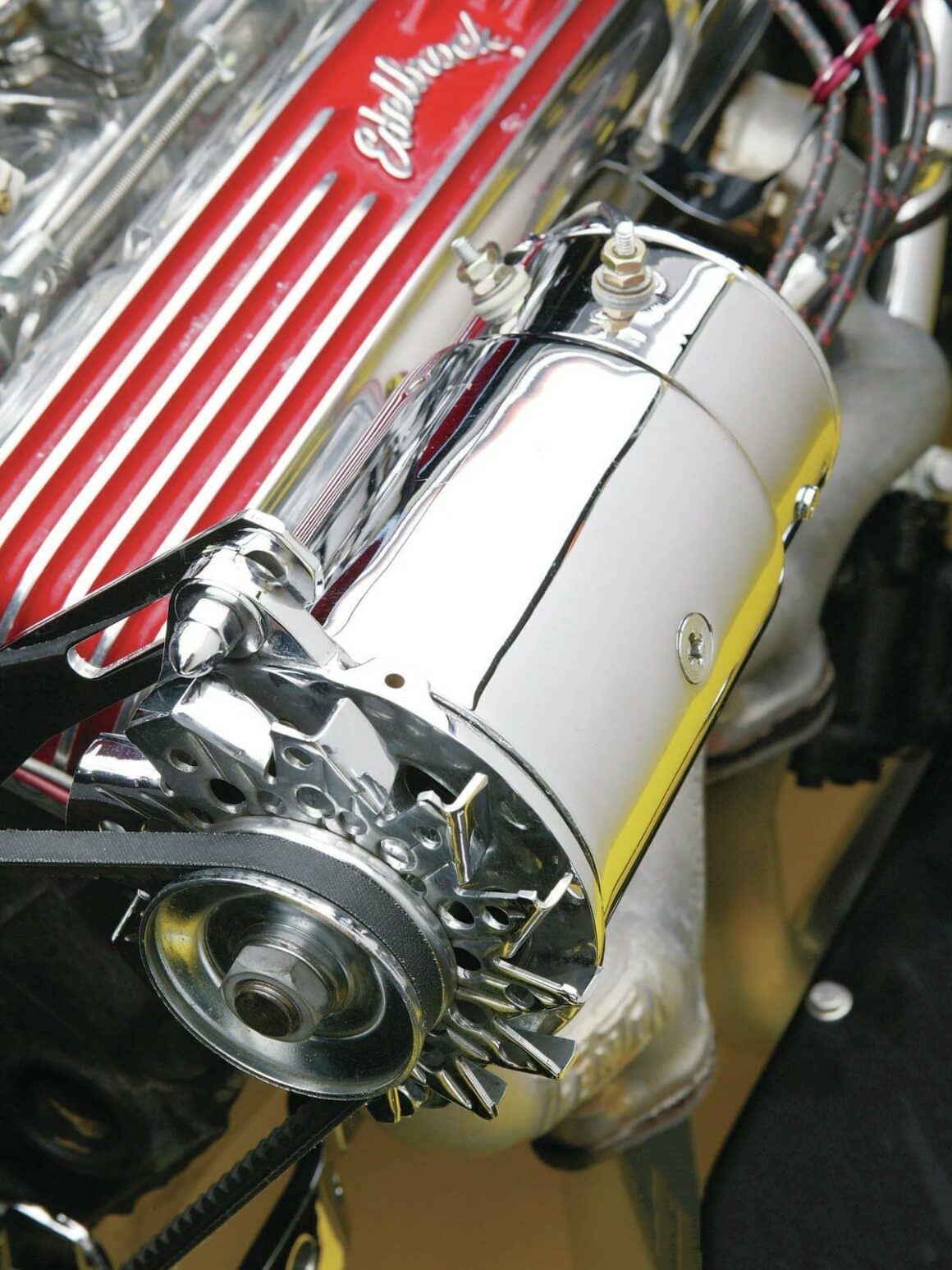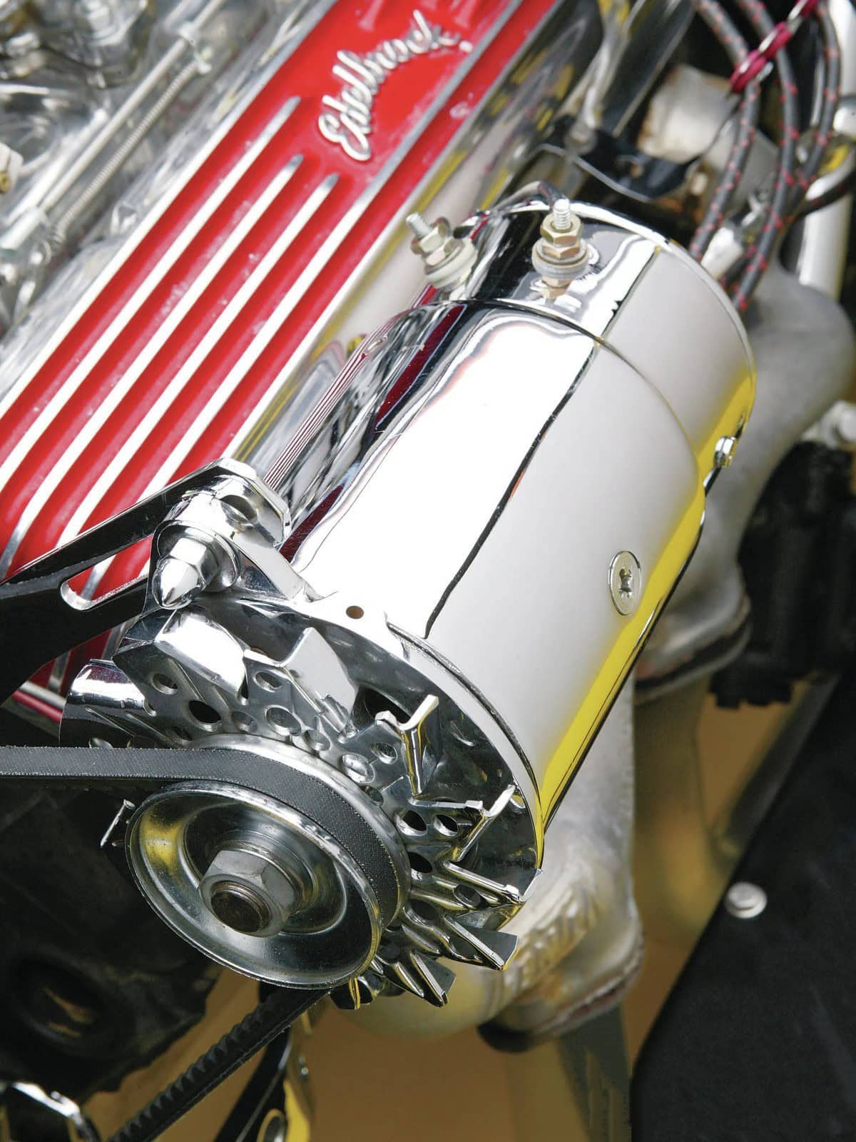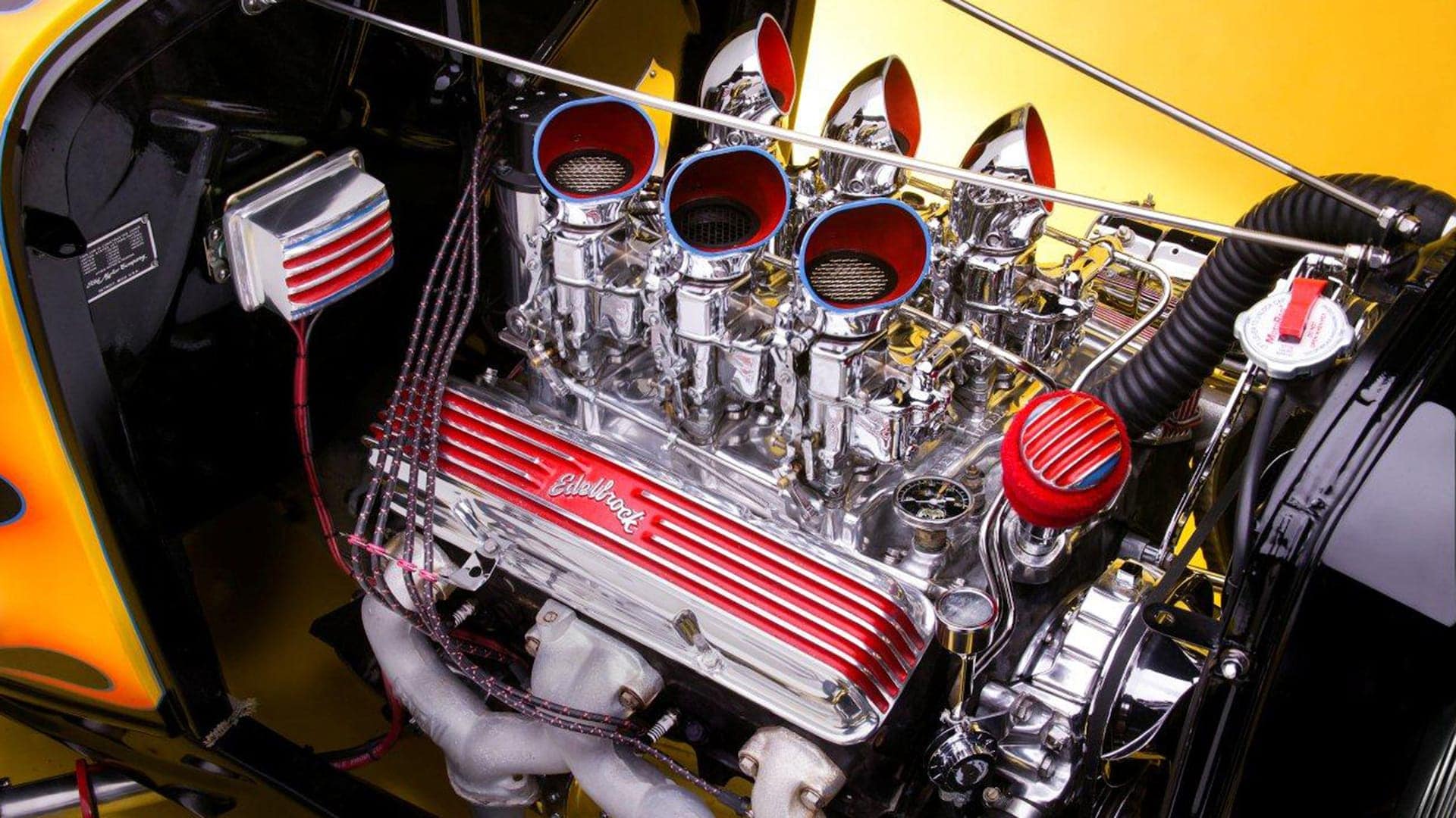 Ils sont combinés avec les ressorts à lames Deuce d’origine. Les pneus Firestone à carcasse diagonale 7.50-16 et 6.00-16, ont des flancs blancs “croûtes à tarte”… Elles chaussent des jantes Ford steelies de 16 po peintes en rouge avec des capuchons chromés. Les freins sont une combinaison de tambours arrière Ford 40 de 9po et de tambours à ailettes Buick à l’avant. Avec un maître-cylindre Corvette de modèle récent et une soupape de dosage, il n’y a aucun problème à s’arrêter. Une prise d’air Offy et six Holley 94 chromés avec des écopes en gueule de grenouille surmontent le bloc V8 Chevy 350ci, usiné chez Champion Auto et assemblé par Buddy. Une magnéto Joe Hunt, des fils en tissu, des en-têtes Fenton, perpétuent le style de la vieille école.