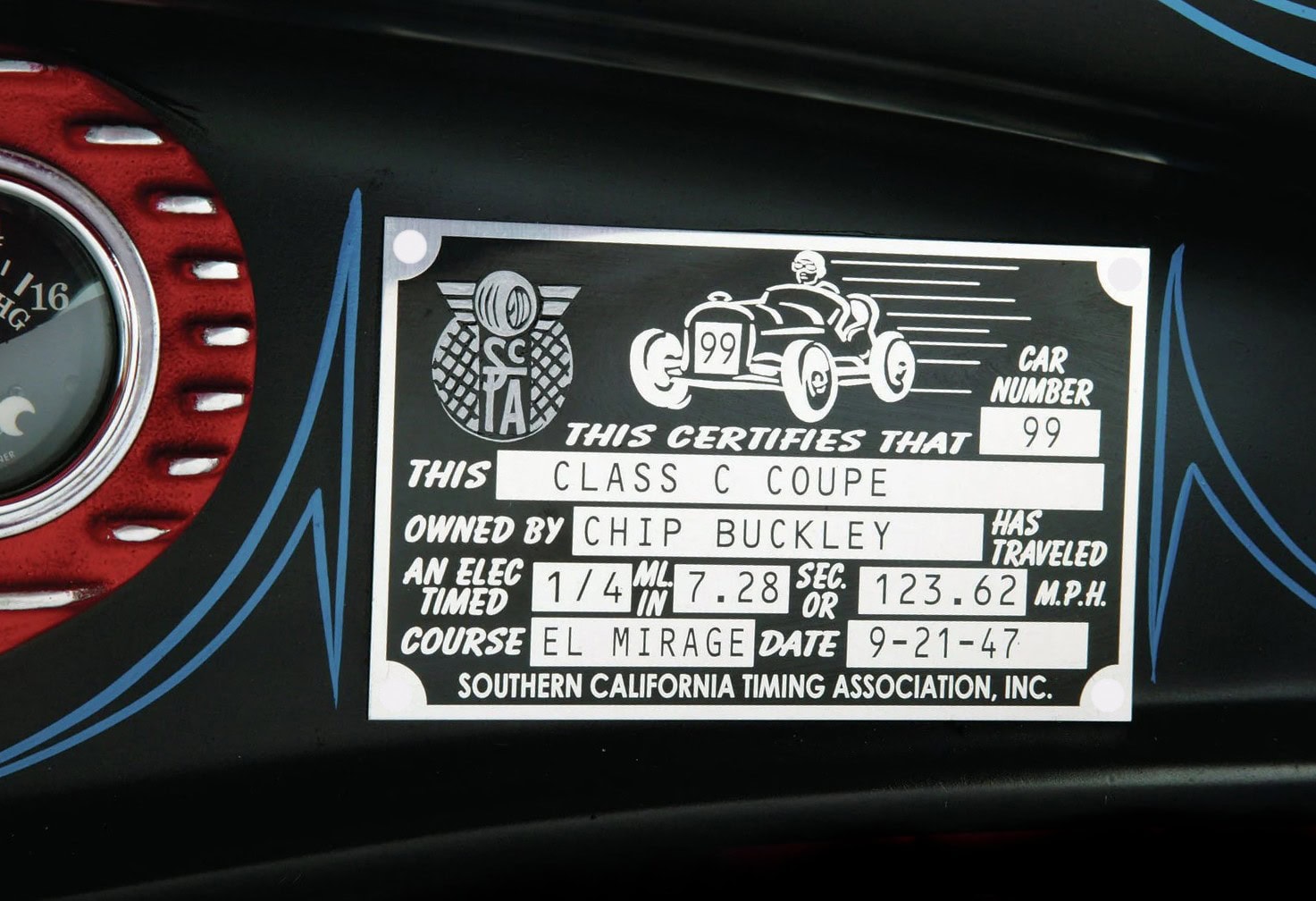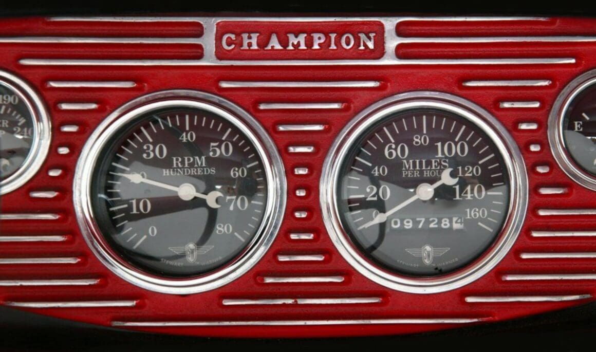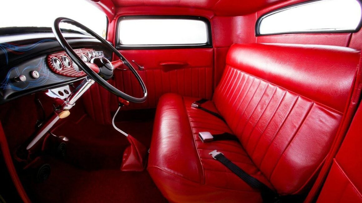 Une boîte de vitesses Muncie à quatre vitesses M22 “rockcrusher” de 1968 (favorite des années ’60), a été assemblée par Bill Salis à Long Beach en Californie, à l’aide d’un embrayage Centerforce et d’un volant d’inertie en aluminium qui travaille derrière le moteur. Chip a chargé Mike’s Auto Tops & Upholstery à Mission Viejo de s’occuper de l’intérieur. La banquette de chez Glide Engineering est recouverte de vinyle tuck ‘n’ roll rouge vif. Les compteurs Stewart-Warner Wings sont logés dans un insert du tableau de bord Champion. Un levier de vitesses Hurst agite la boite Muncie. Le volant et la colonne sont des pièces Ford 1940 récupérées dans une casse spécialisée en vieilleries.