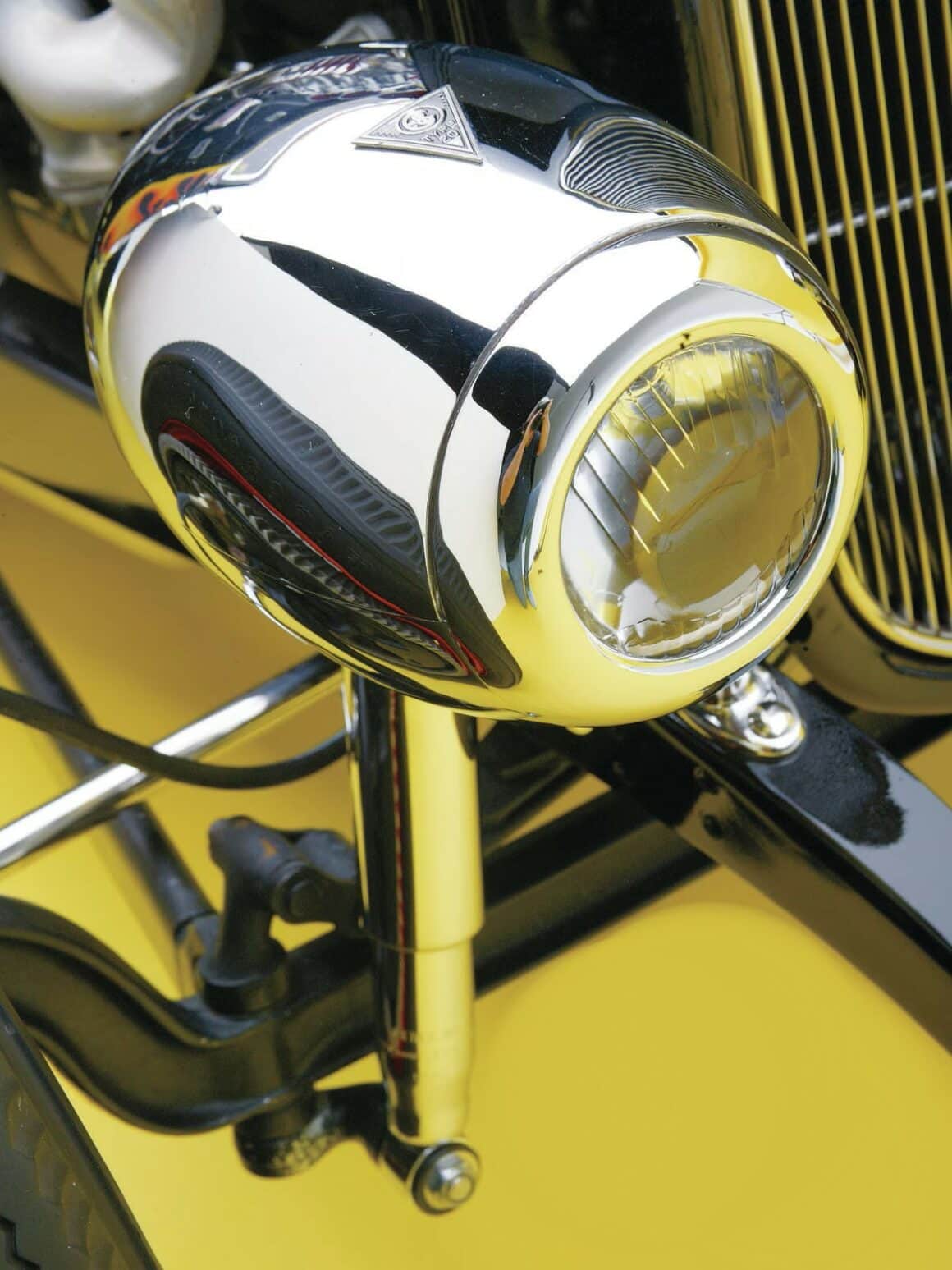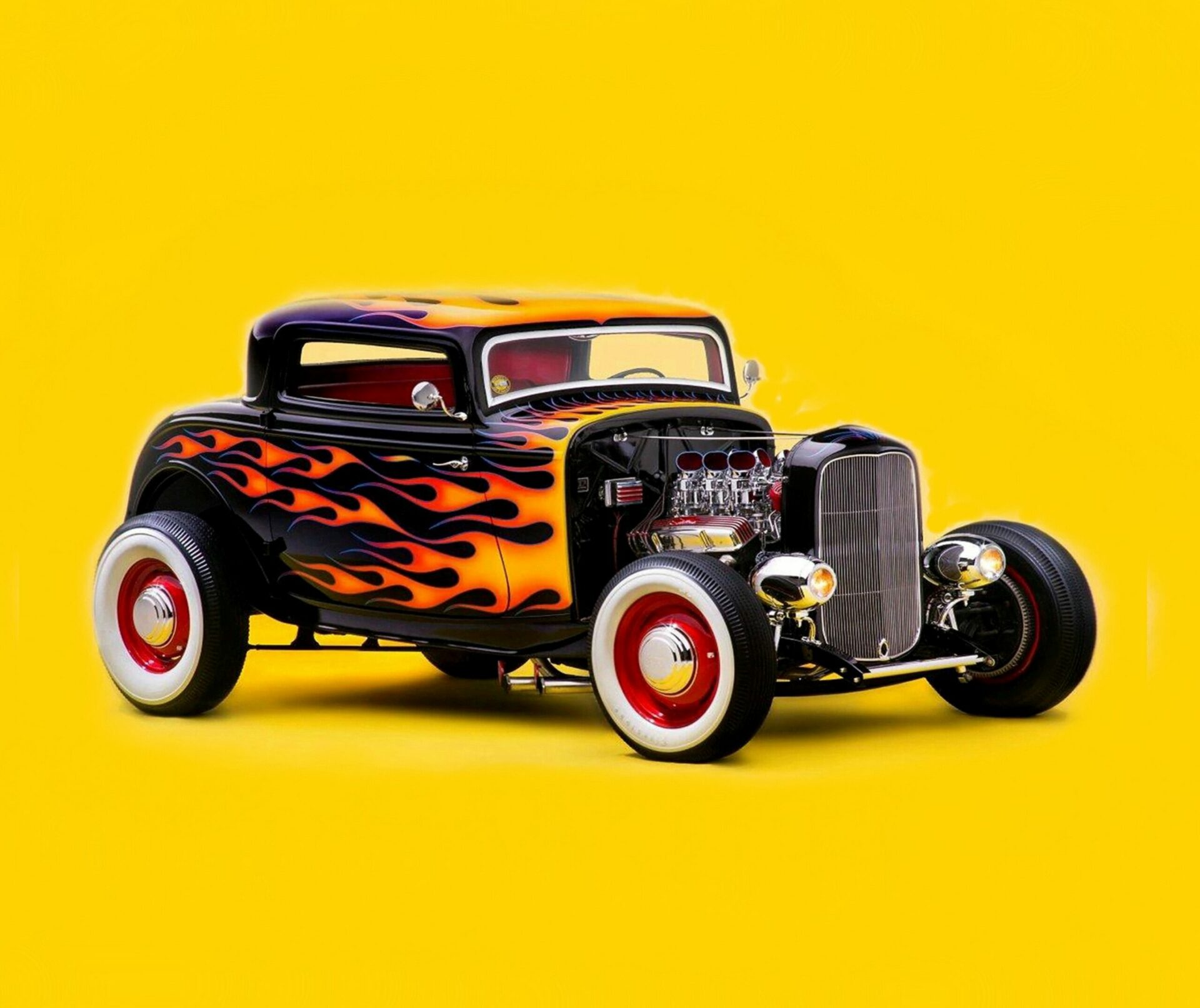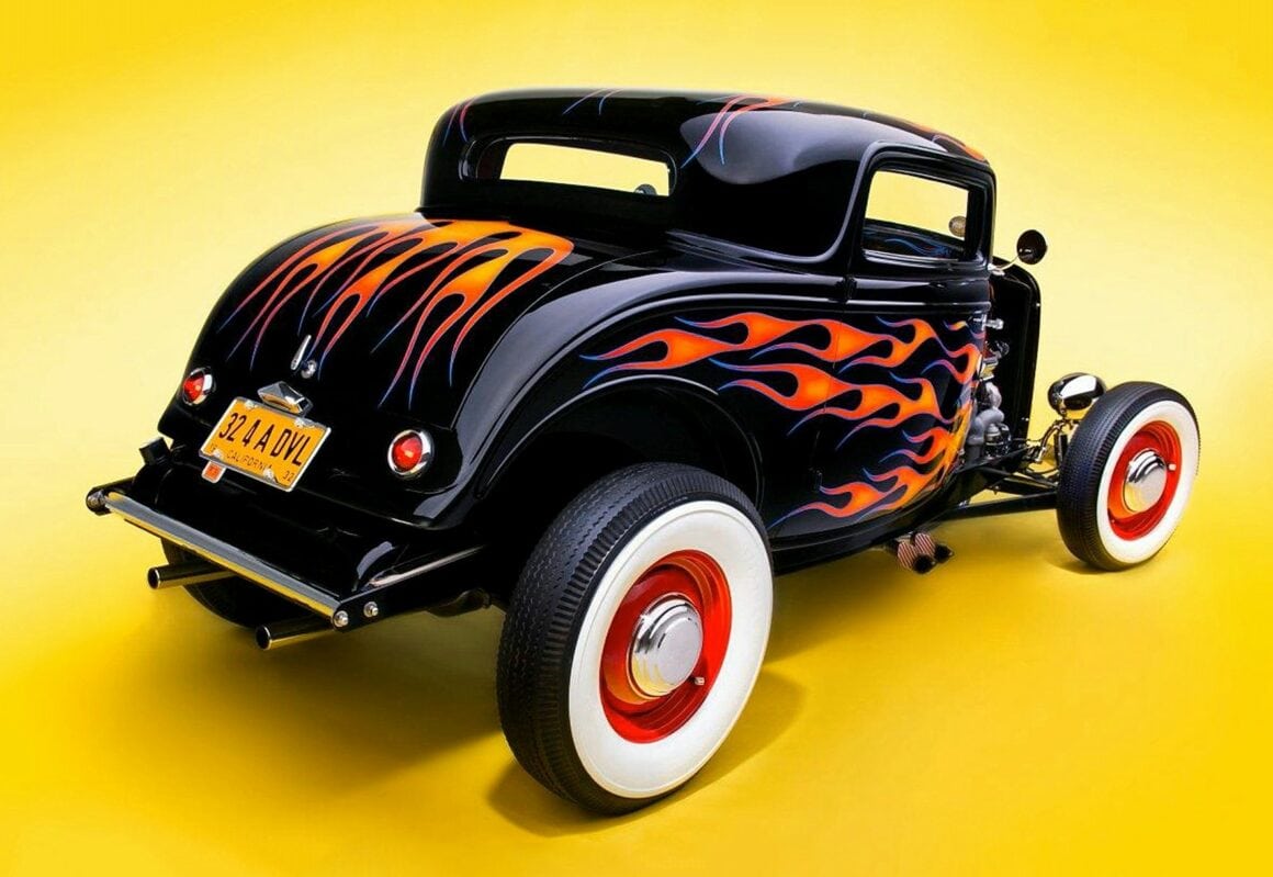 J’en reviens au Hot Rodding, vous signalant que tout ce qui précède, si c’est en projet, n’est pas encore d’application, raison pour laquelle vous devriez vous précipiter dans le Hot Rodding même s’il est rendu complexe de par diverses lois liberticides… Chip Buckley, originaire d’Orange, en Californie, était un enfant du sud de la Californie dans les années ’60, à l’époque où les magasins de Hot Rods locaux comme “Pete & Jake’s” et “Blair’s Speed Shop” étaient des centres d’activité de Hot Rods aux USA. Il n’est donc pas surprenant que cette Ford’32 reflète si bien cette époque. Surtout sur un fond jaune éclatant le mettant en valeur. Ce Hot Rod appartenait auparavant à l’ami de Chip Buckley, un dénommé Buddy Dughi…