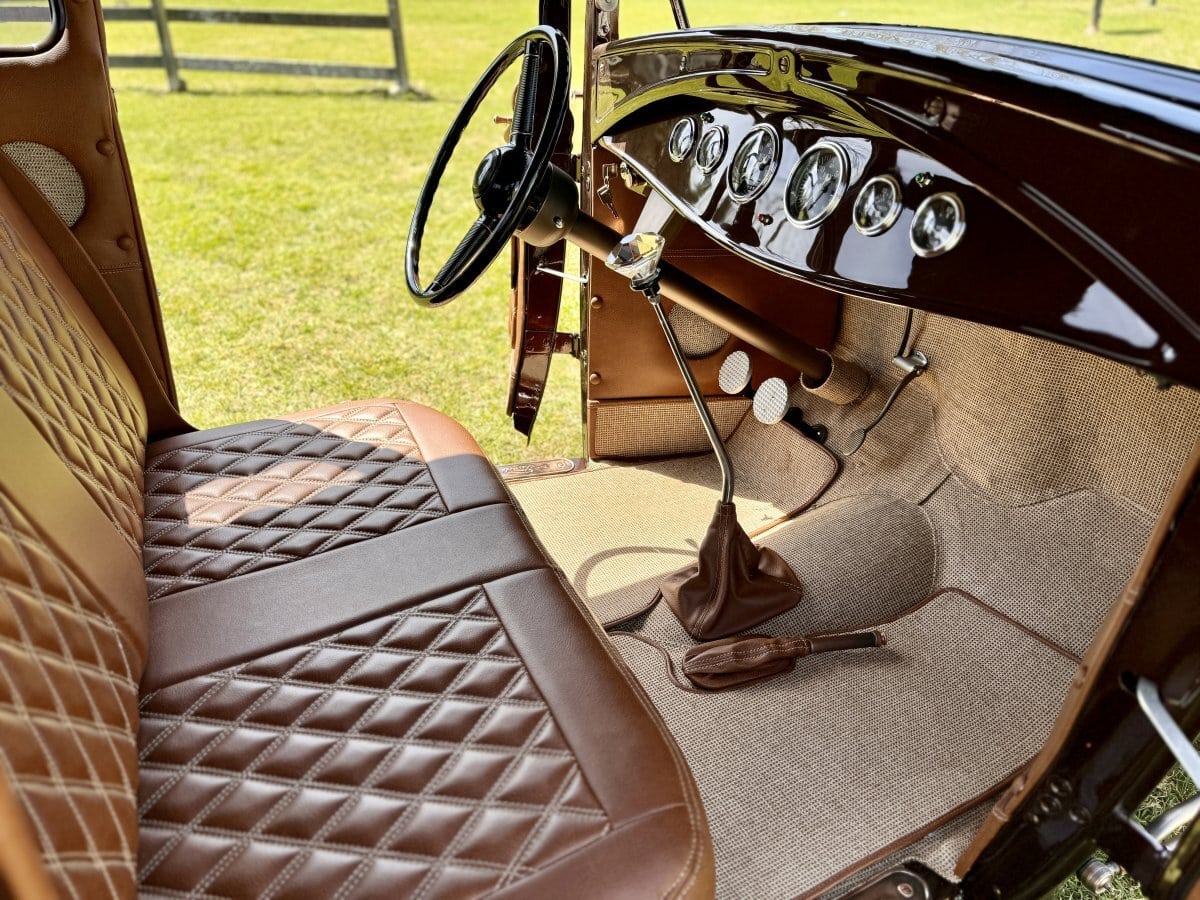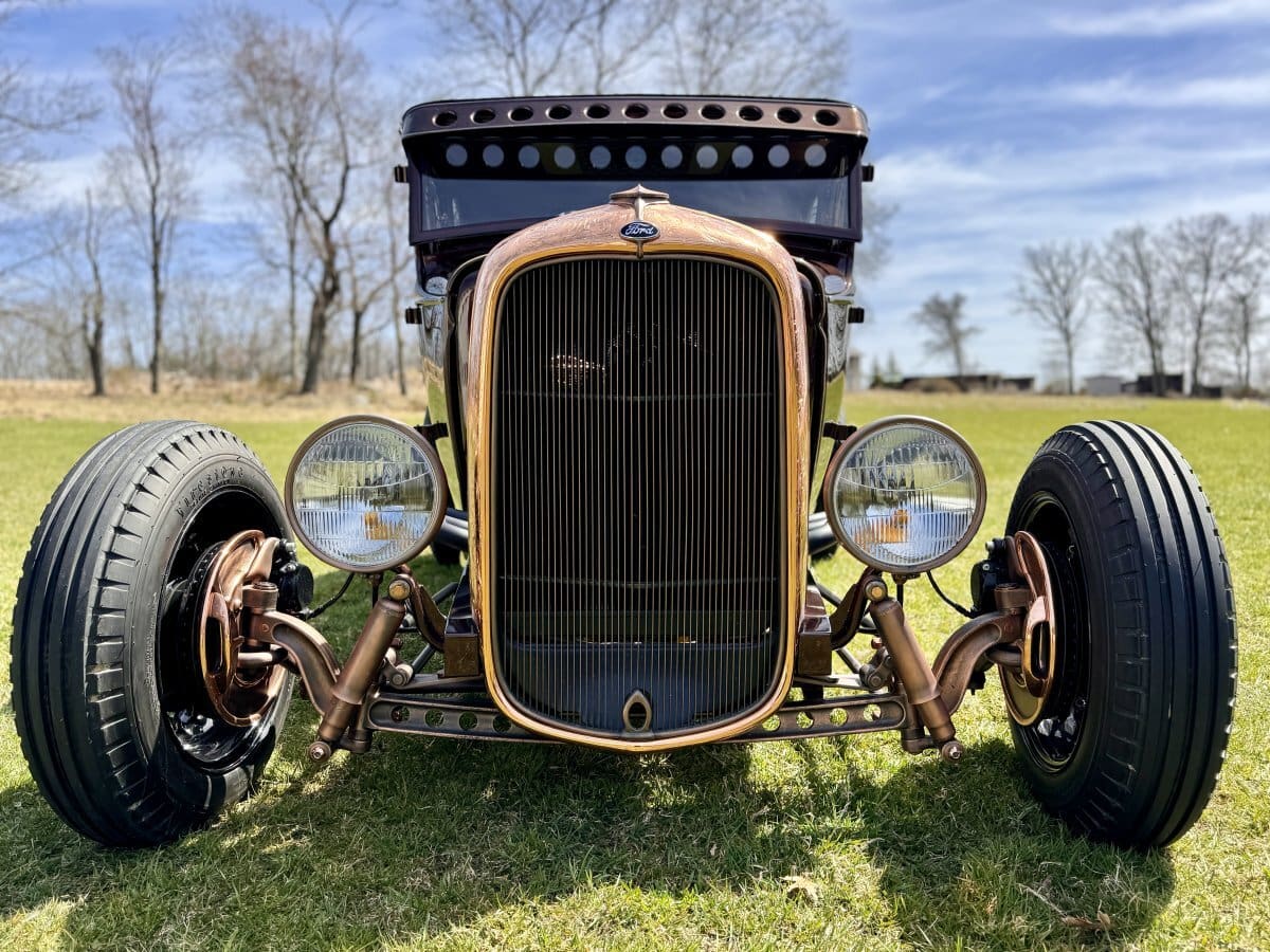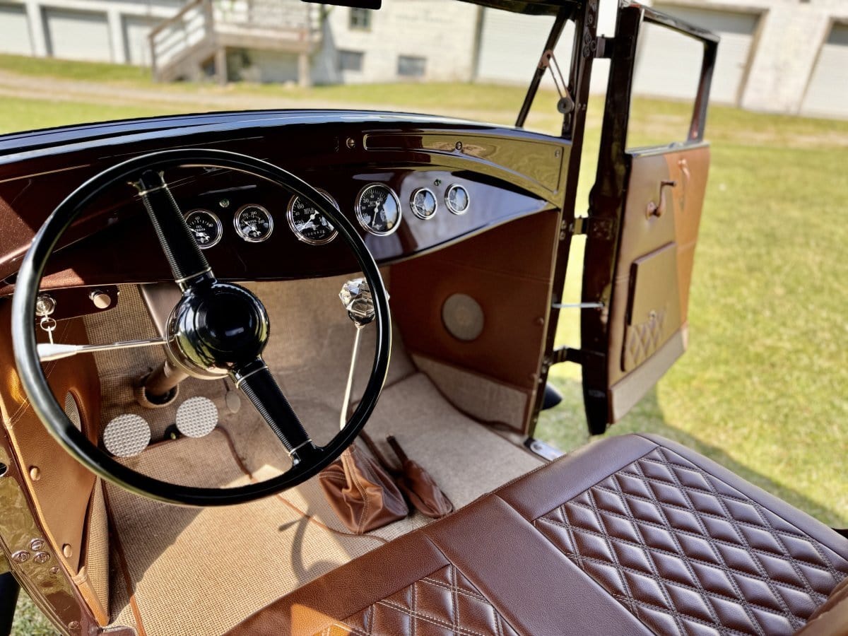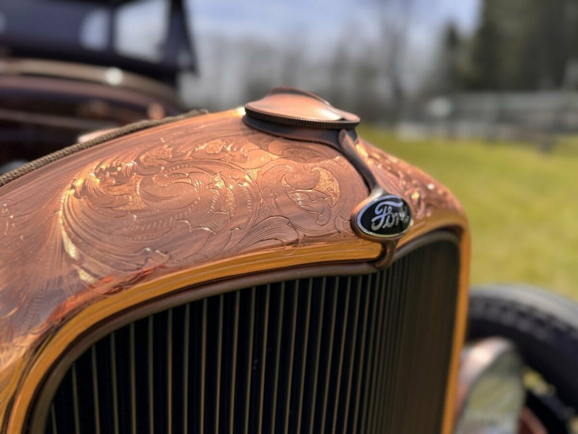 Non seulement ce Hot Rod est bien construit avec de nombreuses nouvelles pièces, mais il présente de superbes finitions en cuivre fabriquées à la main. À commencer par la calandre type 1930 entièrement personnalisée par le maître graveur Tay Herrera….Le moteur V8 est un Ford Flathead avec une admission Edelbrock, des carburateurs stromberg, et une transmission GM T5 (5 vitesses) avec embrayage hydraulique.