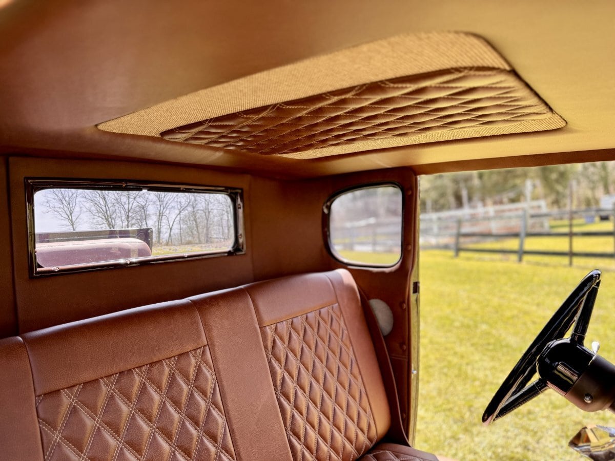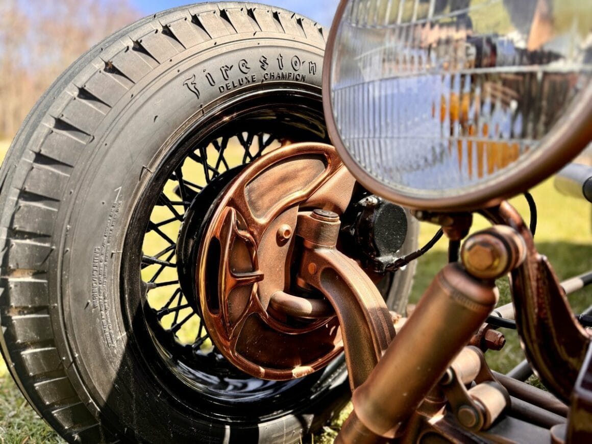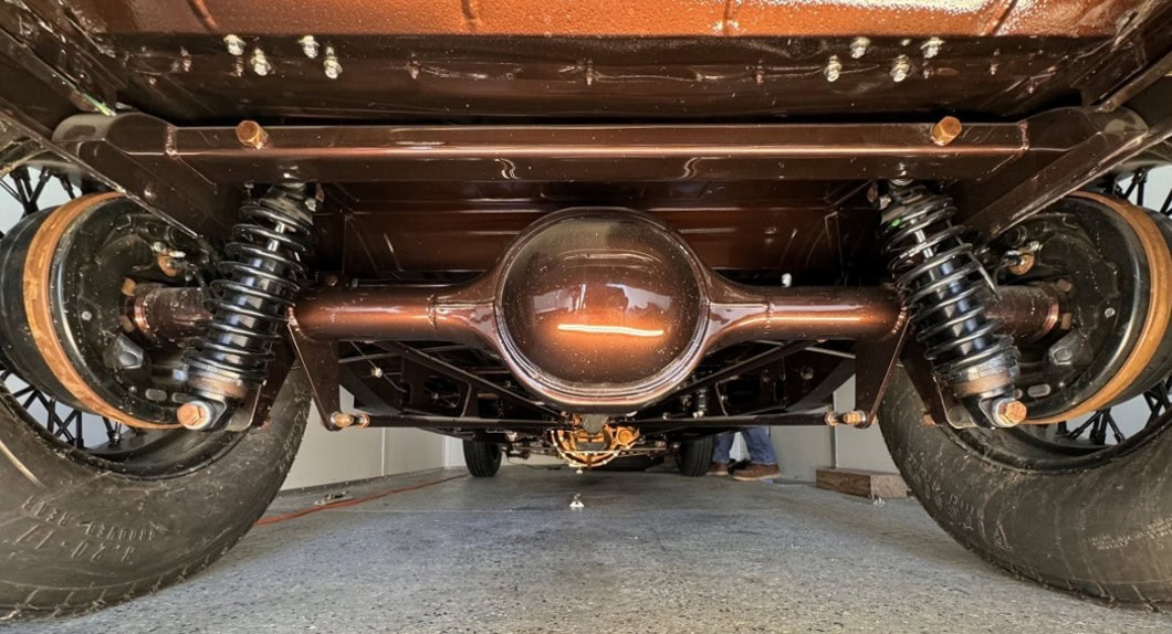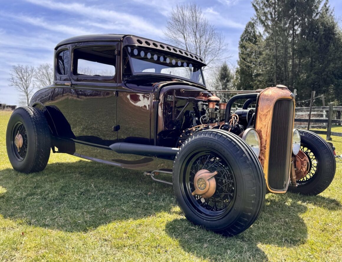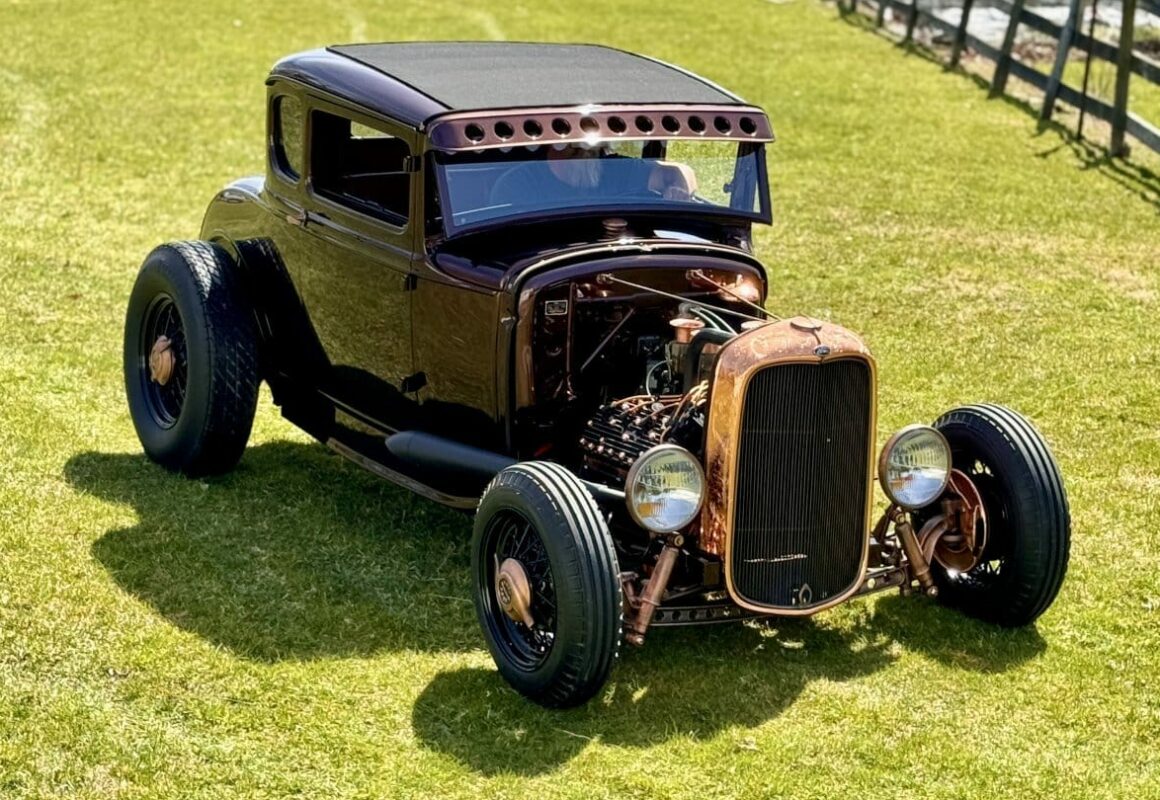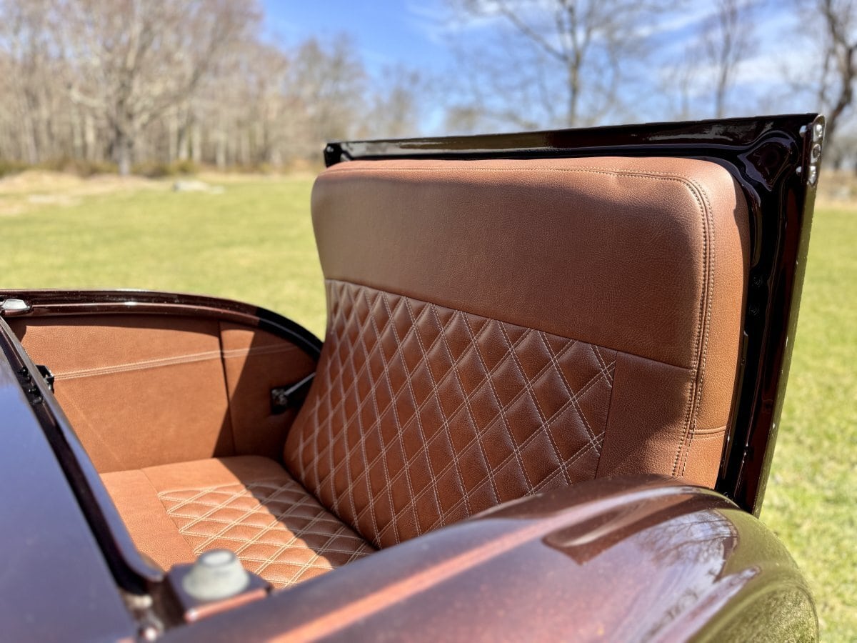 Non seulement ce Hot Rod est bien construit avec de nombreuses nouvelles pièces, mais il présente de superbes finitions en cuivre fabriquées à la main. À commencer par la calandre type 1930 entièrement personnalisée par le maître graveur Tay Herrera….Le moteur V8 est un Ford Flathead avec une admission Edelbrock, des carburateurs stromberg, et une transmission GM T5 (5 vitesses) avec embrayage hydraulique.