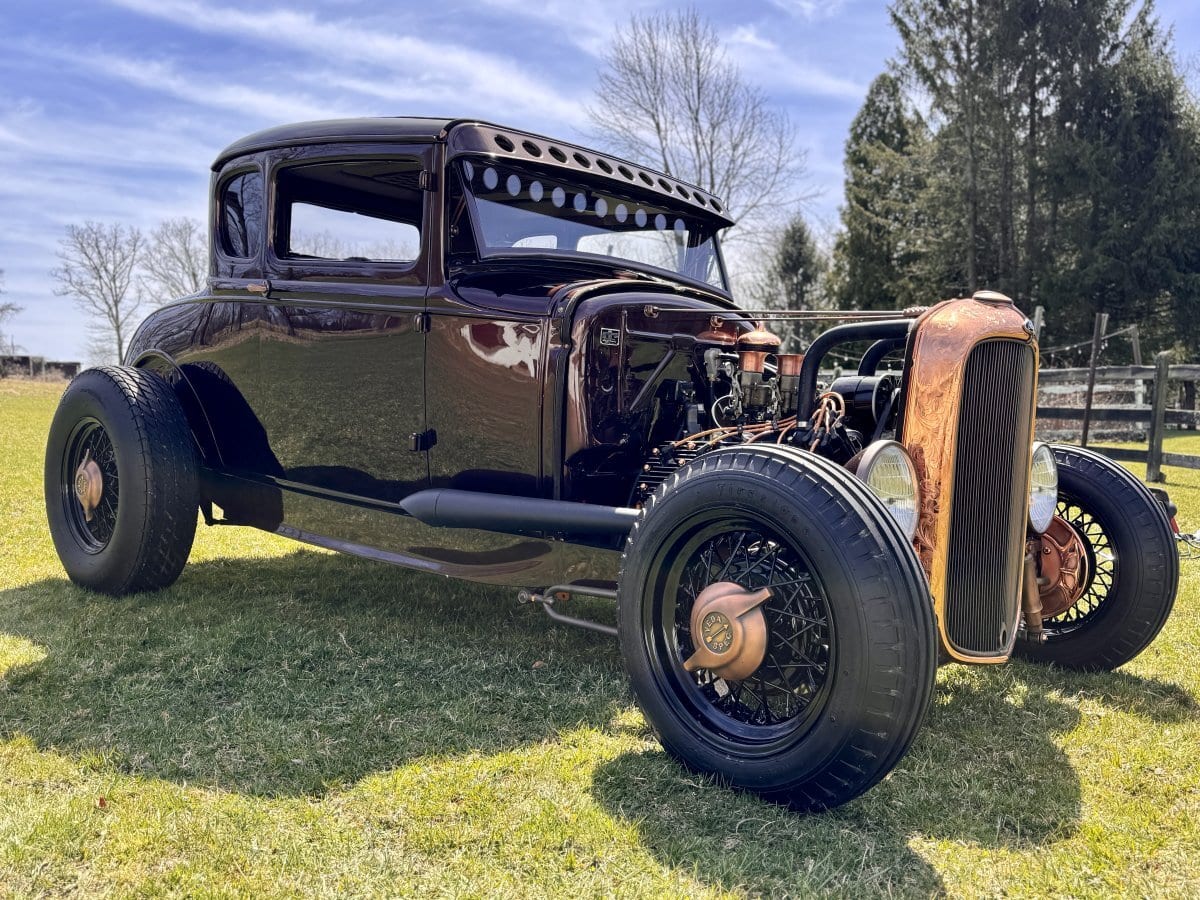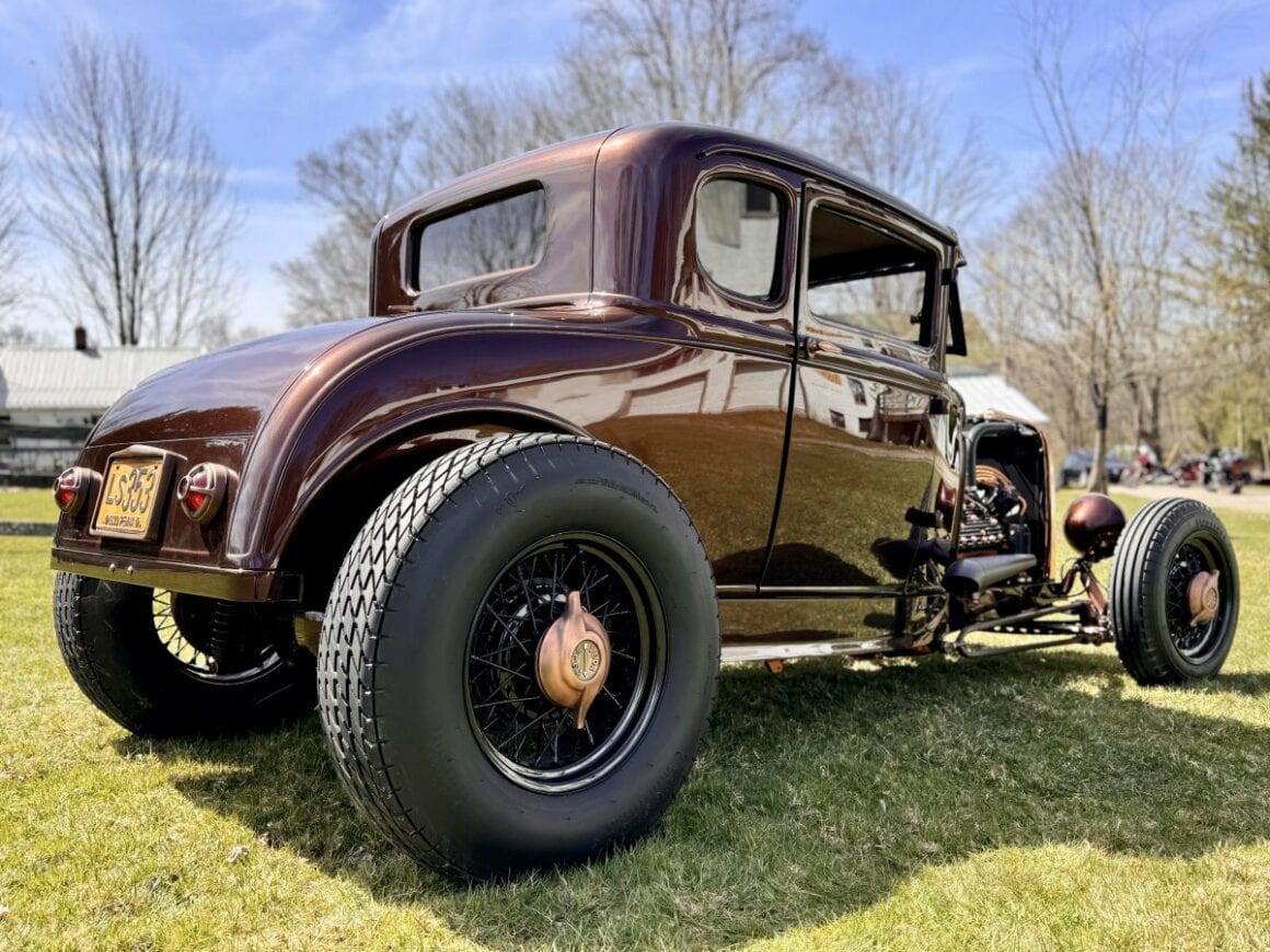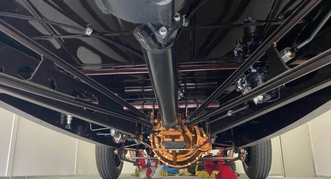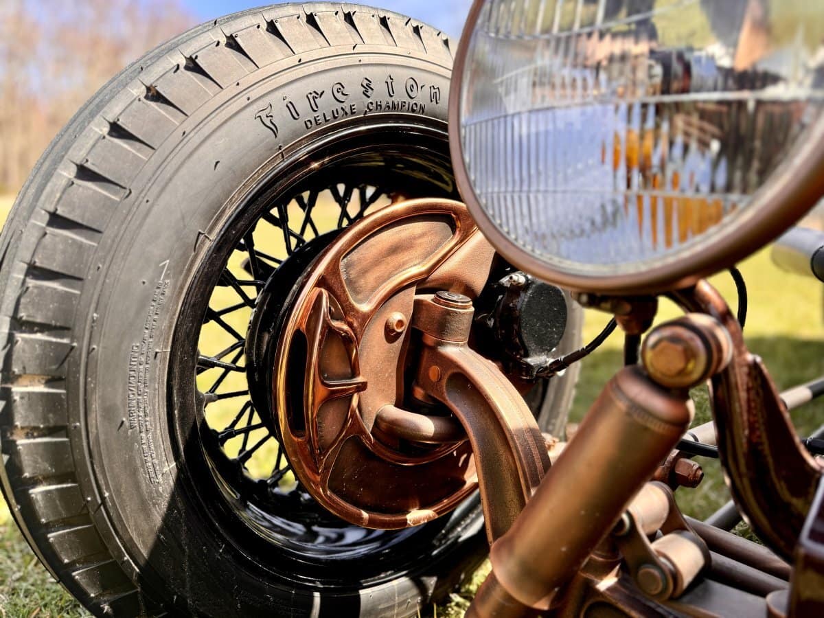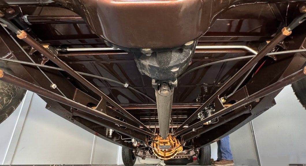 Non seulement ce Hot Rod est bien construit avec de nombreuses nouvelles pièces, mais il présente de superbes finitions en cuivre fabriquées à la main. À commencer par la calandre type 1930 entièrement personnalisée par le maître graveur Tay Herrera….Le moteur V8 est un Ford Flathead avec une admission Edelbrock, des carburateurs stromberg, et une transmission GM T5 (5 vitesses) avec embrayage hydraulique.