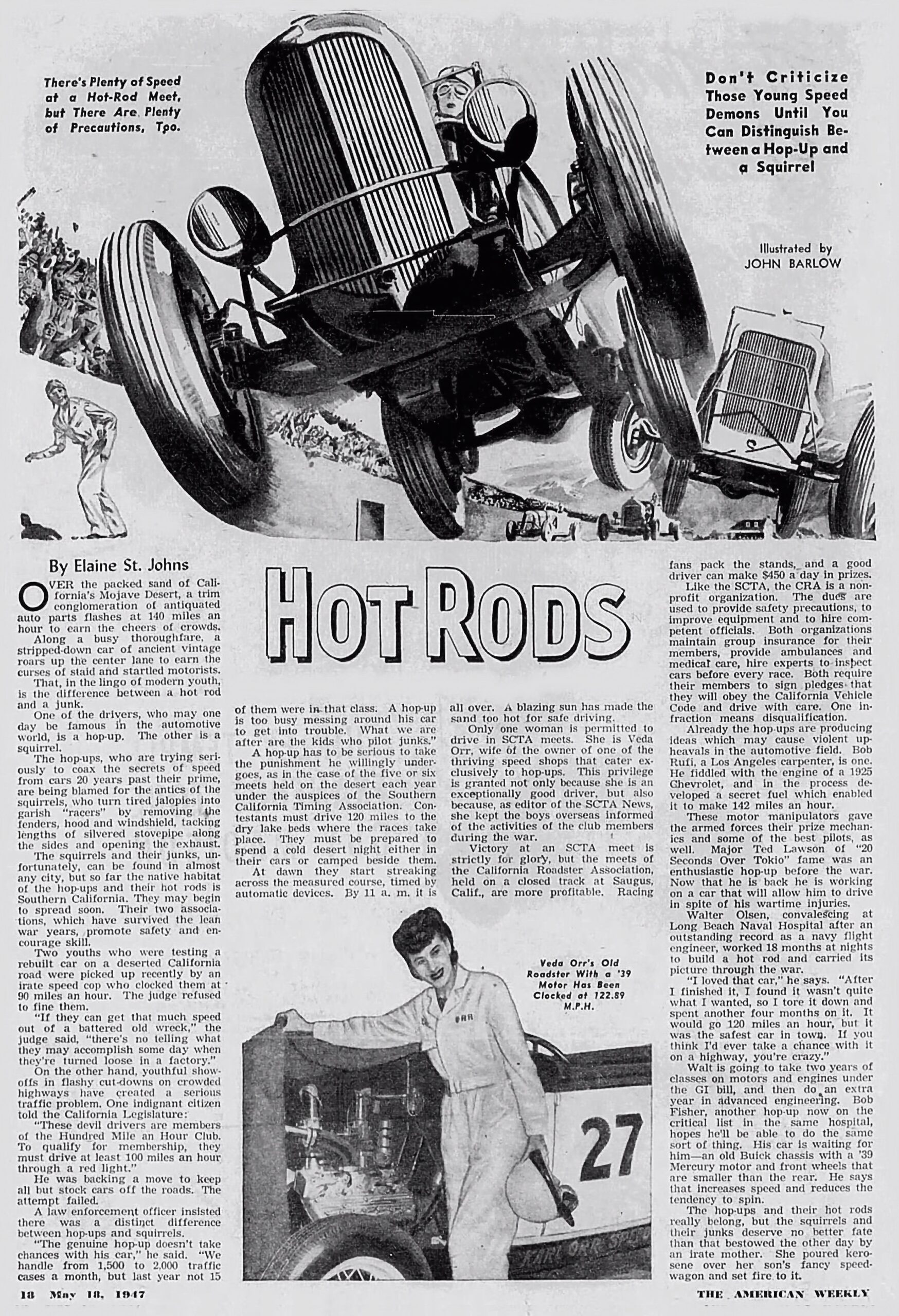 Avec le recul, c’est risible, une tempête parfaite d’ignorance et de peur, se manifestant par une stupidité pure et simple. Mais voici le hic : en pataugeant dans cette boue, je suis tombé sur une anomalie fascinante. Une publication de la côte ouest a refusé de mordre à l’hameçon. Le San Francisco Examiner est resté ferme, célébrant constamment les Hot Rodders bien intentionnés. Leur première incursion ? Un éditorial d’Elaine St. Johns, qui a mis en lumière une superbe PinUp dénommée Veda Orr qui louangeait les vertus du Hot Rodding.