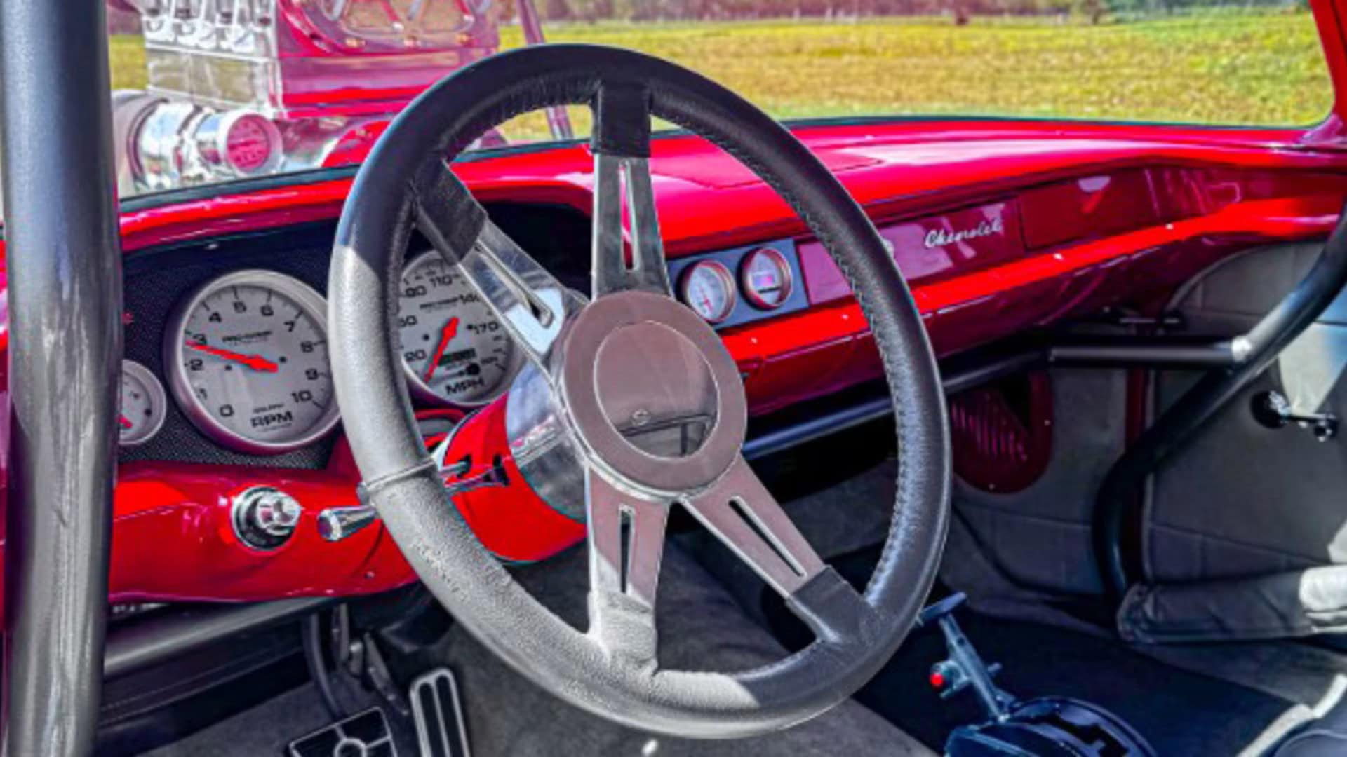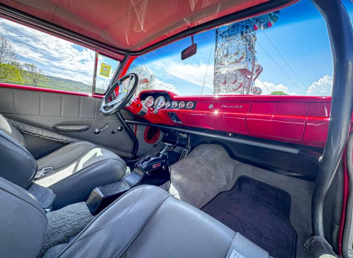 C’était une affaire dite “à haut rendement” avec une transmission axée sur les performances des courses de rue, y compris la transmission manuelle à quatre vitesses au plancher avec levier Hurst et transmission finale à faible rapport… Les volumes de production des voitures construites d’origine de cette façon étaient très faibles, et ces modèles basiques sont aujourd’hui recherchés par les collectionneurs fauchés. Notamment la version de “Baldwin Chevrolet” de Long Island, New York, est devenu célèbre pour avoir construit la “Street Racer Special” avec un V8 haute performance de 427ci transformant la Biscayne en une voiture de drag surnommée “Bisquick” par les passionnés. Les Biscayne’s était dépourvue de garnitures chromées et les garnitures intérieures étaient spartiates, avec des tissus médiocres et des garnitures d’ameublement en vinyle. Ce modèle est équipé d’un V8 504ci et de 3 Blower’s superposés…