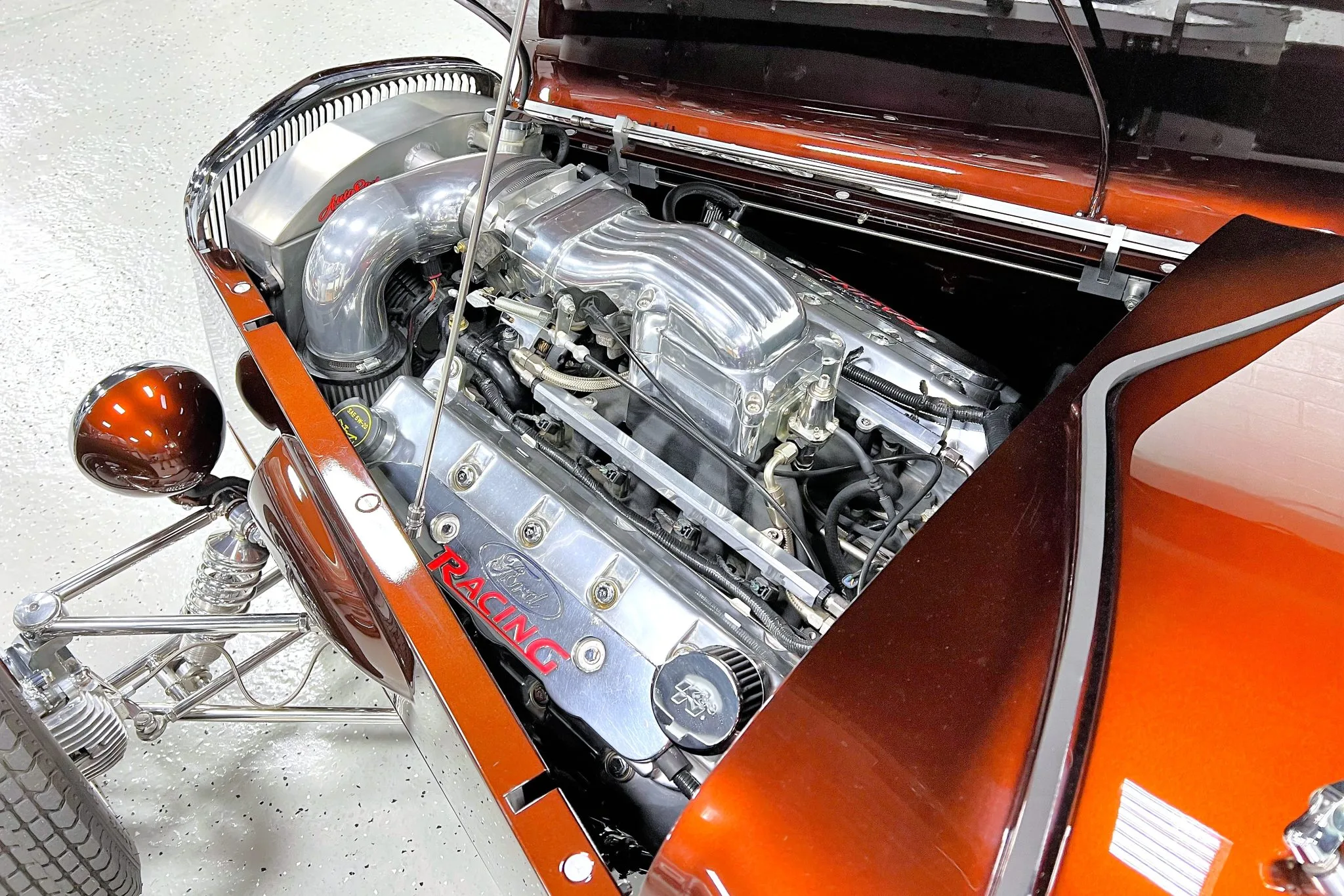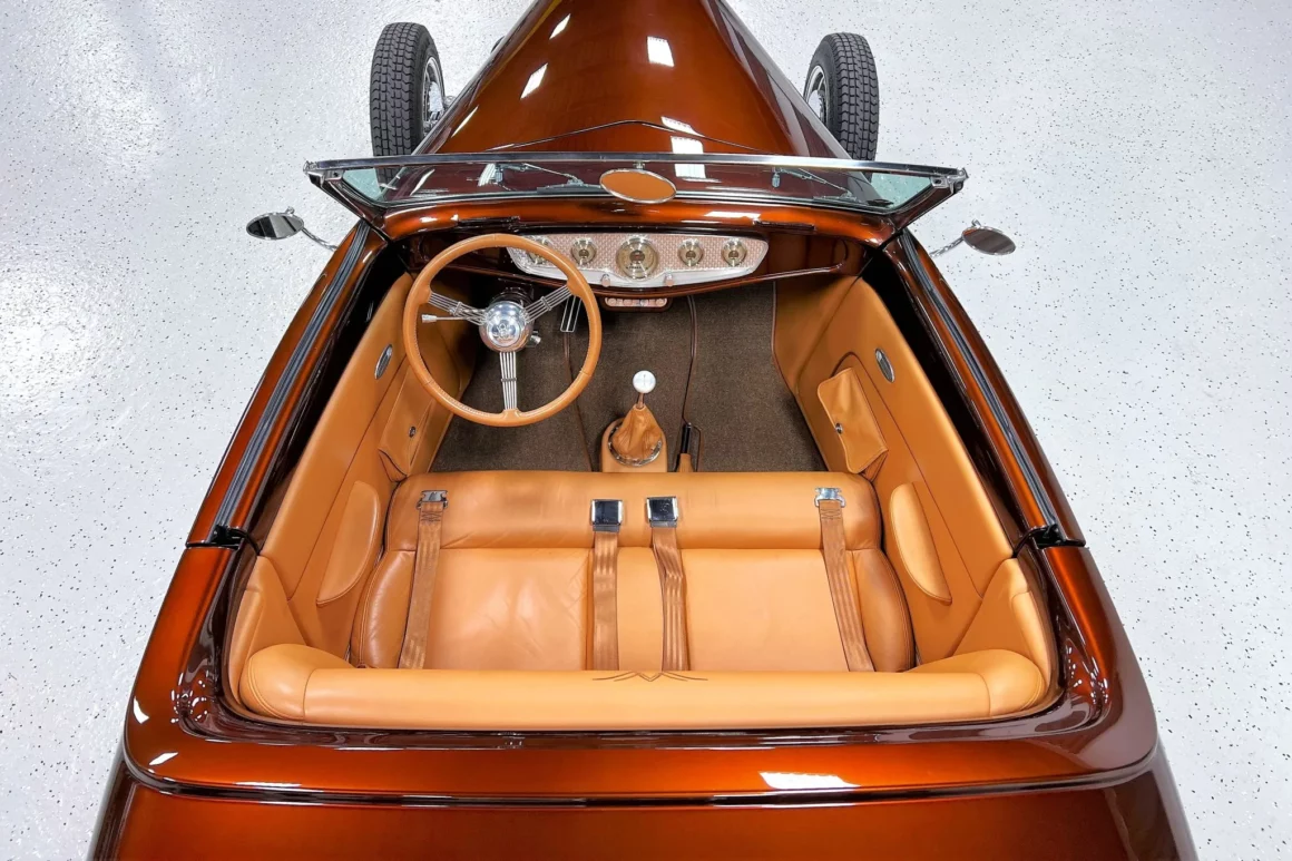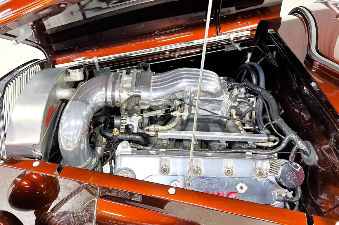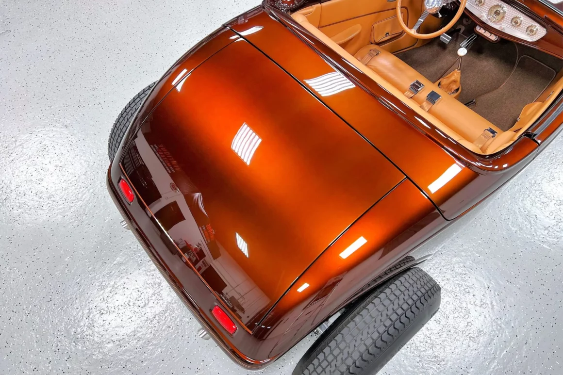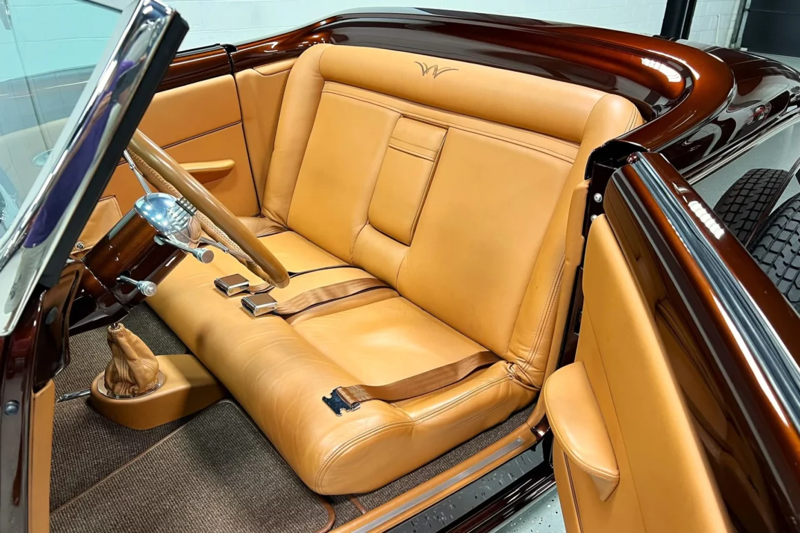 Pour ce qui en est de ce Hot-Rod, son moteur est un V8 Ford de 4L6 litres jumelé à une transmission automatique à trois rapports (incestueux), et ses caractéristiques complémentaires comprennent une capote rabattable, une configuration de suspension indépendante de “Kugel Komponents”, des freins à disque aux quatre roues, des jantes réplica de style “Halibrand”, une sellerie en cuir, des vitres électriques et un système de climatisation “Vintage Air”.