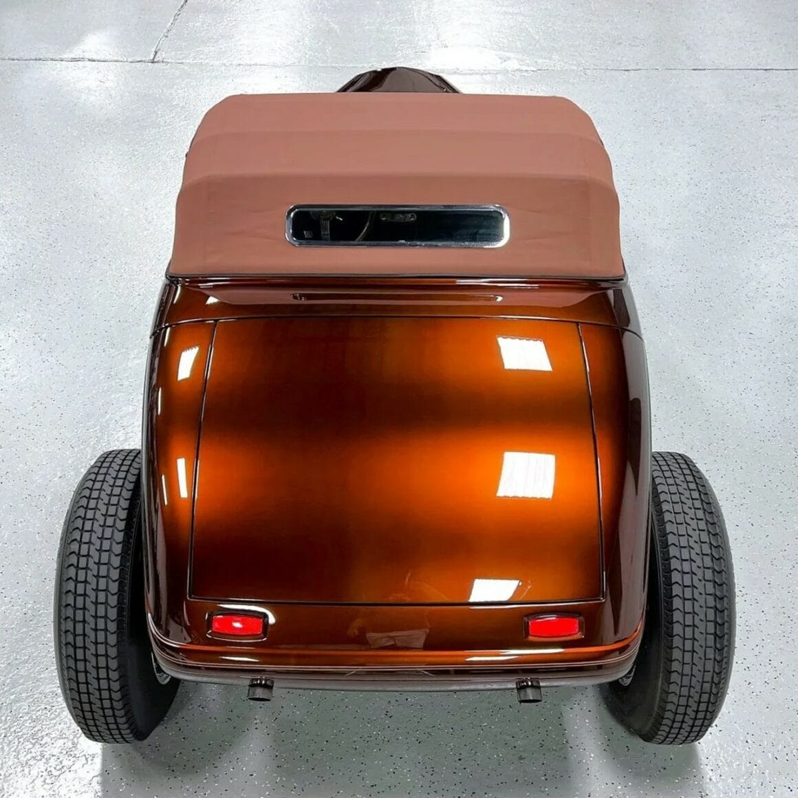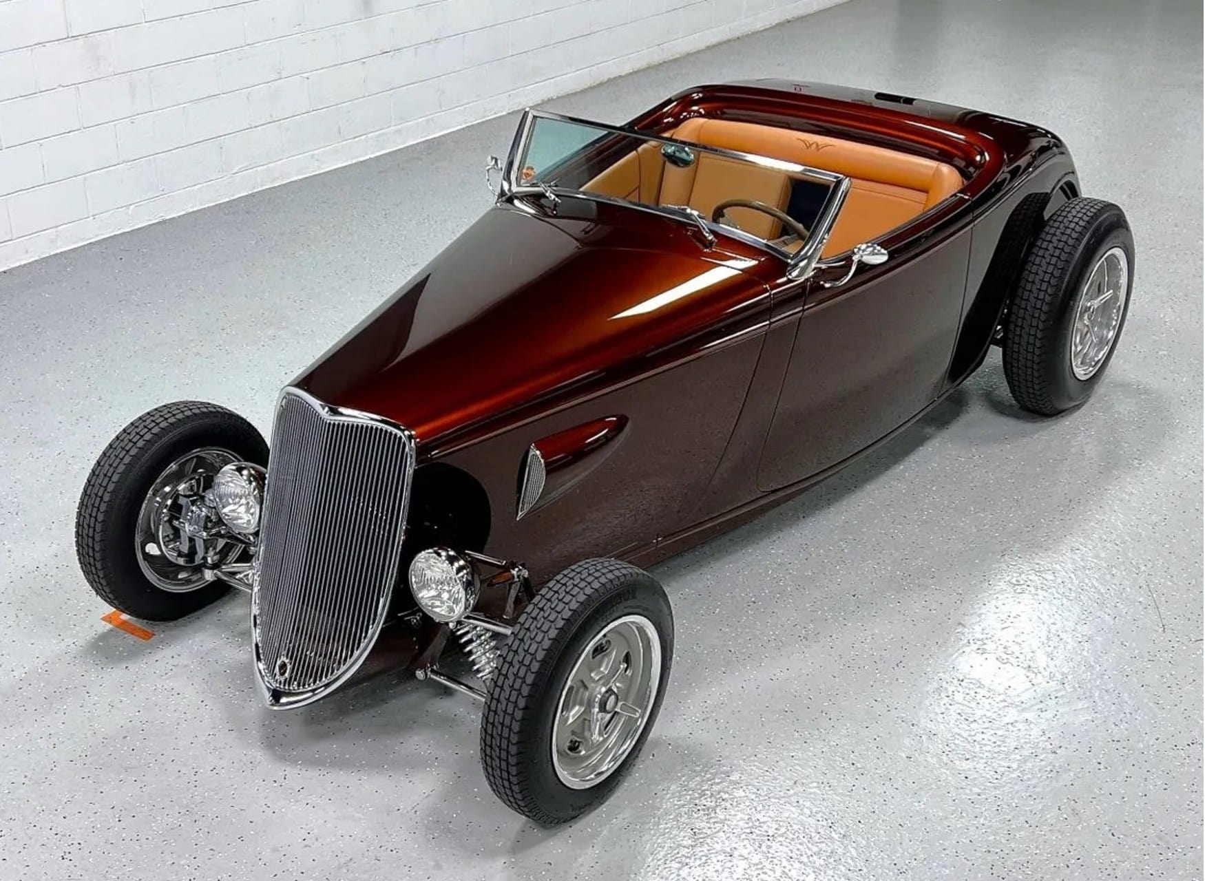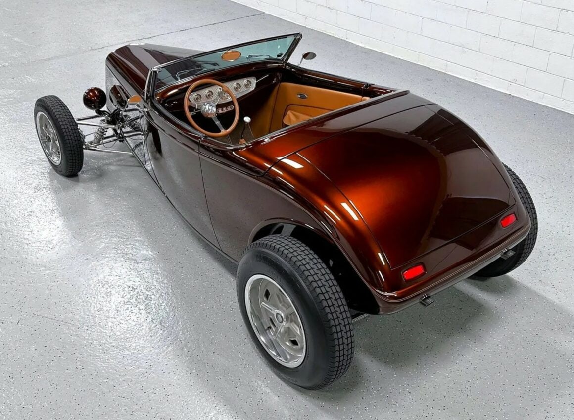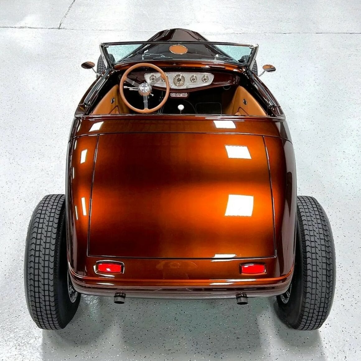 Pour ce qui en est de ce Hot-Rod, son moteur est un V8 Ford de 4L6 litres jumelé à une transmission automatique à trois rapports (incestueux), et ses caractéristiques complémentaires comprennent une capote rabattable, une configuration de suspension indépendante de “Kugel Komponents”, des freins à disque aux quatre roues, des jantes réplica de style “Halibrand”, une sellerie en cuir, des vitres électriques et un système de climatisation “Vintage Air”.