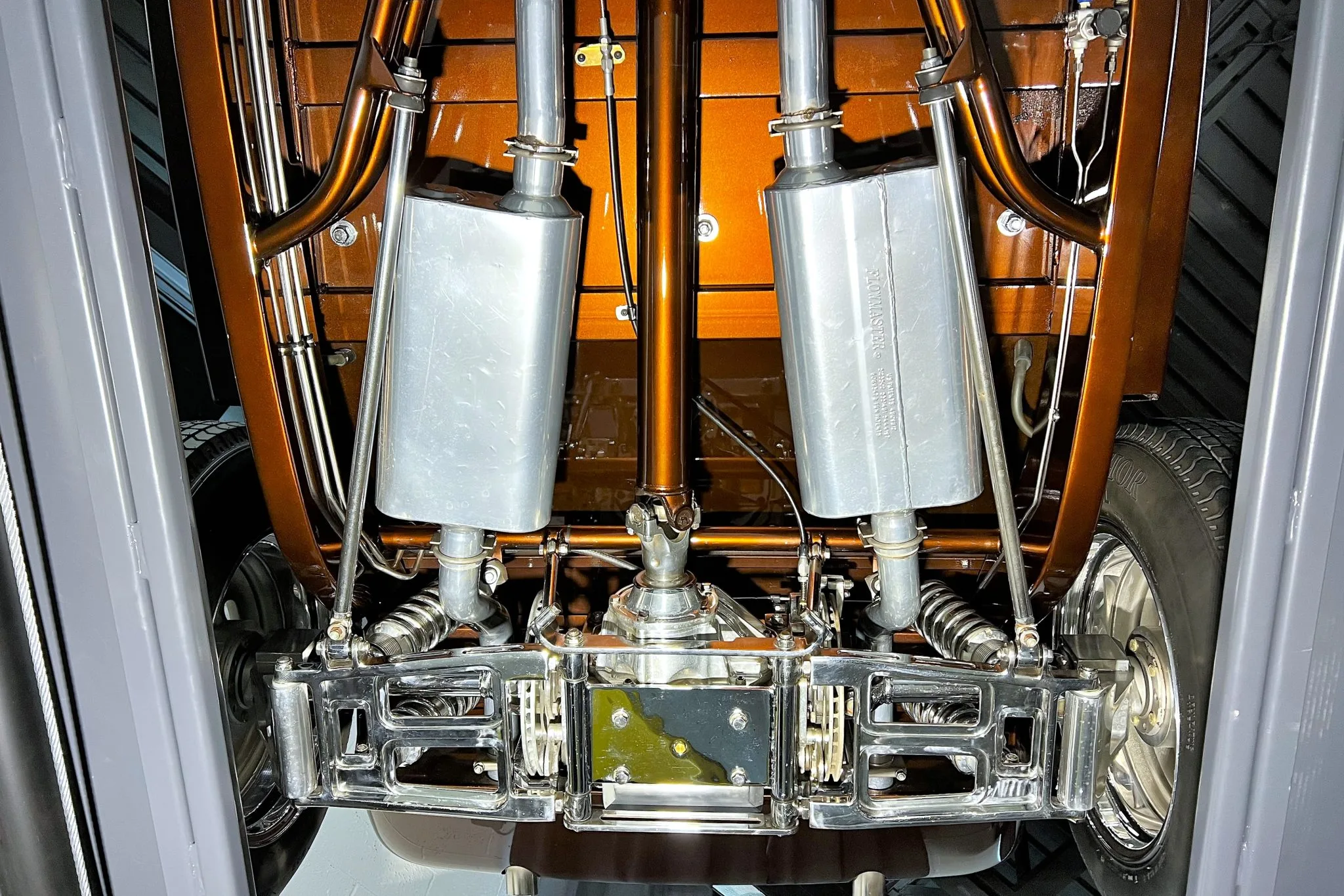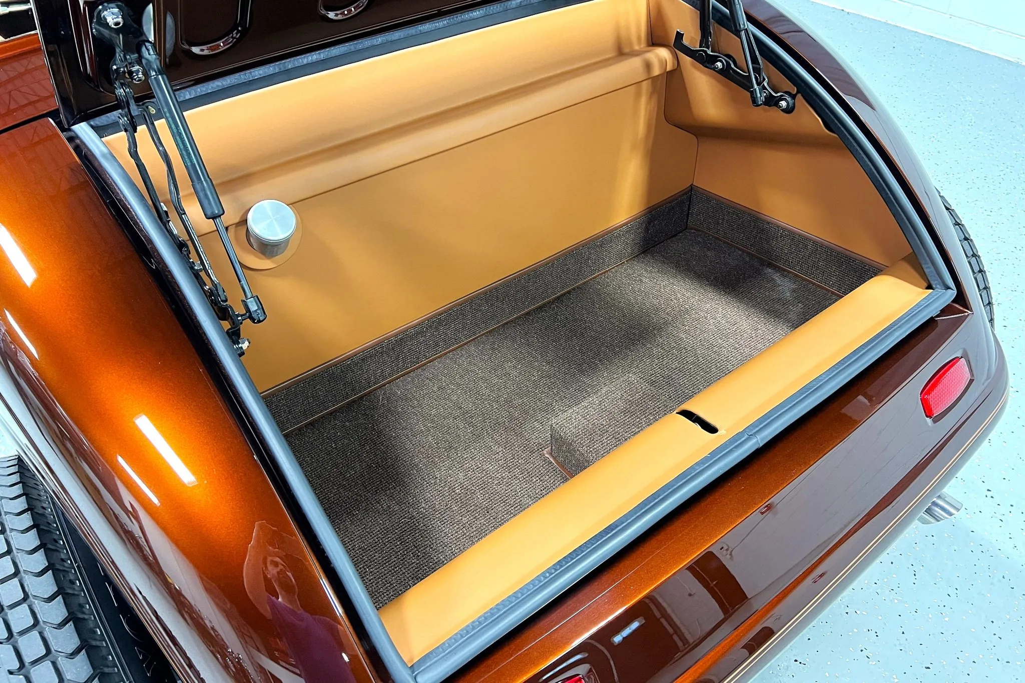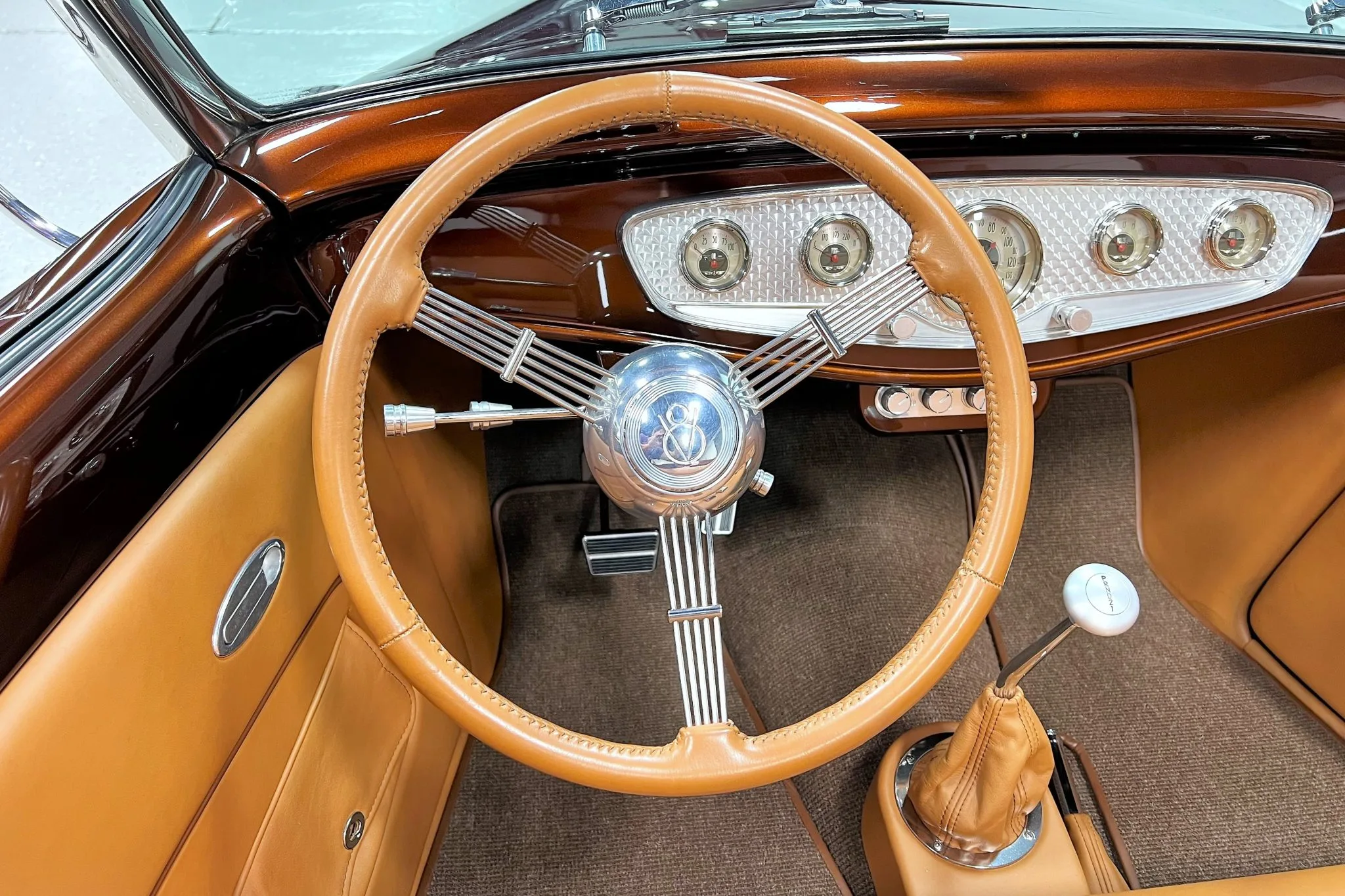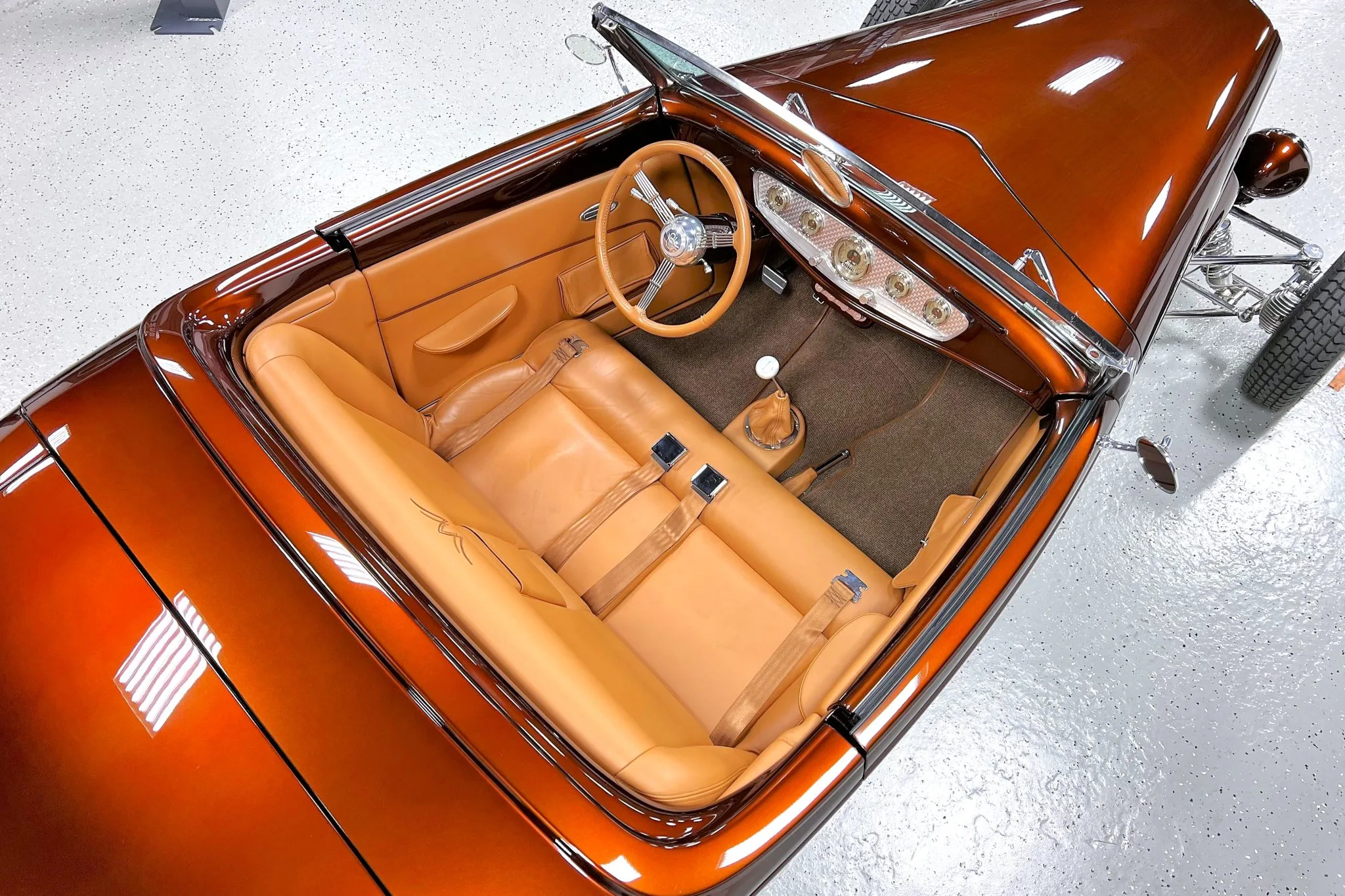 Au lieu d’Un châssis de même provenance, c’est un “Alloway Speedstar” doté d’un empattement de 112. Les accessoires comprennent diverses pièces de chez “Dick Scritchfield”, un capot de chez “Rootlieb” (en trois pièces), deux rétroviseurs latéraux, des phares de 7 pouces équipés de clignotants à DEL intégrés et des feux arrière Ford de style 1941. La capote pliante “Haartz” est dotée d’une lunette arrière en verre et se range sous un panneau articulé.