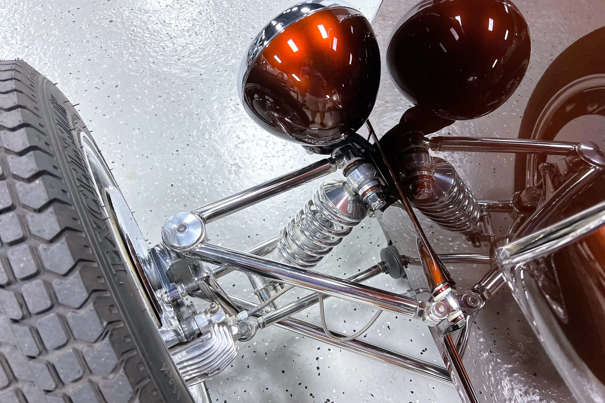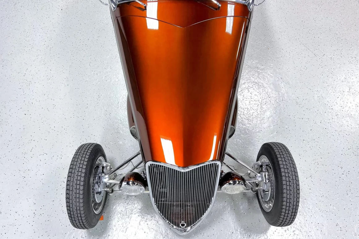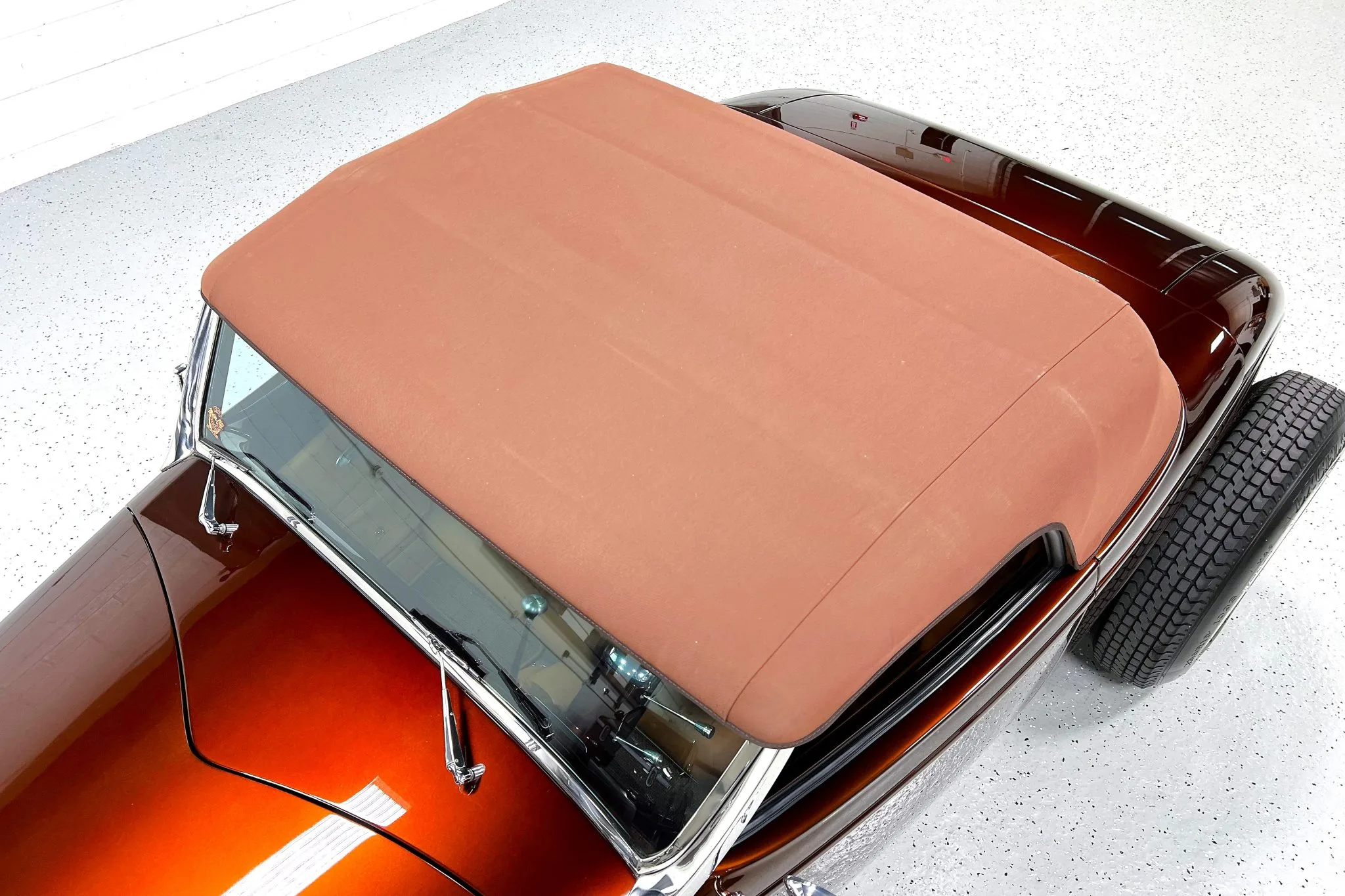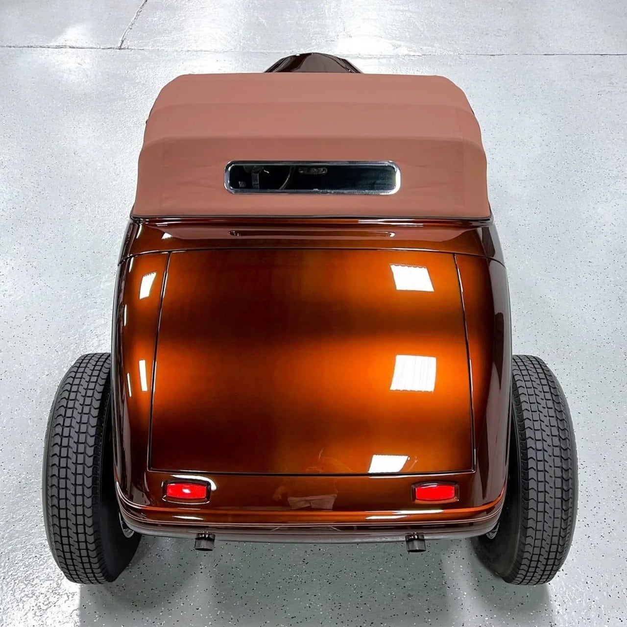 Au lieu d’Un châssis de même provenance, c’est un “Alloway Speedstar” doté d’un empattement de 112. Les accessoires comprennent diverses pièces de chez “Dick Scritchfield”, un capot de chez “Rootlieb” (en trois pièces), deux rétroviseurs latéraux, des phares de 7 pouces équipés de clignotants à DEL intégrés et des feux arrière Ford de style 1941. La capote pliante “Haartz” est dotée d’une lunette arrière en verre et se range sous un panneau articulé.