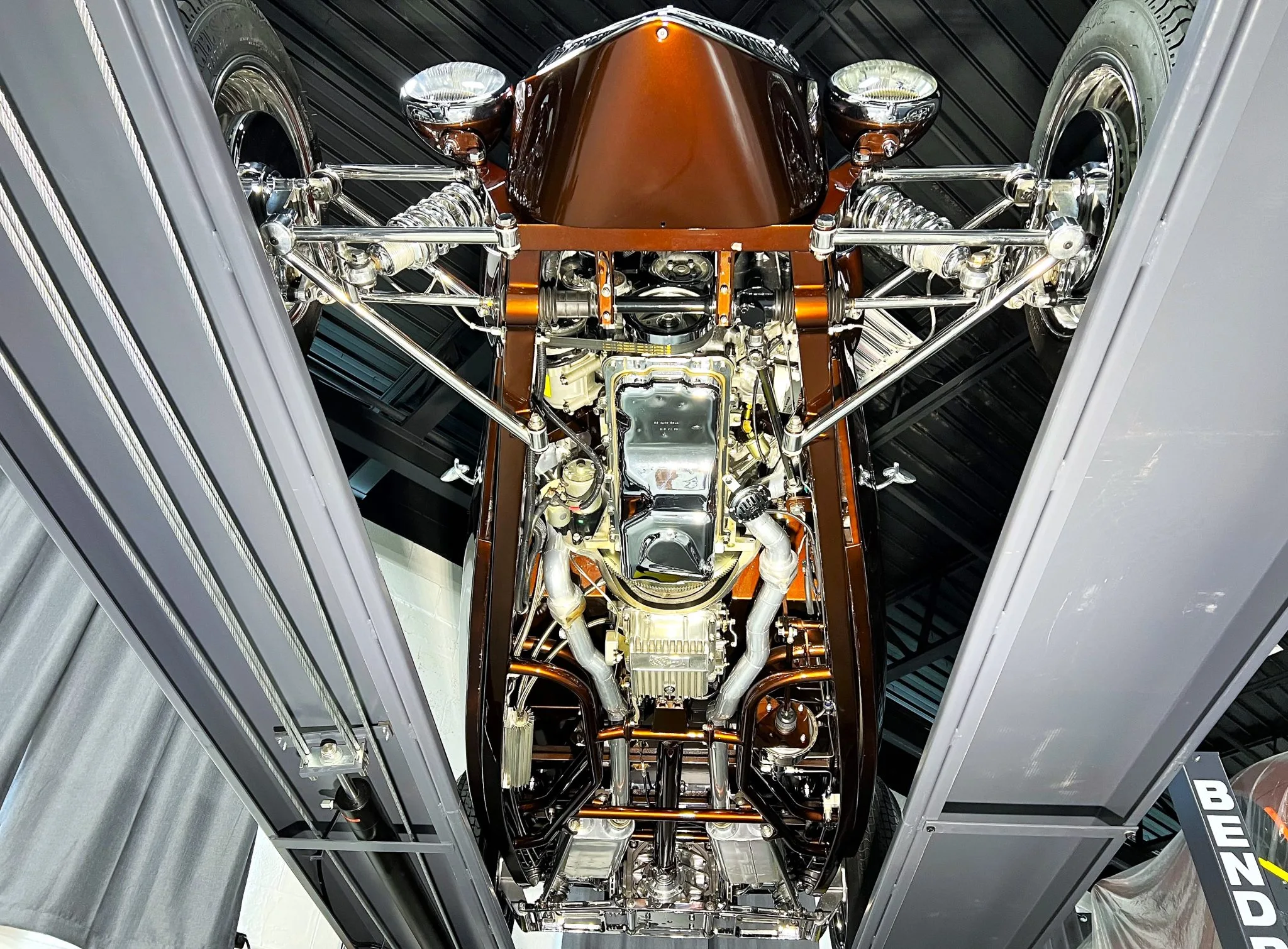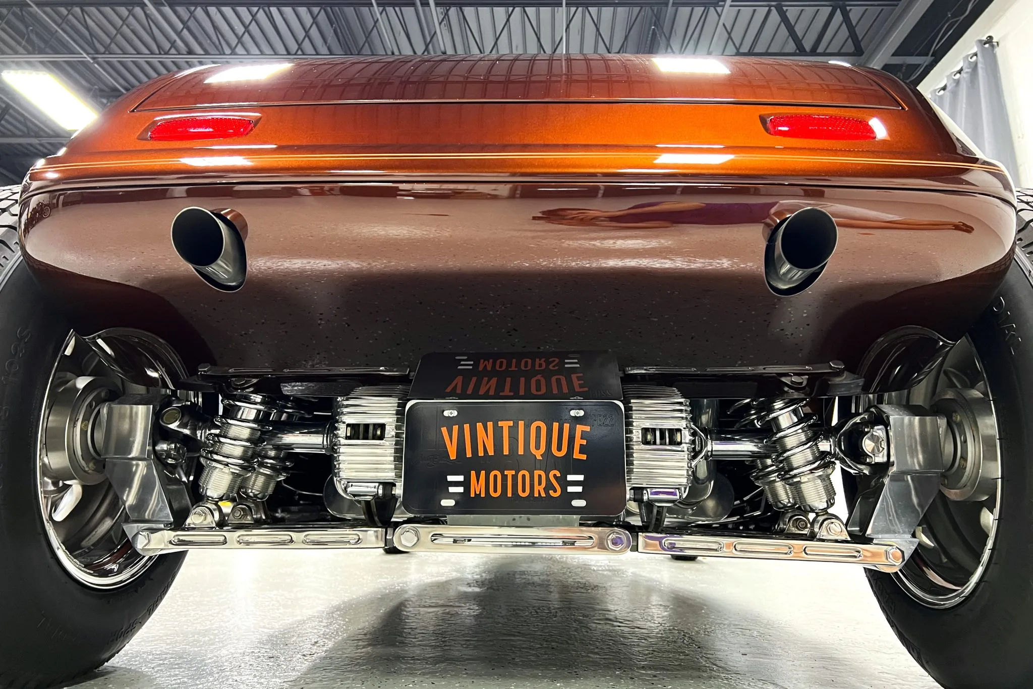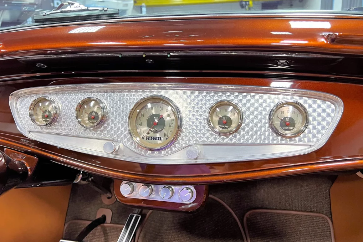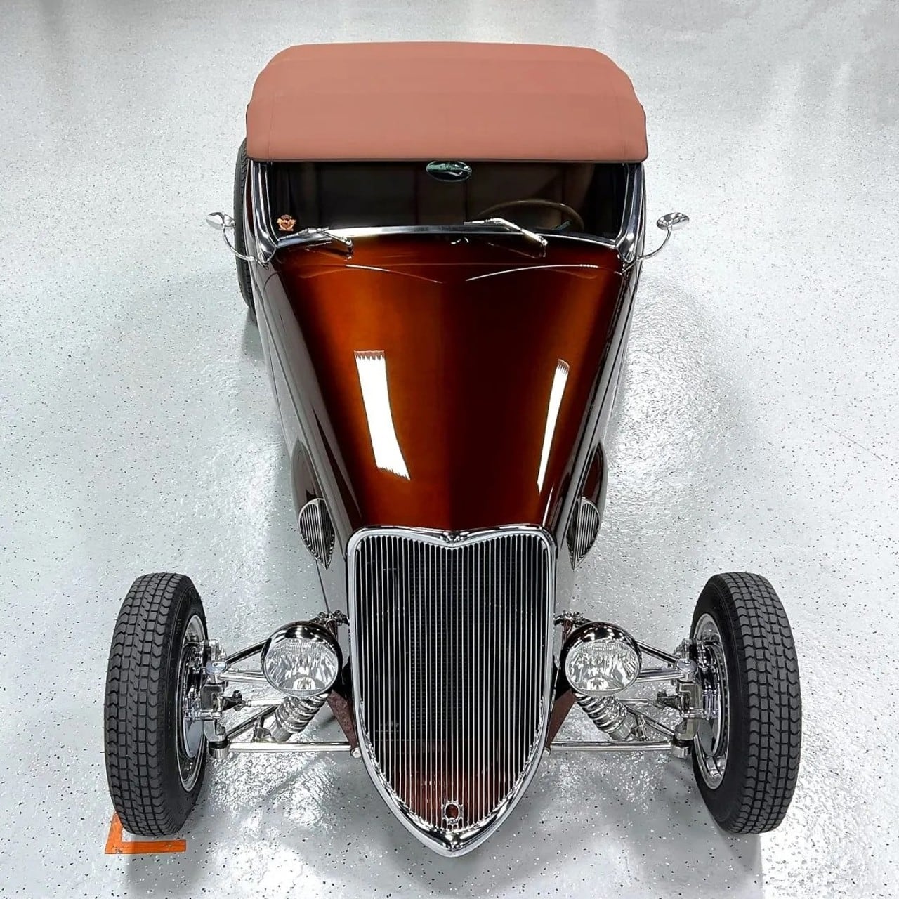 Au lieu d’Un châssis de même provenance, c’est un “Alloway Speedstar” doté d’un empattement de 112. Les accessoires comprennent diverses pièces de chez “Dick Scritchfield”, un capot de chez “Rootlieb” (en trois pièces), deux rétroviseurs latéraux, des phares de 7 pouces équipés de clignotants à DEL intégrés et des feux arrière Ford de style 1941. La capote pliante “Haartz” est dotée d’une lunette arrière en verre et se range sous un panneau articulé.