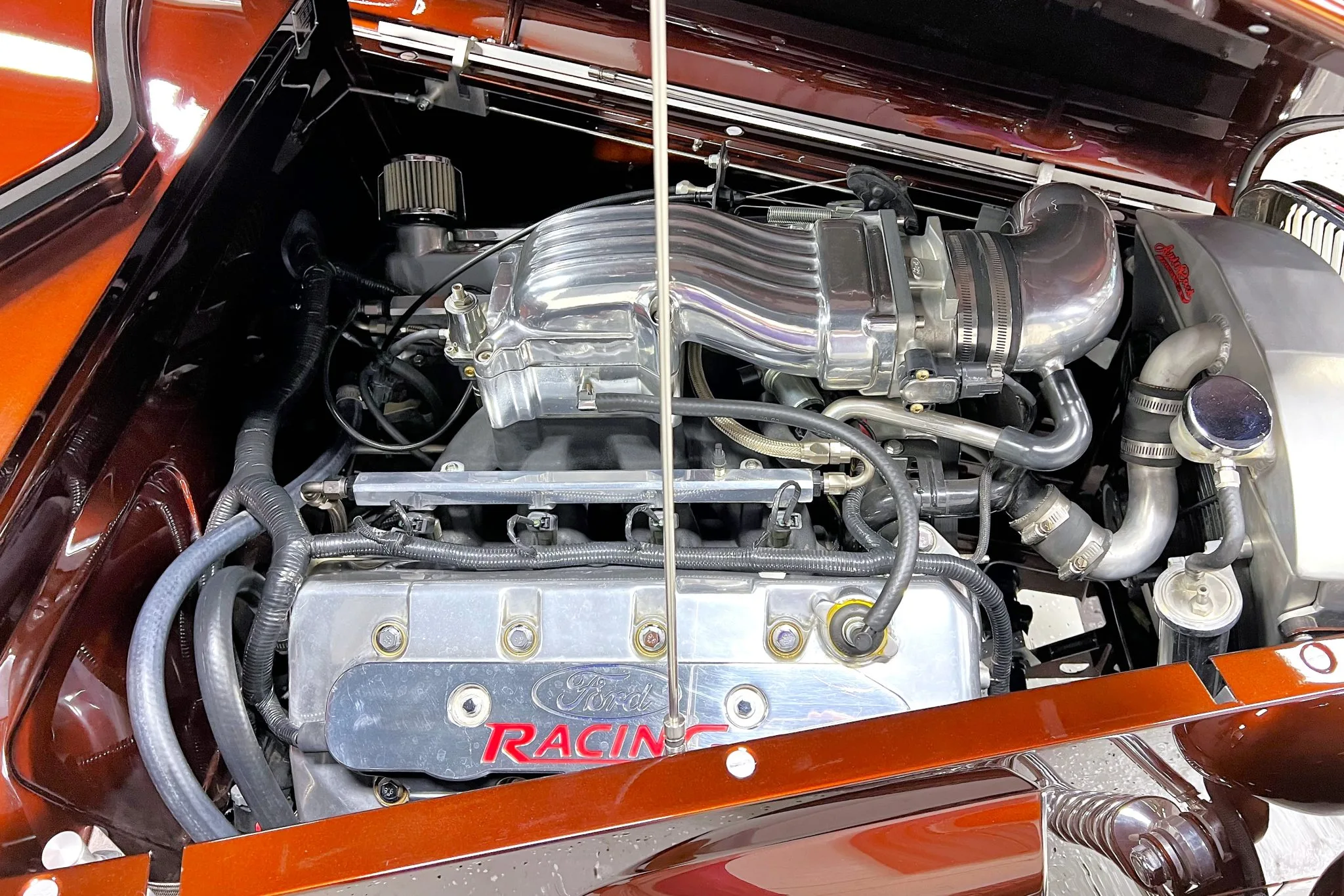 Un V8 Ford de 4L6 litres a injection de carburant est décoré de couvercles de soupapes Ford Racing et de collecteurs liés à un système d’échappement fabriqué par “Watson Engineering” avec des silencieux “Flowmaster”. Comme écrit ci-dessus/avant, il eut été plus simple et moins couteux de commander le même Hot-Rod 100% chez “American Speed Cy” qui est vraiment unique par rapport aux constructeurs amateurs de Hot-Rods dans leur box-garage.