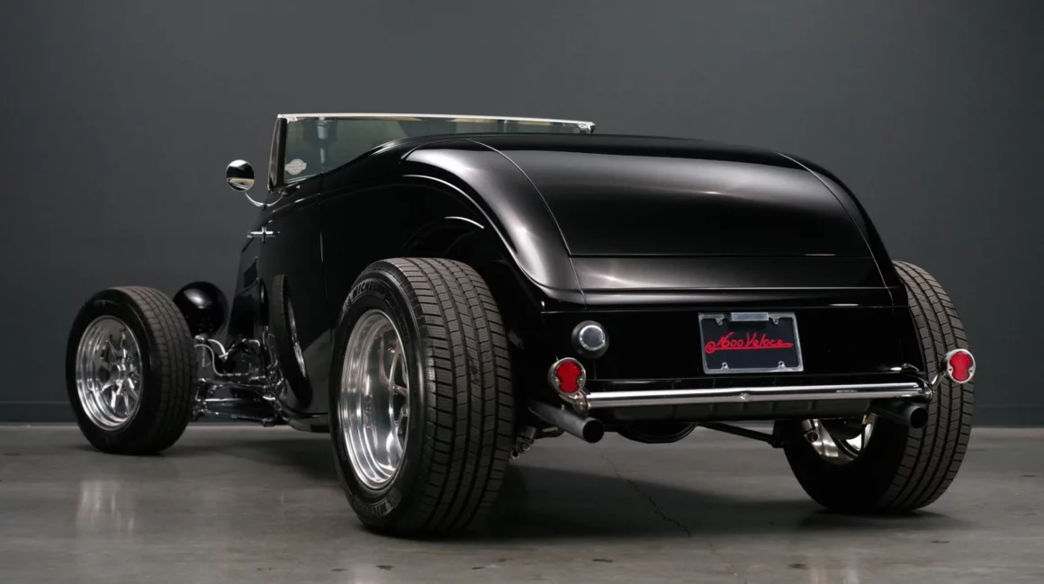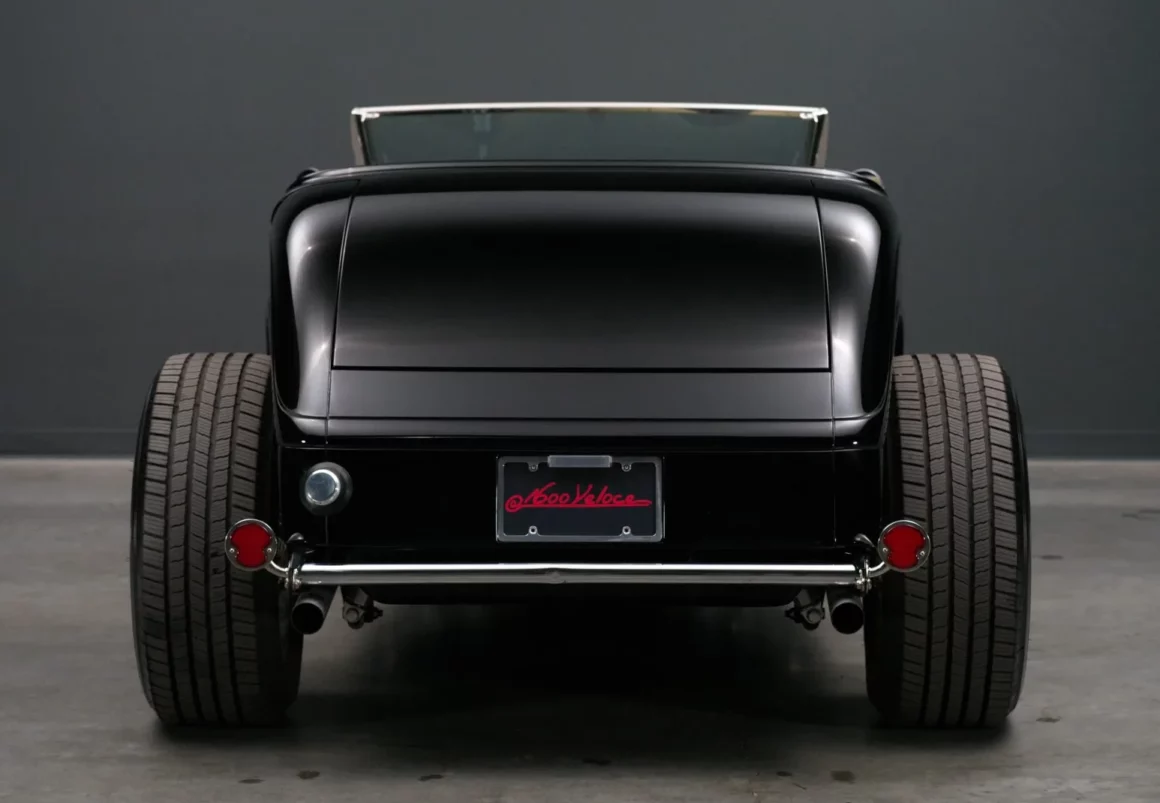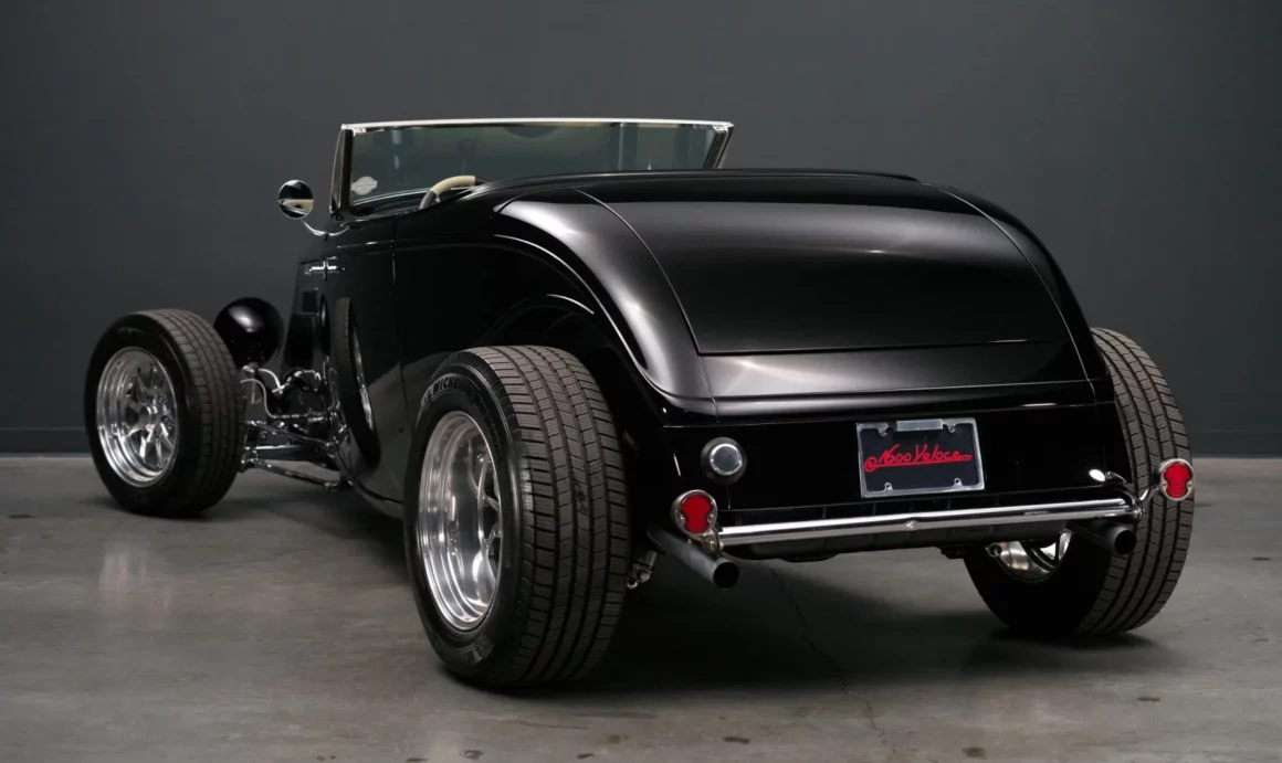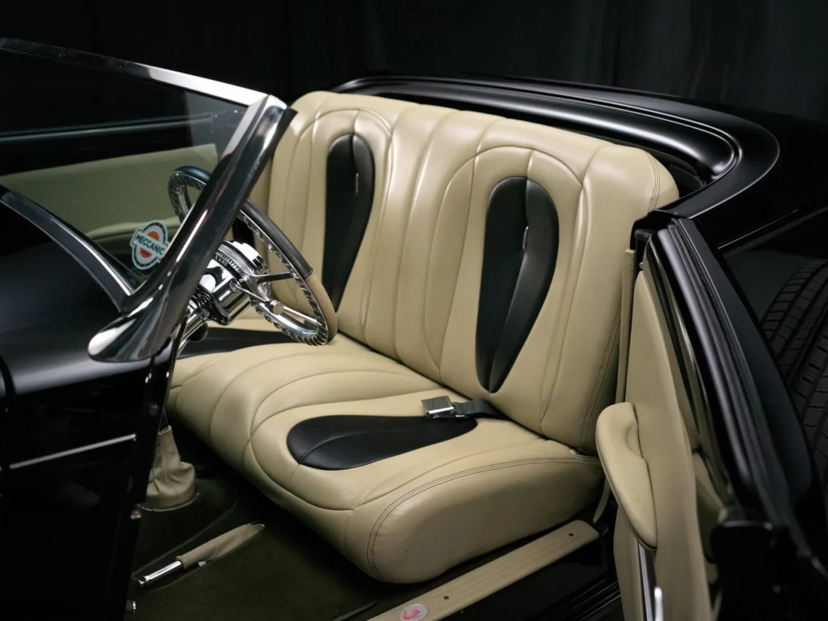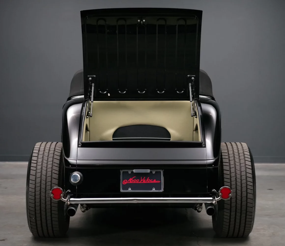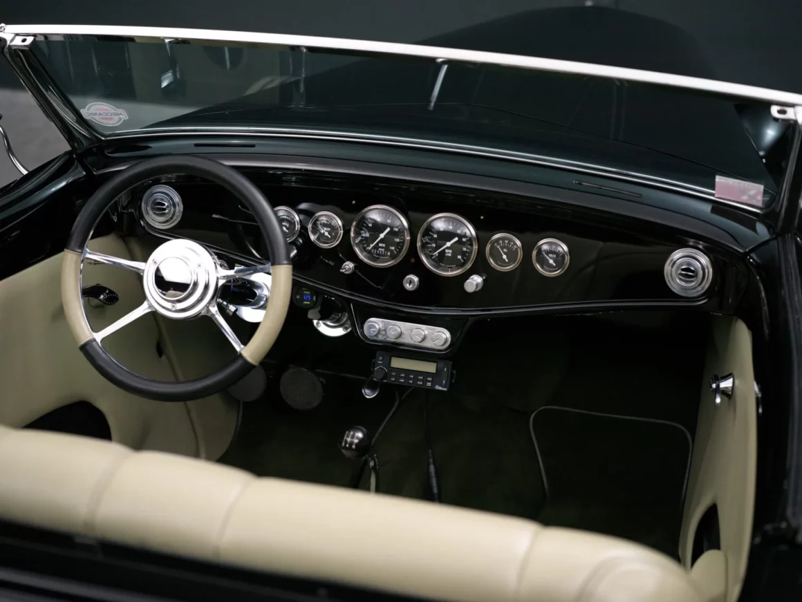 Il est équipé de coilovers arrière, de freins à disque Wilwood, de la climatisation, de vitres électriques, d’un système audio personnalisé, de compteurs Classic Instruments et de l’air-conditionné. Ce Highboy Roadster est immatriculé au Connecticut qui le classe et immatricule légalement comme un Ford Roadster de 1933… Essayez donc en France rien que pour le fun ! Sa carrosserie American Speed comporte des portes à ouverture inversée. des phares halogènes, une calandre chromée “Nottingham”, des feux arrière à DEL et deux sorties d’échappement.