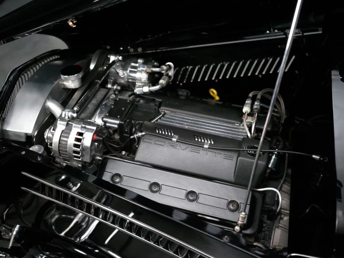 Il dispose d’un arceau de sécurité arrière qui cache un réservoir de carburant en acier inoxydable de 16 gallons. Les jantes en alliage sont ses Budnik Gasser mesurent 16 et 18 équipés de pneus Michelin Defender affichant les codes de date 2019 et 2020. L’équipement comprend des coilovers arrière réglables Ridetech, des amortisseurs “billettes” Ridetech, un kit Pete et Jakes à quatre barres, des conduites de frein en acier inoxydable poli, une soupape de dosage de frein réglable et des freins à disque Aux quatre roues Wilwood avec étriers à billettes et rotors revêtus de zinc.