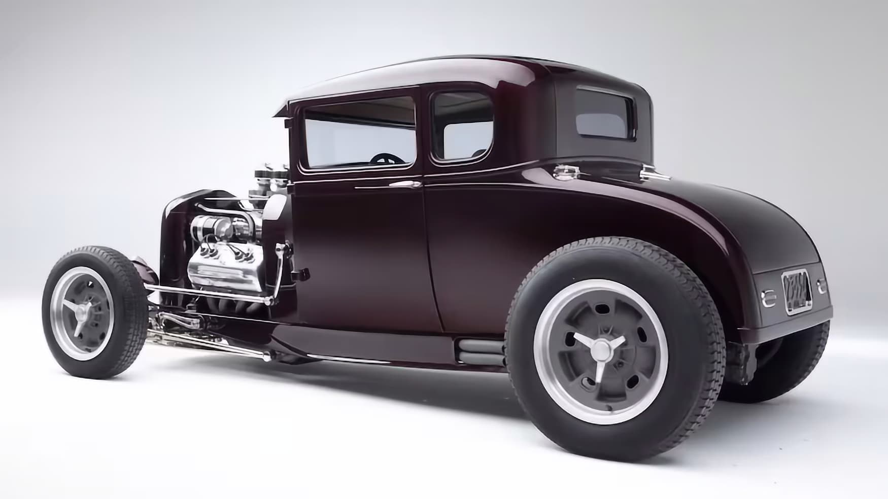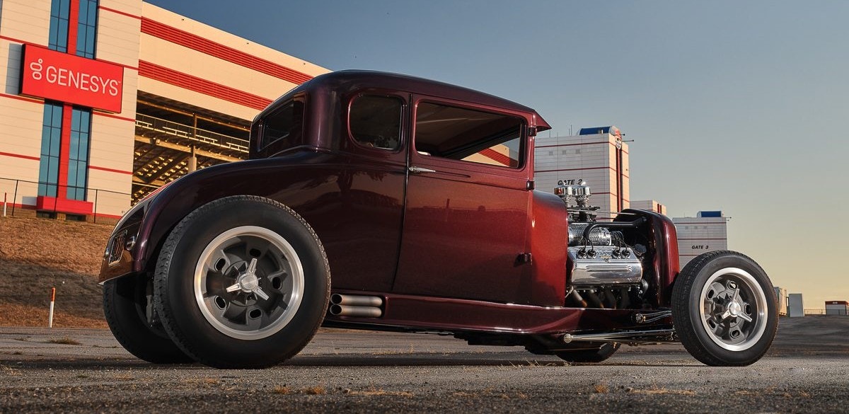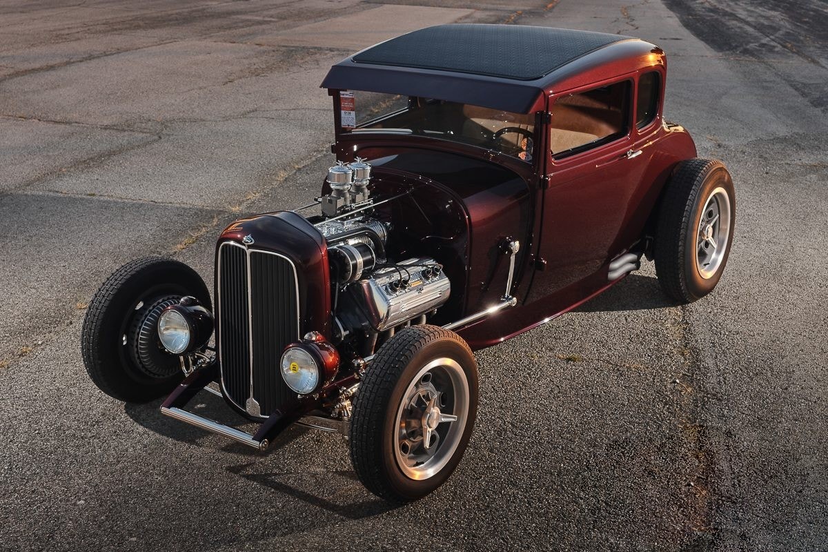 La carrosserie du Coupé Ford 1929 comporte également de nombreuses astuces, avec un toit coupé “Chopped” de 4 pouces à l’avant et 3 pouces à l’arrière, des rails de gouttières modifiés, une visière “pare-soleil” lissée, diverses lignes de caractère de carrosserie prolongées dans les portes, une coque de calandre Deuce avec un insert de style Pines et un boîtier d’immatriculation arrière en “Frenching”...