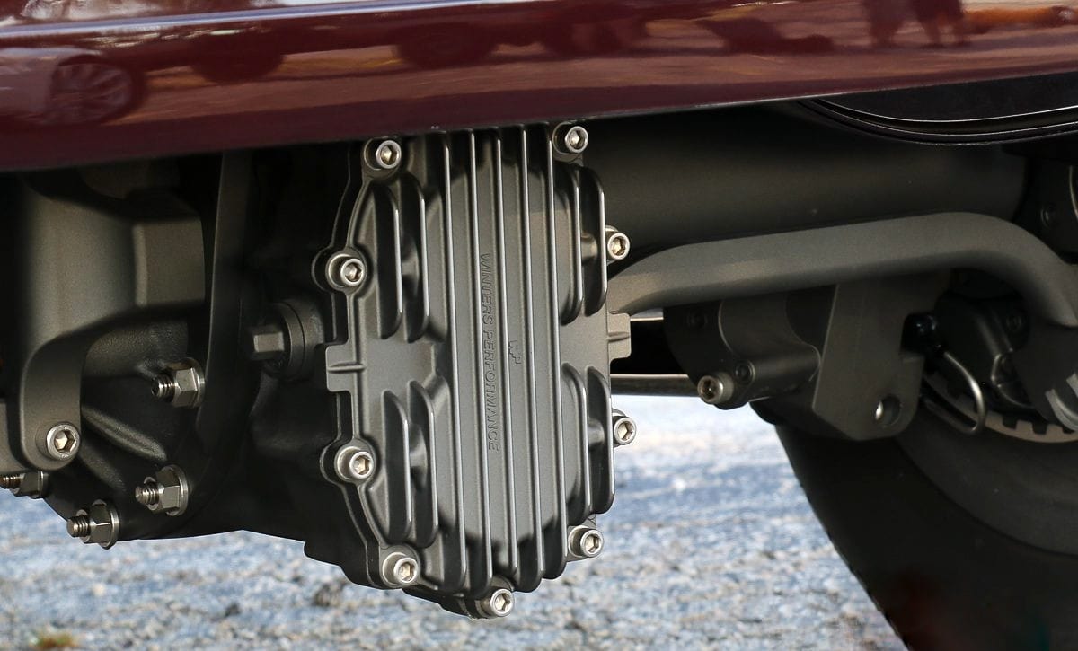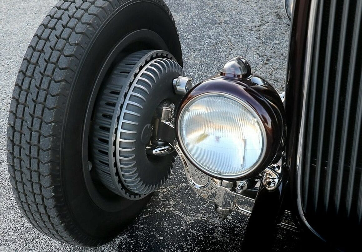 Les freins à disque “Kinmont-Safety-Stop” aux quatre roues sont une exclusivité de “Johnson’s Hot Rod Shop” ainsi que le châssis Deuce, qui est doté d’une suspension avant indépendante (très sournoise) pour compléter celle de Duntov via un essieu EVO développé et usiné par “Nate’s Hot Rod Garage”. Et tant qu’à faire, de vraies jantes “Rodders” de 16poAV et 18poAR enveloppées de caoutchoucs Coker contribuent à l’ambiance vintage.