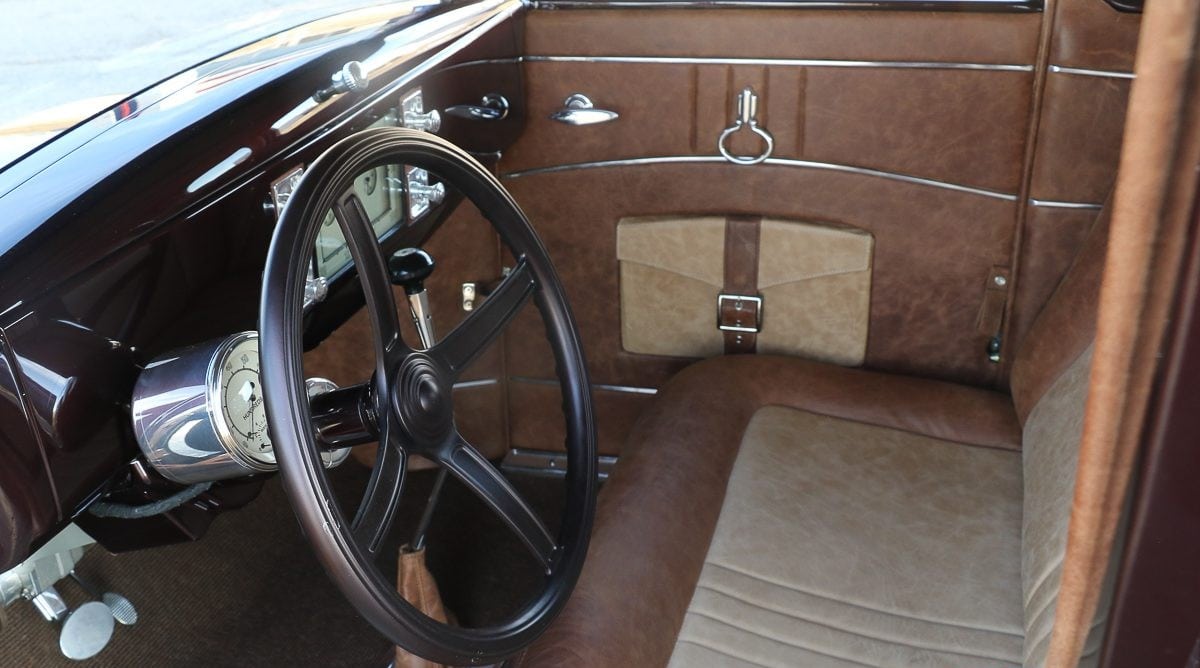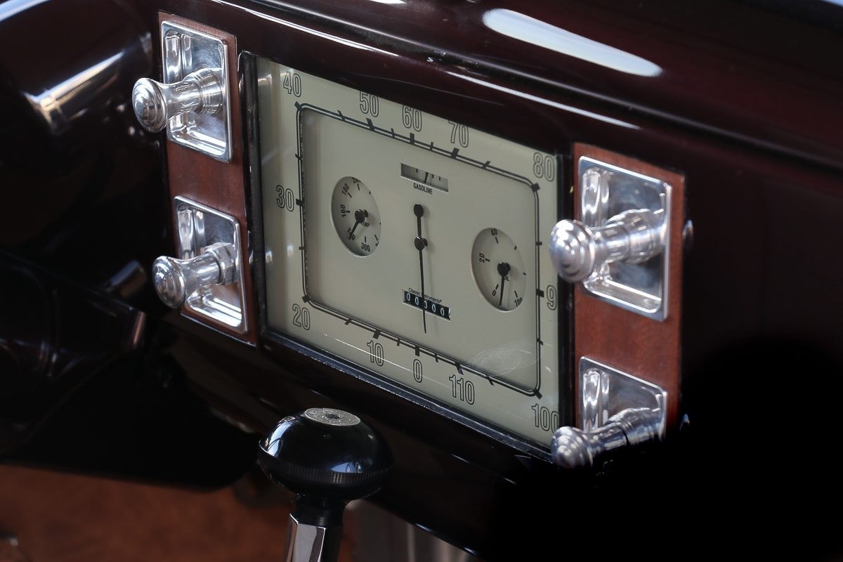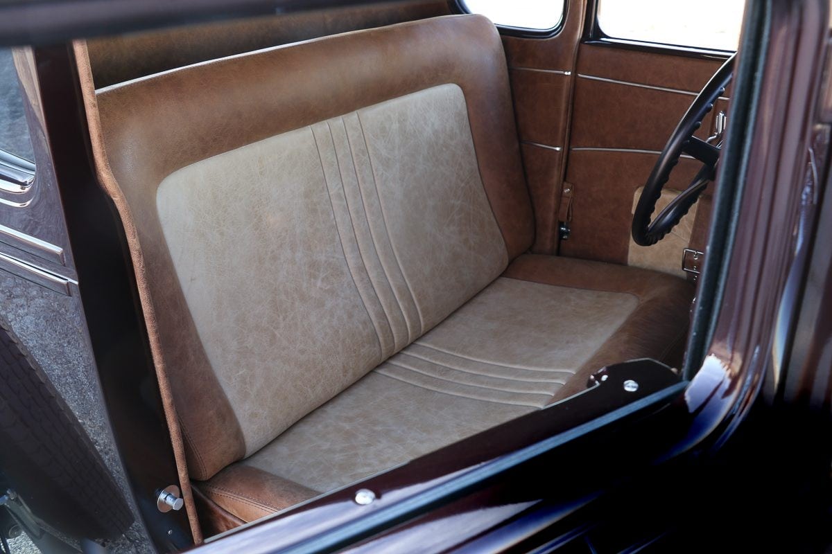 Les “choses” sont tout aussi convaincantes à l’intérieur, où un tableau de bord Ford ’38 modifié et des compteurs “Classic Instruments” personnalisées ouvrent la voie vers l’horizon… Il y a aussi une colonne de direction avec un volant également personnalisé reliés à un boîtier de direction d’époque (à levier). Pour la touche de bien-être finale, “Custom Upsellery” d’Armando, a réalisé/créé la sellerie en cuir ‘Relicate’ bicolore,…