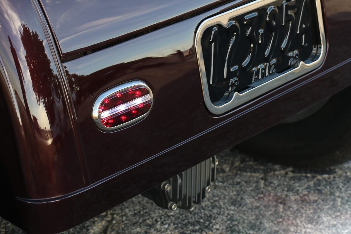 Des phares de guidage et des feux arrière uniques de style Ford ’48 (avec feux de recul invisiblement intégrés) aident à compléter le look, tout comme la magnifique finition rouge groseille PPG mélangée sur mesure avec des pincées d’amour d’autres teintes (sic et gag !) pour obtenir “de l’unique plus qu’unique” ensuite verni et reverni façon miroir… Certes c’est un tantinet Kitch voire Kitchissime…
