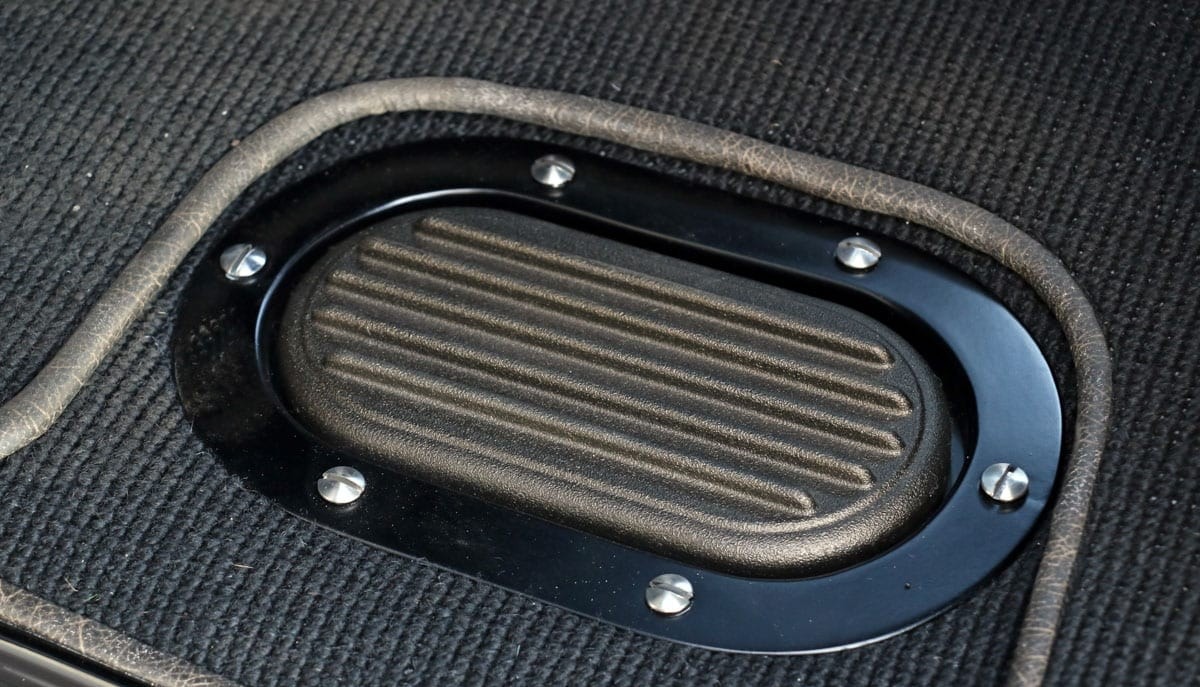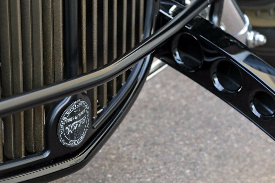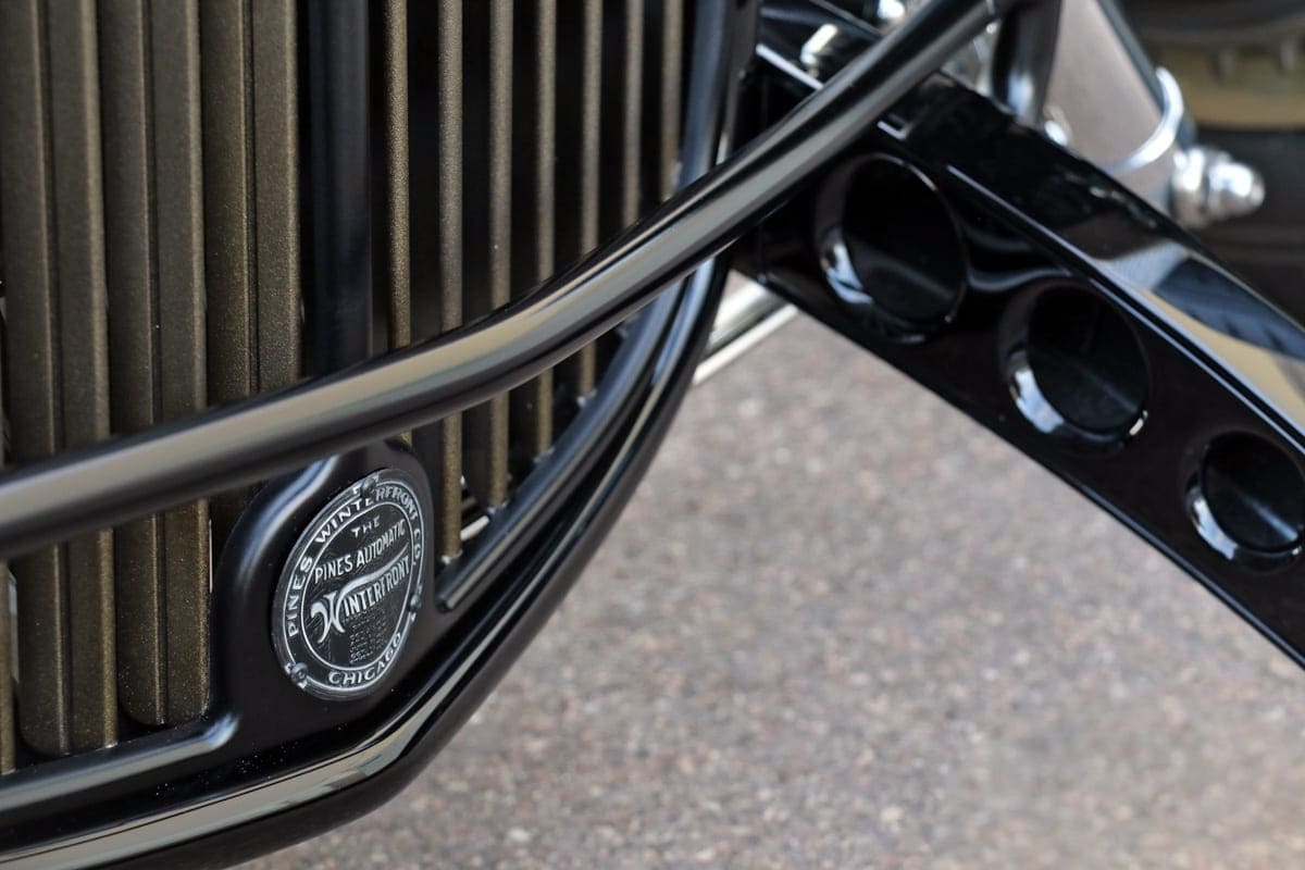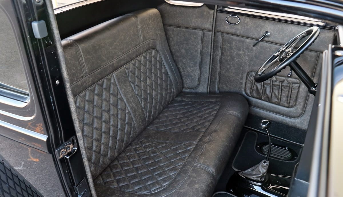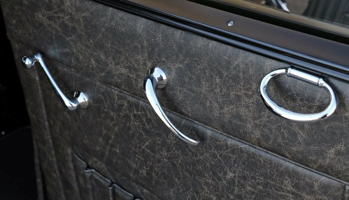 L’équipe de Steadfast a fabriqué un insert en acier affleurant. Il se distingue par une finition satinée, ainsi que par un panneau à persiennes galbées sur le côté intérieur. “Personne n’en a jamais fait de cette façon, il a donc fallu beaucoup de recherche et développement” m’a expliqué Henry… D’autres modifications de carrosserie comprennent un capot sectionné, des coins de carrosserie arrière personnalisés et d’autres pincements et replis mineurs, le tout recouvert d’une finition PPG noire profonde. Des détails sympas contribuent à compléter l’attrait extérieur, notamment un insert de calandre de style “Pines Winterfront” au fini bronze d’Alumicraft, une barre des phares personnalisée en trois parties, des feux arrière ajustés de modèle A et des garnitures et des pièces de suspension nickelées de Jon Wright’s Custom Chrome. La ferronnerie se poursuit à l’intérieur avec un tunnel de transmission et un couvercle de maître-cylindre personnalisés. Henry et Norman se sont tournés vers M&M Hot Rod pour les pièces, M&M a re-conçu l’intérieur en cuir “Relicate” surpiqué en losanges vieillis sur les sièges et les panneaux des portes, les latéraux et de coffre, tous assortis. De plus, des compteurs “Classic Instruments” remplissent le tableau de bord Greening… Henry a donc été satisfait à juste titre du résultat de la construction et avait les yeux rivés sur les “Goodguys Nashville Nationals”.