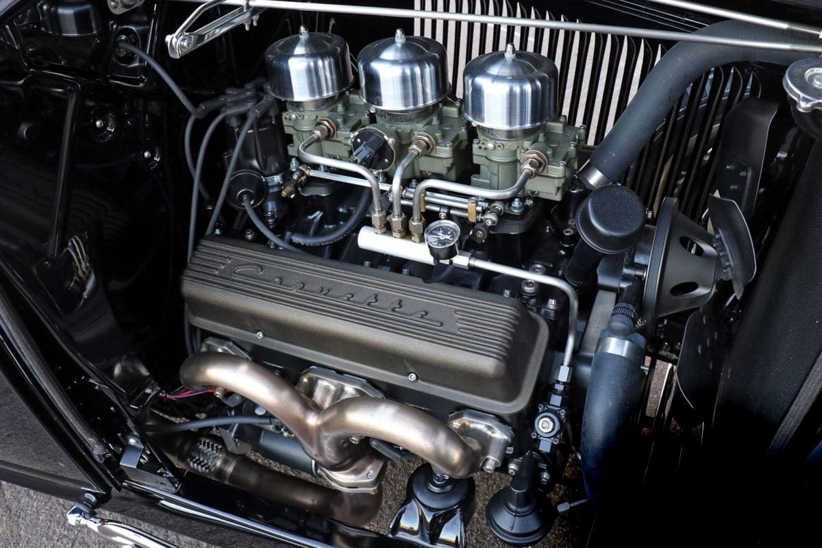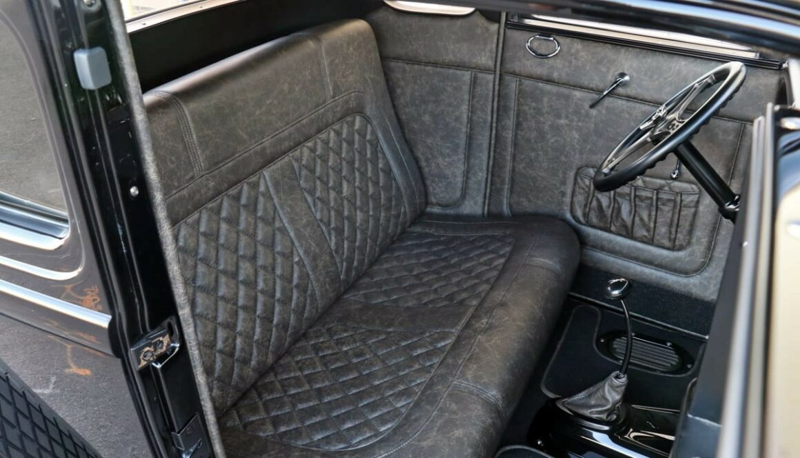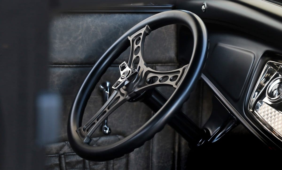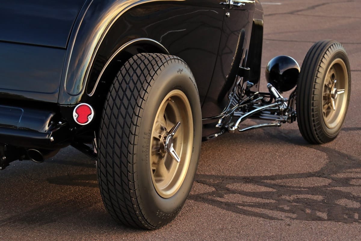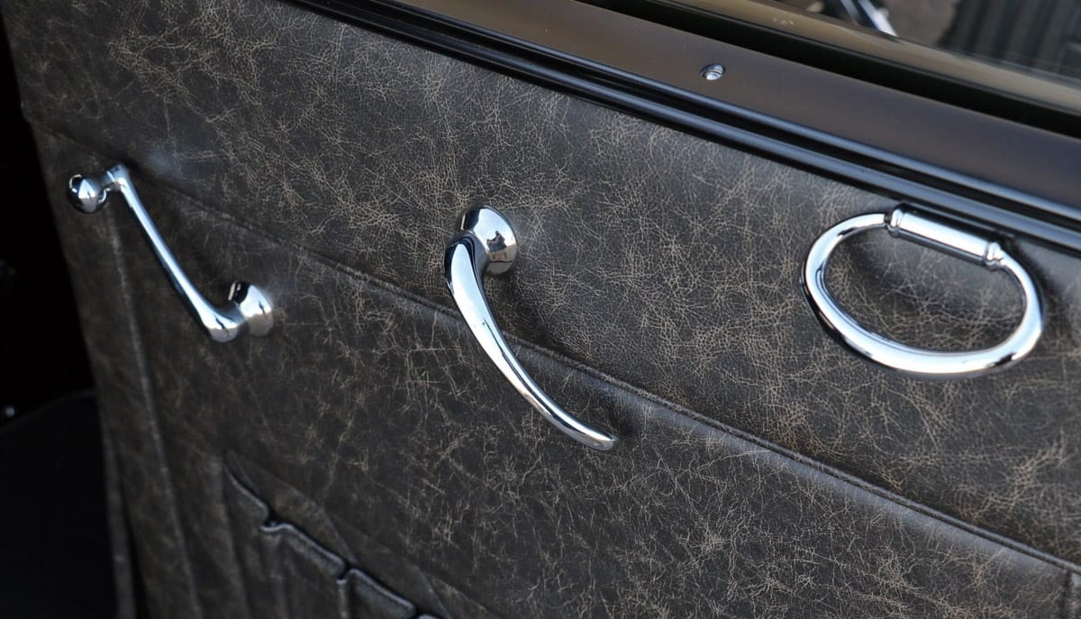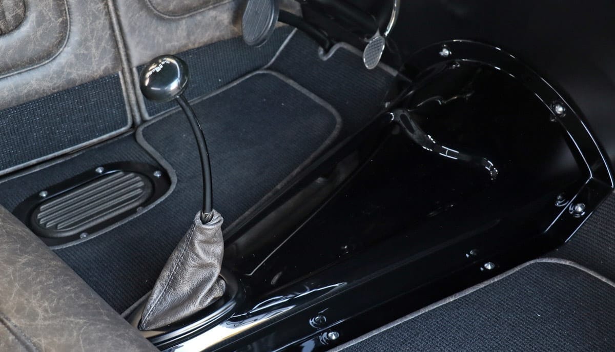 À l’arrière, un changement rapide Winters a été accroché à un ressort Posies et situé avec des barres d’échelle Pete & Jakes et des amortisseurs RideTech. Regardez attentivement et vous trouverez plus de détails, comme les supports des phares et des feux arrière encastrés, des plaques amovibles, des conduites de frein de moto, un réservoir de carburant sur mesure et des barres d’écartement (comme en BDSM) avant et arrière personnalisées. Ce sont toutes des touches subtiles qui s’additionnent pour faire une grande différence. Les freins à tambour Ford avec des caches Buick à ailettes, donnent un look traditionnel derrière les jantes Johnson’s de chez Hot Rod Shop en 16×5 et 18×8 po enveloppées de caoutchoucs Firestone… Niché entre les rails du châssis se trouve un V8 Chevrolet small bloc 383ci reconstruit par Aaron Blatter avec des cames Thumpr, un distributeur MSD et des carburateurs Rochester triple, le tout permettant de développer 425 chevaux. Les caches-soupapes Corvette et les collecteurs “en corne de bélier” en acier inoxydable brossé, gardent “les choses” discrètes car ils sont combinés à de la peinture noire. Une transmission manuelle 4 rapports 700R4 permet de monter facilement en régime et est contrôlée par un levier de vitesses Gennie. Le toit coupé “en coin” contribue à donner au coupé son attitude de bolide.