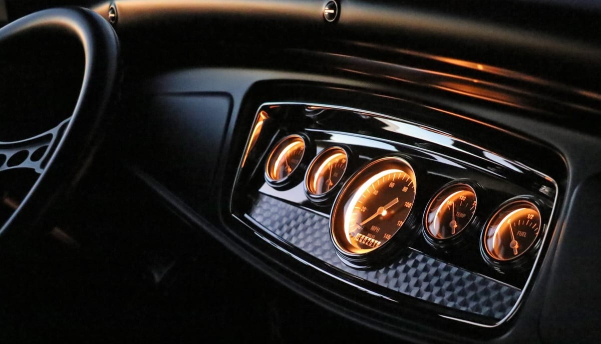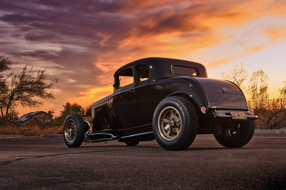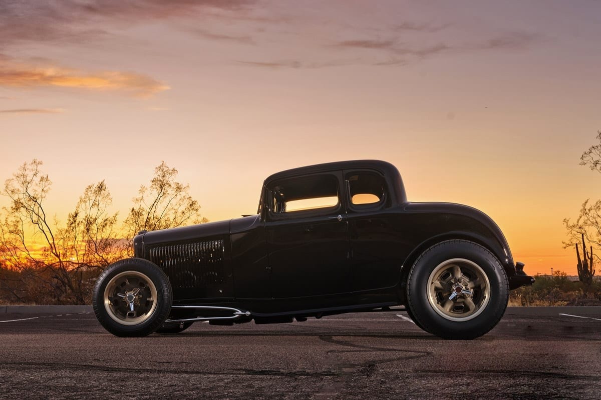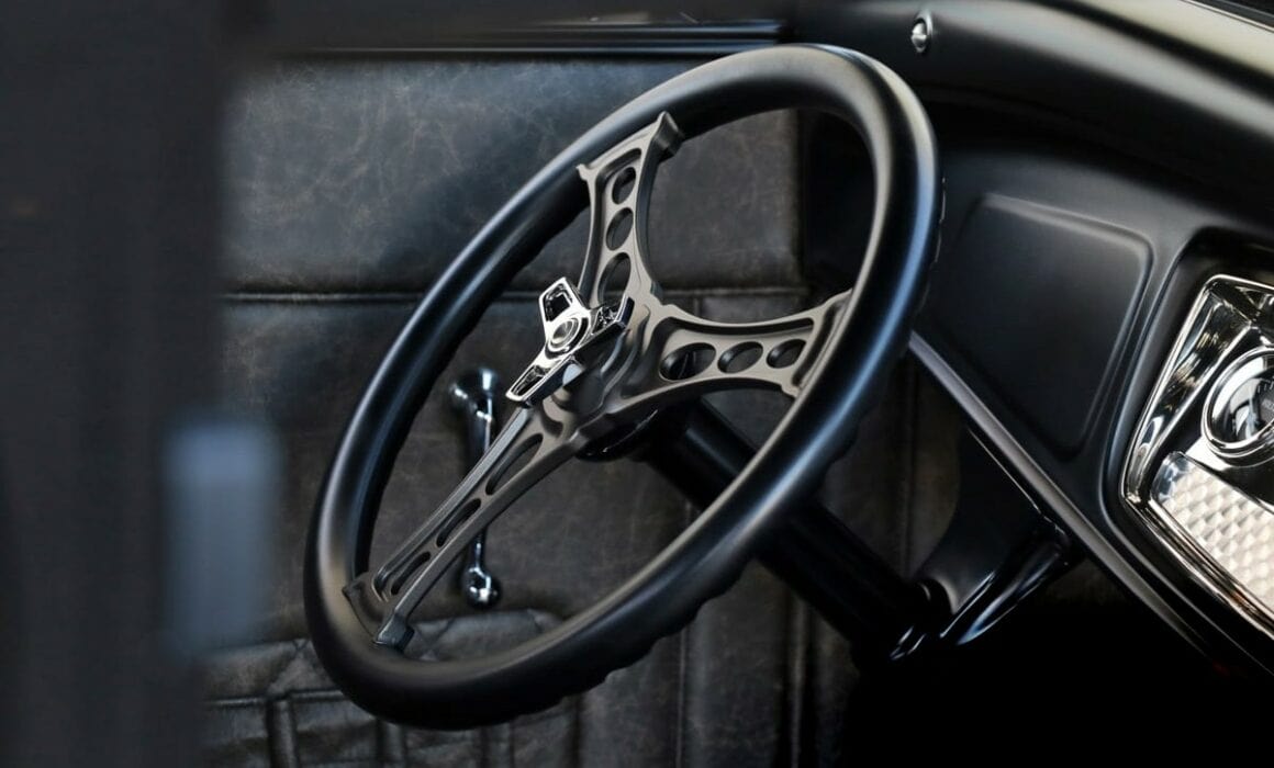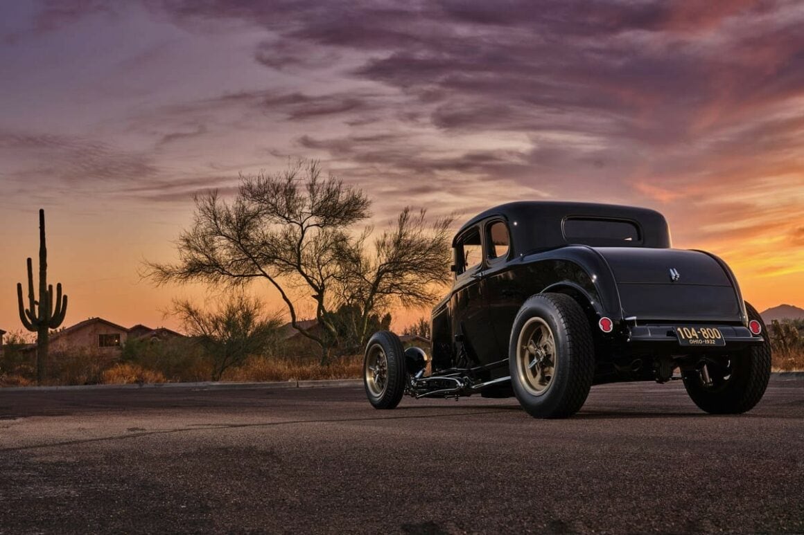 À l’arrière, un changement rapide Winters a été accroché à un ressort Posies et situé avec des barres d’échelle Pete & Jakes et des amortisseurs RideTech. Regardez attentivement et vous trouverez plus de détails, comme les supports des phares et des feux arrière encastrés, des plaques amovibles, des conduites de frein de moto, un réservoir de carburant sur mesure et des barres d’écartement (comme en BDSM) avant et arrière personnalisées. Ce sont toutes des touches subtiles qui s’additionnent pour faire une grande différence. Les freins à tambour Ford avec des caches Buick à ailettes, donnent un look traditionnel derrière les jantes Johnson’s de chez Hot Rod Shop en 16×5 et 18×8 po enveloppées de caoutchoucs Firestone… Niché entre les rails du châssis se trouve un V8 Chevrolet small bloc 383ci reconstruit par Aaron Blatter avec des cames Thumpr, un distributeur MSD et des carburateurs Rochester triple, le tout permettant de développer 425 chevaux. Les caches-soupapes Corvette et les collecteurs “en corne de bélier” en acier inoxydable brossé, gardent “les choses” discrètes car ils sont combinés à de la peinture noire. Une transmission manuelle 4 rapports 700R4 permet de monter facilement en régime et est contrôlée par un levier de vitesses Gennie. Le toit coupé “en coin” contribue à donner au coupé son attitude de bolide.