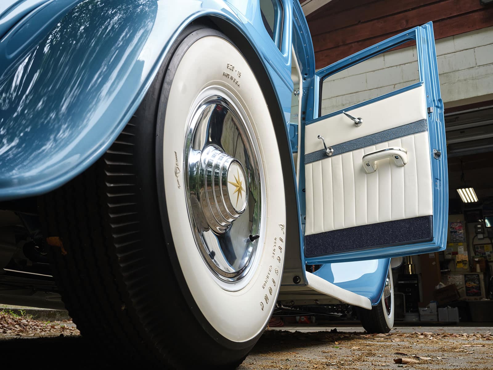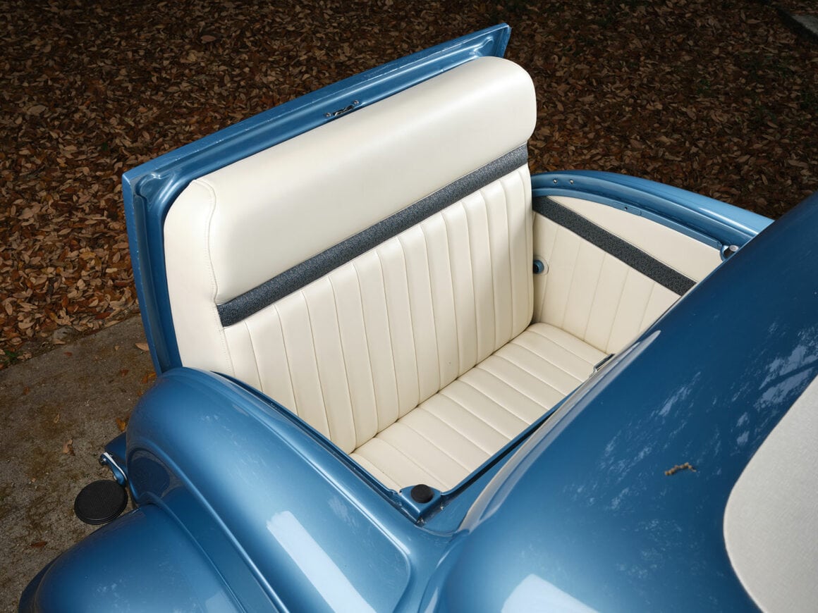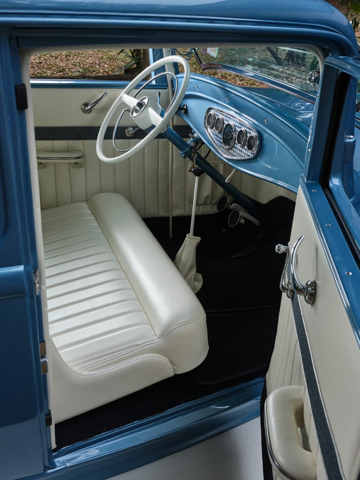 L’essieu avant est une poutre en I percée et polie qui fonctionne avec les axes Ford ’37 avec l’arrière rond. En ce qui concerne les jantes et les pneus, vous ne pouvez pas manquer les larges flancs blancs Firestone/Coker mesurant 8,20-15 pouces à l’arrière et 5,00-15 American Classics. Les jantes sont des Ford de 1936 en acier équipées d’enjoliveurs Lincoln Premiere Sunburst de 15 pouces datant de 1957. La carrosserie du coupé Ford à cinq fenêtres de 1932 présente un capot supérieur de 3 1/2 pouces ainsi que des ailes arrière coupées, la peinture est une couleur Cadillac Bahama Blue de 1958, et la carrosserie et la peinture ont été gérés par Fallen Angel Kustoms. Notez également l’utilisation de Naugahyde blanc sur les couvercles de marchepied ainsi que sur l’insert de toit. Et en parlant de blanc, il convient de noter que le dessous complet du coupé est peint en blanc brillant et comporte beaucoup de chrome et de quincaillerie en acier inoxydable poli. Le capot est principalement en tôle d’origine, mais le coupé fonctionne sans panneaux latéraux.