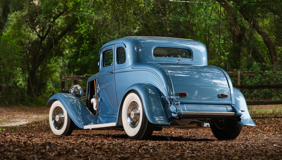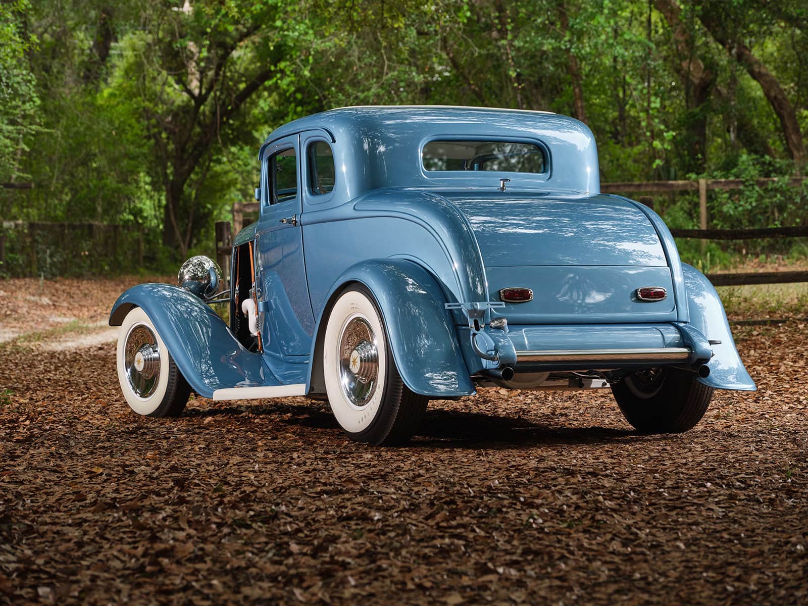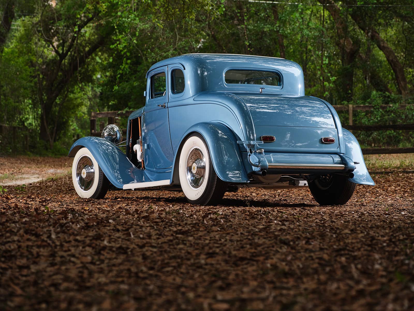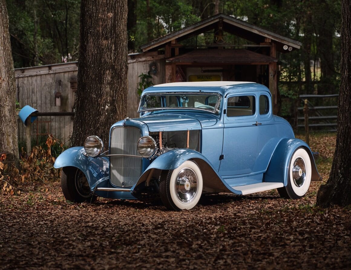 L’essieu avant est une poutre en I percée et polie qui fonctionne avec les axes Ford ’37 avec l’arrière rond. En ce qui concerne les jantes et les pneus, vous ne pouvez pas manquer les larges flancs blancs Firestone/Coker mesurant 8,20-15 pouces à l’arrière et 5,00-15 American Classics. Les jantes sont des Ford de 1936 en acier équipées d’enjoliveurs Lincoln Premiere Sunburst de 15 pouces datant de 1957. La carrosserie du coupé Ford à cinq fenêtres de 1932 présente un capot supérieur de 3 1/2 pouces ainsi que des ailes arrière coupées, la peinture est une couleur Cadillac Bahama Blue de 1958, et la carrosserie et la peinture ont été gérés par Fallen Angel Kustoms. Notez également l’utilisation de Naugahyde blanc sur les couvercles de marchepied ainsi que sur l’insert de toit. Et en parlant de blanc, il convient de noter que le dessous complet du coupé est peint en blanc brillant et comporte beaucoup de chrome et de quincaillerie en acier inoxydable poli. Le capot est principalement en tôle d’origine, mais le coupé fonctionne sans panneaux latéraux.