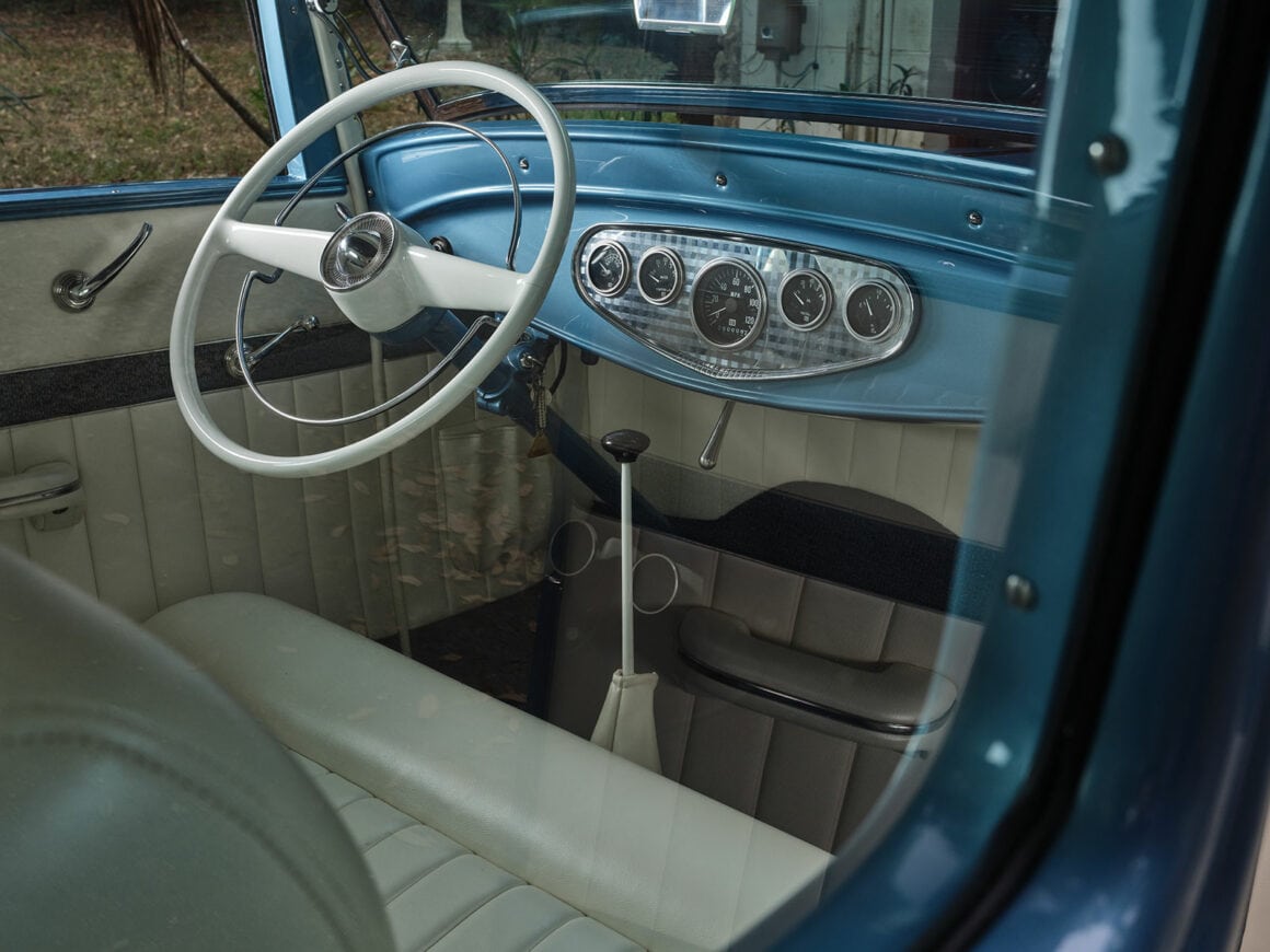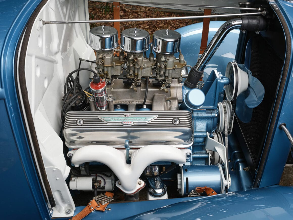 Le coupé Ford Five Window Deuce que vous voyez devant vous présente le travail de trois ateliers de Hot-Rods remarquables : Ionia Hot Rod Shop s’est occupé du châssis personnalisé unique, la carrosserie et la peinture ont été gérées par Fallen Angel Kustoms avec Butch Miller pulvérisant la teinte Cadillac Bahama Blue 1958 tandis que l’ensemble du coupé Deuce a été assemblé par Thomas Ophof de SaltWorks Fabrication. Le public se demande toujours ce qu’il y a sous le capot. Dans ce cas, le petit coupé Deuce avec un flair personnalisé incomparable arbore un V8 Ford vraiment vintage avec un bloc en Y de 292ci. C’était la contribution de Ford au marché de la performance après le retrait du V8 Flathead en 1953. En 1954, le bloc Y a été introduit et est resté commercialisé jusqu’en 1964. Commençant comme un V8 de 212cv, le bloc en fer et ses culasses de même ont été refaits par Ted Eaton et le V8 développe maintenant 330 cv. On repére le tri-power Ford composé de trois carburateurs Holley à deux corps (un carbu primaire, ECG ; et deux secondaires, EBU).
