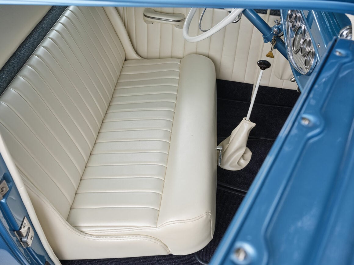 Tous sont boulonnés sur un collecteur d’admission Offenhauser et utilisant trois Bell Top avec filtres à air chromés à écran. L’allumage se fait par l’intermédiaire d’un distributeur Hunt et d’une paire de collecteurs d’échappement Ford F100 de 1956 sortent les gaz usés qui se déversent dans un échappement en acier inoxydable de 2 pouces, puis passent par les silencieux Porter. D’autres accessoires de moteur incluent la pompe à eau Ford et le ventilateur mécanique déplacé sur un support surélevé et à partir de là, un alternateur Powermaster et une batterie Interstate sont utilisés. Le bloc Y est assorti d’une transmission TREMEC à 5 vitesses surmontée d’un manche et d’un pommeau Ford de 1937 qui renvoie à un pont AR Ford de 1958 qui fait tourner un ensemble de vitesses de 3,73… En ce qui concerne l’arrière, c’est Ionia Hot Rod Shop qui a fabriqué les composants de suspension. À l’avant, un boîtier de direction et une colonne Ford de 1956 sont utilisés, ainsi que des ressorts à lames transversaux à l’arrière ainsi que des freins Ford AV et AR.