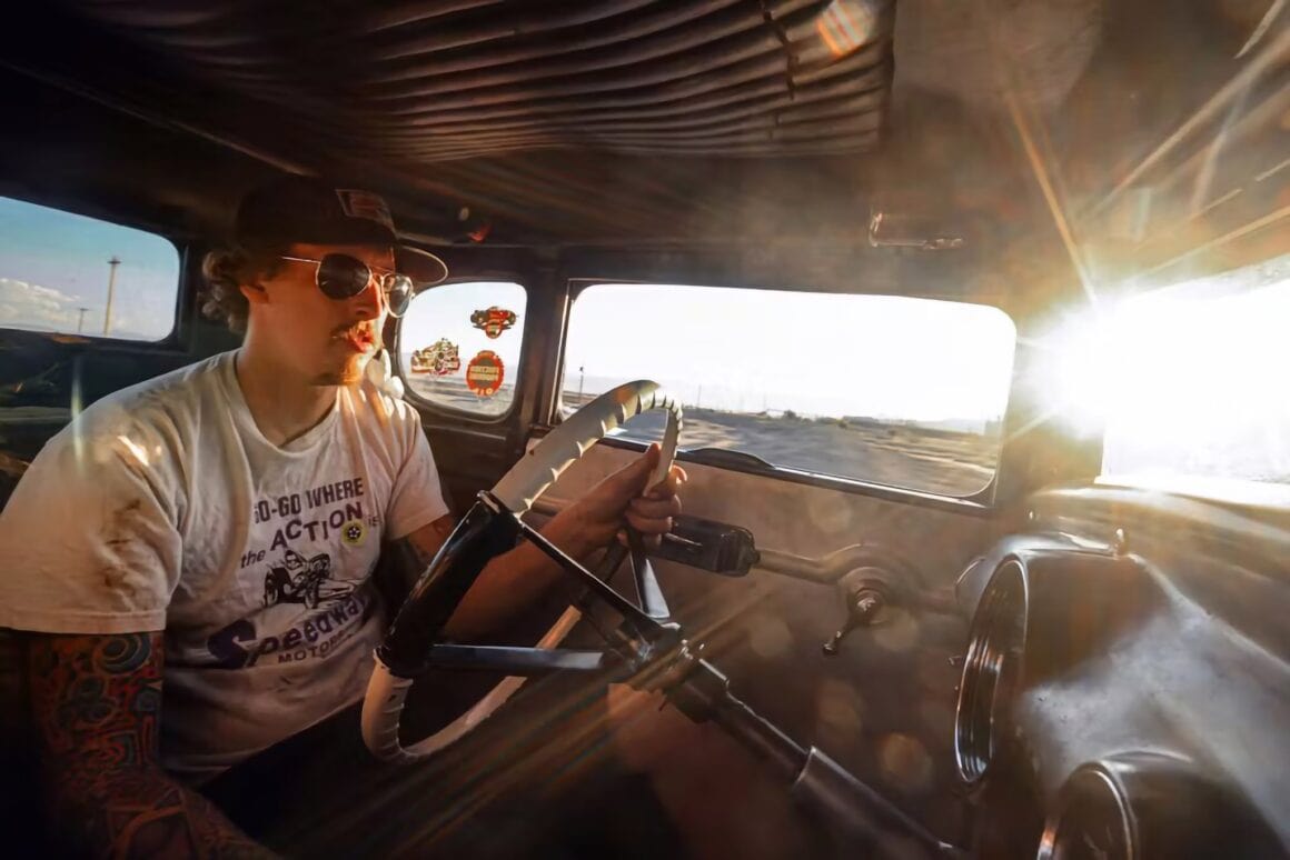 Cela permet de garder la puissance gérable tout en économisant du carburant sur l’autoroute. Pas mal si l’on considère que son aérodynamisme, comme le dit Hansen, est comme “un grand parachute avec une visière dessus”. Il peut conduire la voiture à travers le pays et n’utiliser que le carburateur central. Une fois que l’accélérateur dépasse 50 %, les carburateurs extérieurs commencent à s’ouvrir. C’est à ce moment-là que les choses commencent à devenir amusantes. “Dès que les secondaires s’ouvrent, le compresseur peut devenir efficace” m’a expliqué Hansen. Le V8 Flathead boosté est bon pour environ 300 chevaux, ce qui est plus que suffisant. Les panneaux de porte et les panneaux de protection ont été fabriqués en aluminium et estampés avec un Pullmax.