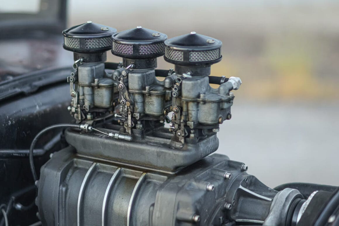 C’est pour les faire ressembler à des pièces moulées brutes. Les revêtements “Trail Performance” ont enduit de poudre le compresseur et les têtes pour leur donner un aspect “magnésium”. Bien que vous puissiez penser que les ailettes des pièces moulées sont nues, elles sont également finies avec un revêtement en poudre satiné transparent… Les carbus Holley 94 sont les deux “canons” de prédilection de Hansen. Leur longue production rend les pièces faciles et bon marché à trouver, et il semble avoir un don pour les régler. Les trois carburateurs, chacun surmonté d’un filtre à air “Grace & Co”., utilisent une tringlerie progressive qui permet au V8 Flathead de fonctionner sur le carburateur central pendant la première moitié de la course de l’accélérateur.