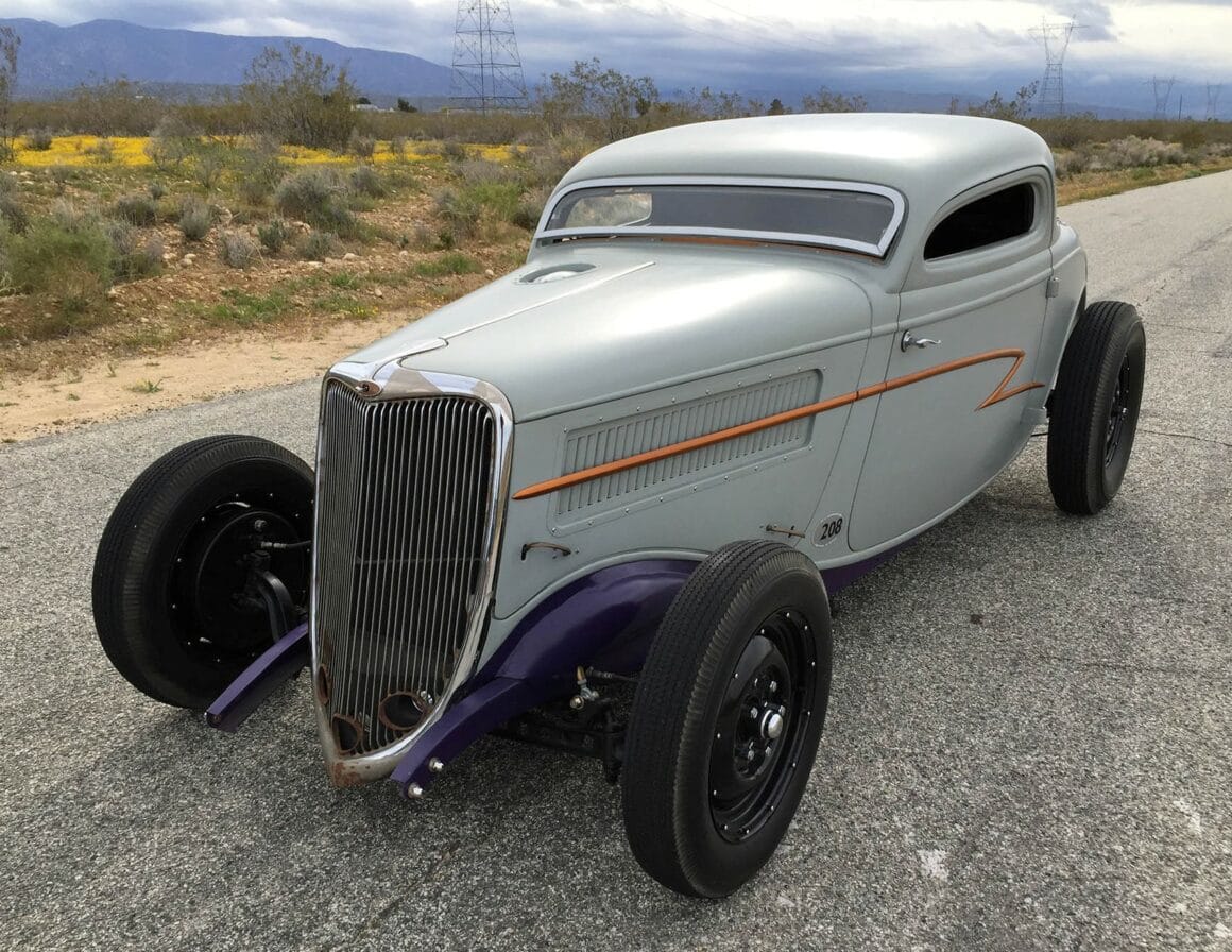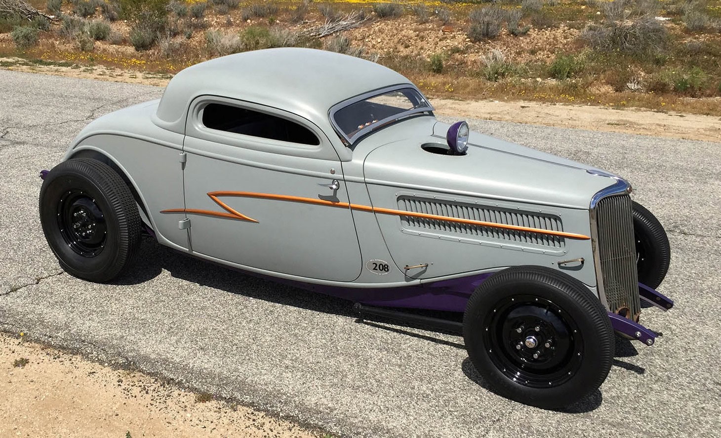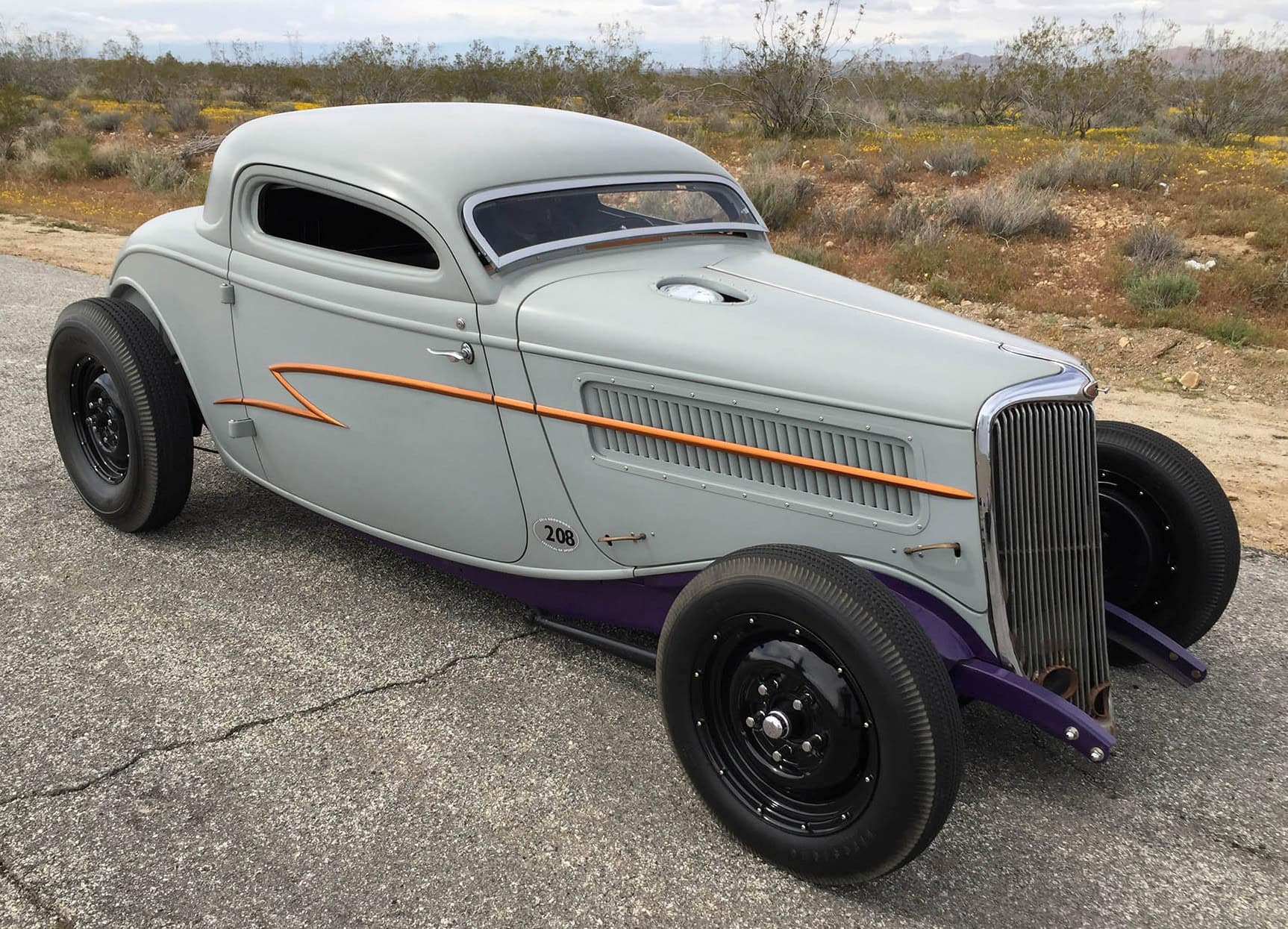 En ce qui concerne le langage dit “corporel”, le coupé a un lourd clapot supérieur de cinq pouces avec le pare-brise allongé dans le style du célèbre coupé So-Cal d’Alex Xydias. Mick Jenkins de Micks Paint lui a donné une dose d’apprêt gris soulignée de garnitures en cuivre et de soubassements violets. Le châssis est essentiellement Ford’34 avec des ressorts transversaux, cependant, il a été mis à jour avec un essieu arrière disposant d’un quick-change Winters.