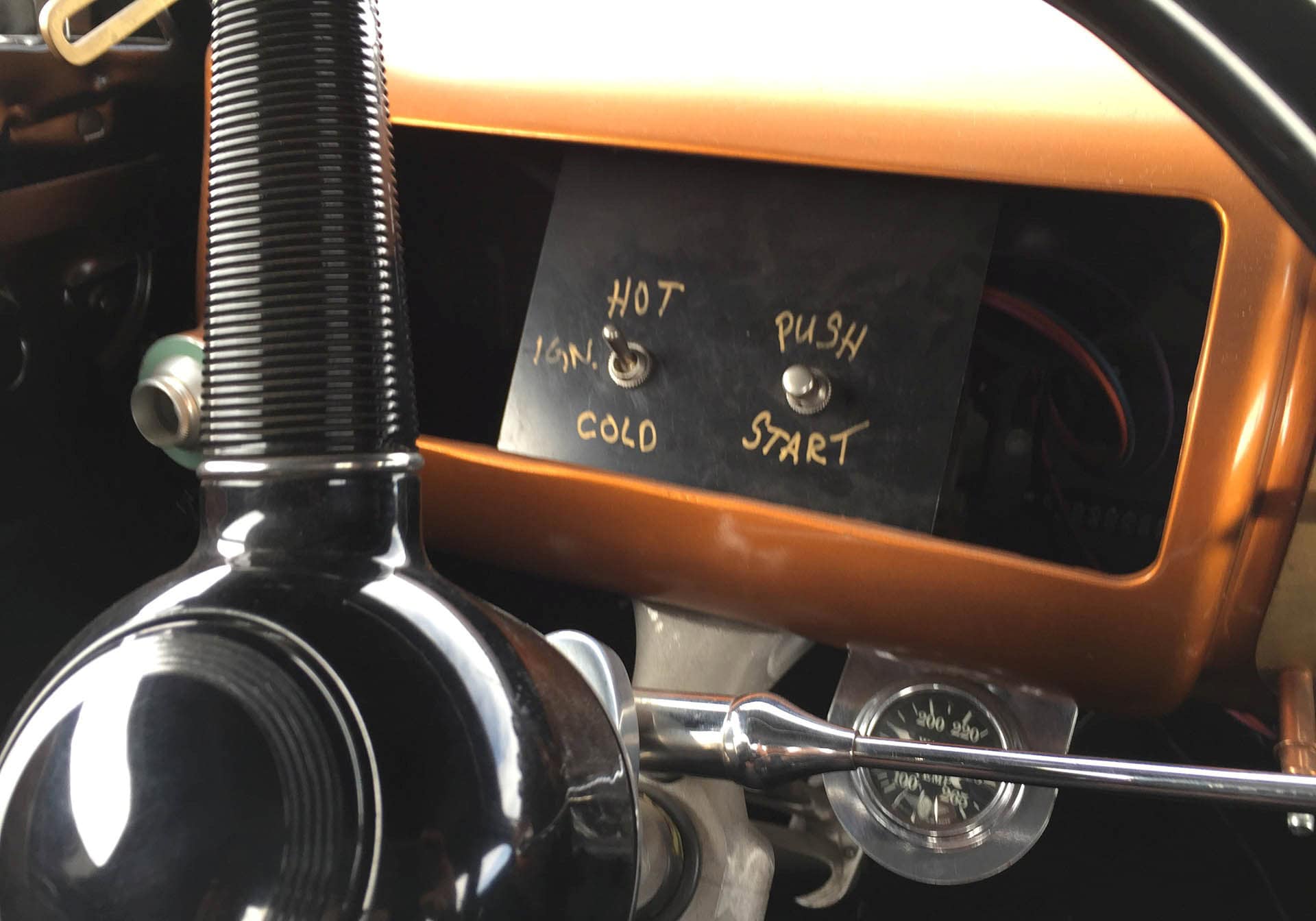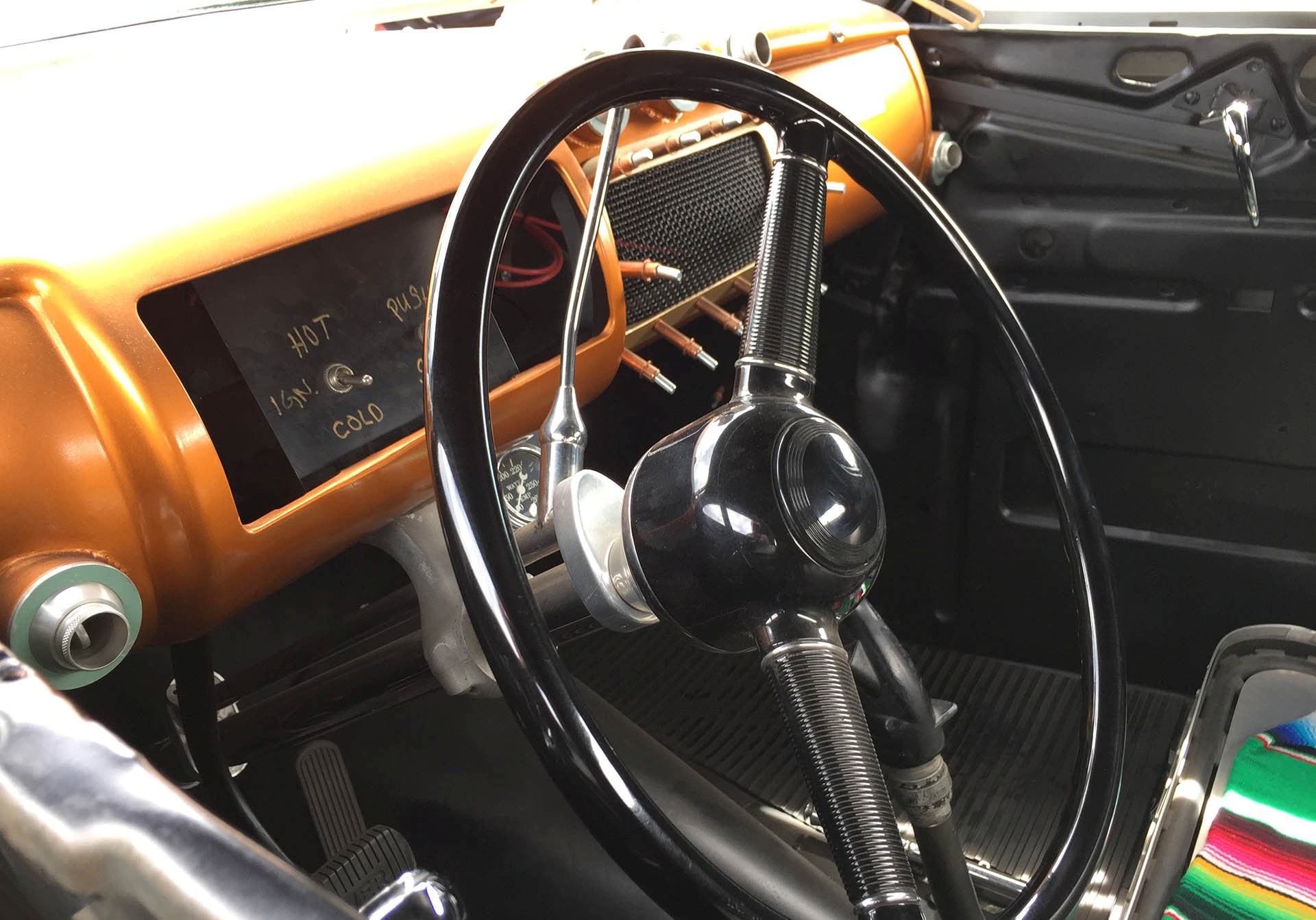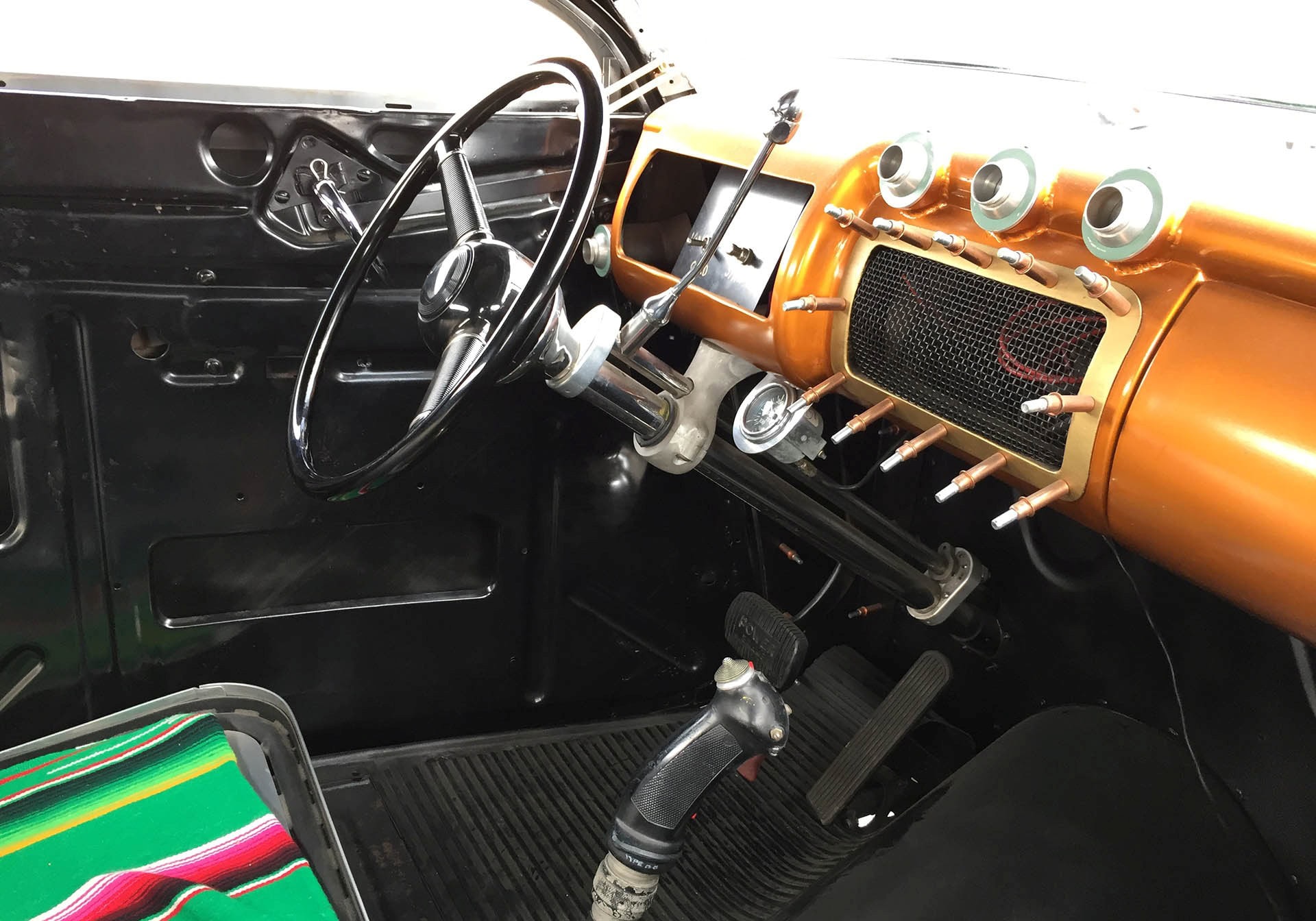Des amortisseurs tubulaires SO-CAL ont été installés. Les jantes sont des Vintage en 16po bien chaussées. À l’intérieur, le coupé est aussi simple que possible avec une banquette en aluminium de style bomber avec une couverture mexicaine, un tableau de bord peint en or provenant d’une Ford’40 accompagnés d’un volant de la même époque. Plus moderne est le levier de vitesses, qui est un manche de commande d’hélicoptère…