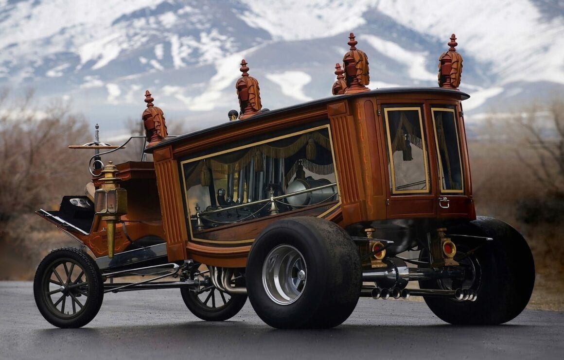 Dans sa version originelle, c’était un chariot d’enterrement en bois des années 1850 tiré par des chevaux, fabriqué par la société Cunningham de New York…, qui aurait transporté Bob Younger, membre du James Gang, sur la fameuse “Boot Hill”. Doté de moulures sculptées, de dorures et d’une ornementation fantasque, comprenant un ensemble de lampes en laiton datant de la fin du 18ème siècle, le corbillard est équipé de tout l’équipement funéraire approprié, y compris des rideaux de velours à pampilles et les rails destinés à accueillir le cercueil. La suspension rigide chromée dispose du système de direction simpliste d’une Volkswagen Beetle’63…, à l’arrière, une paire de ressorts à lames elliptiques supporte un essieu rigide d’une Ford 1948…