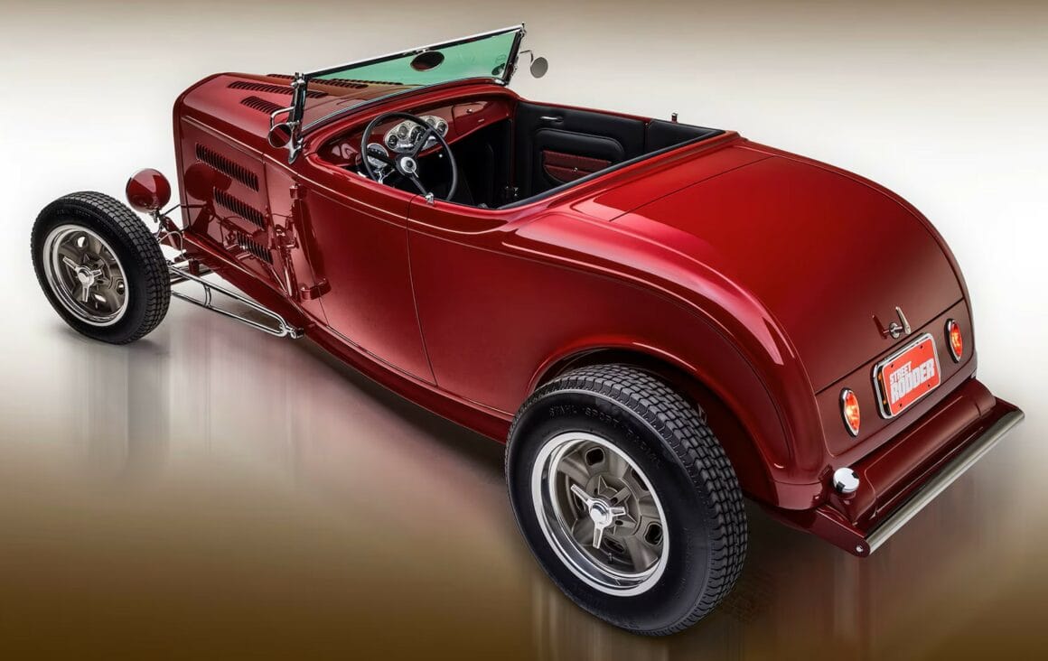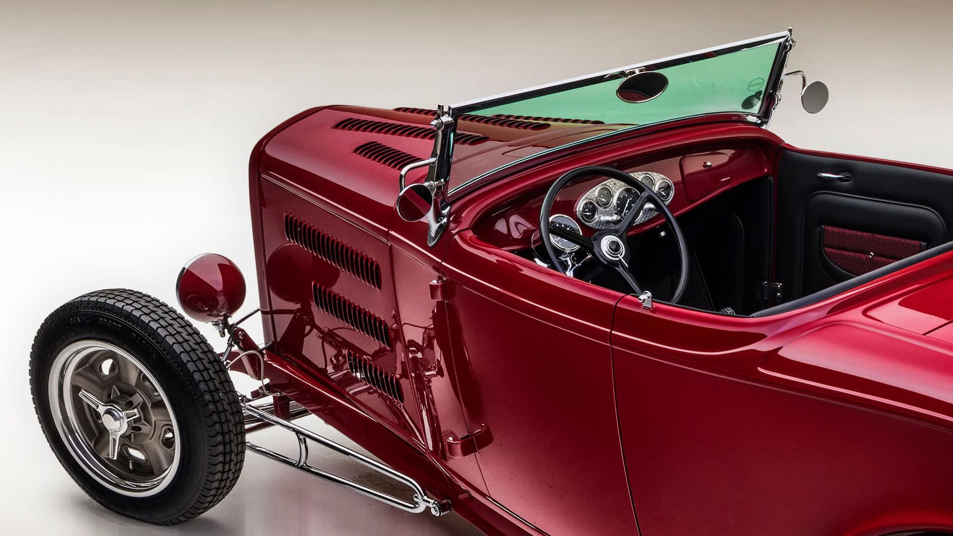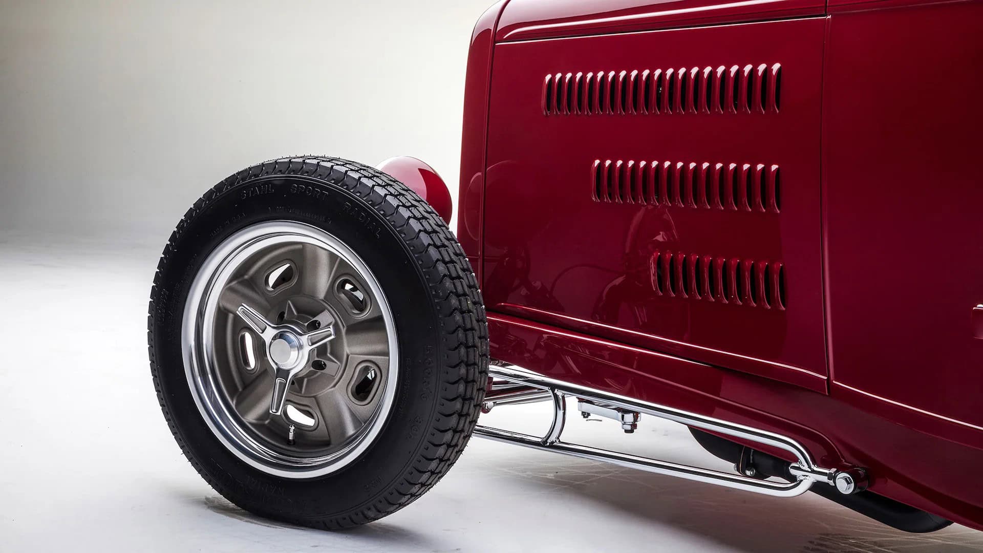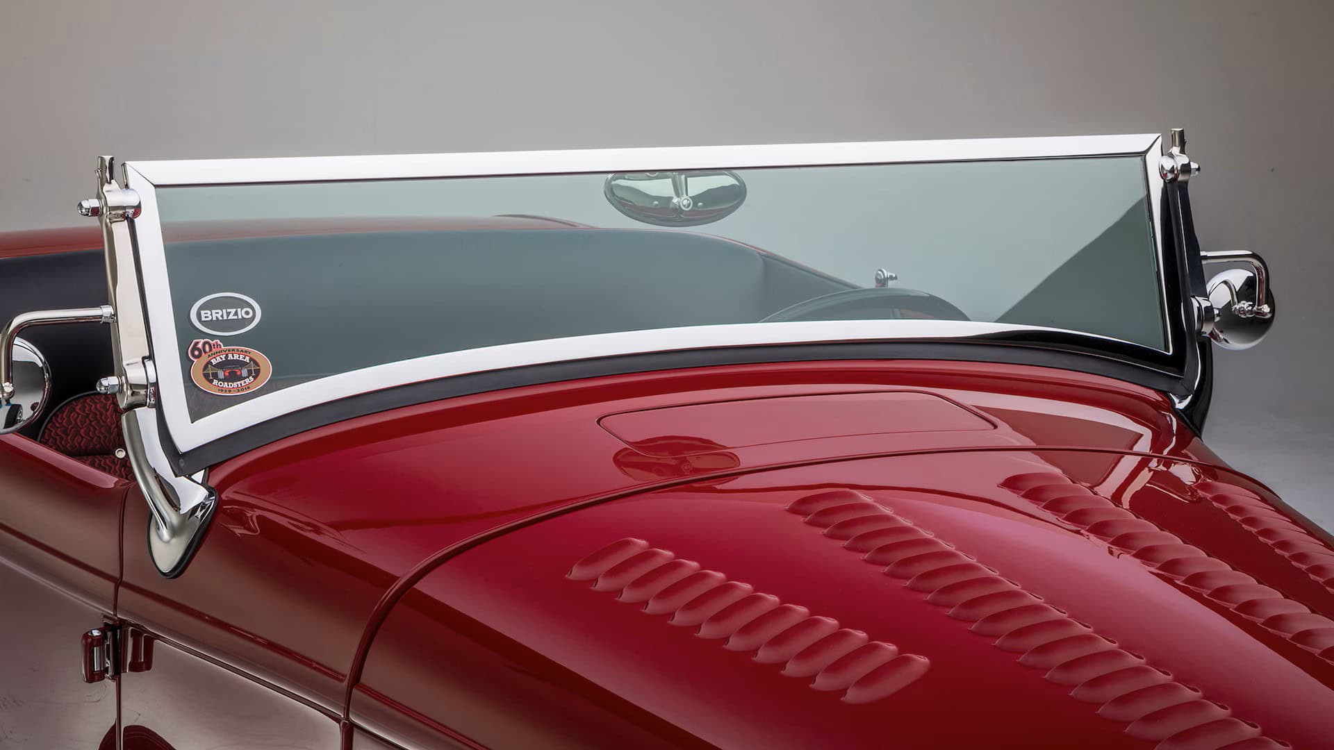 Des combinés filetés arrière QA1, ainsi que des barres Panhard construites par Brizio et des barres antiroulis So-Cal Speed Shop aux deux extrémités, complètent l’ensemble de suspension. Les freins à disque avant Wilwood de 12 pouces associés aux tambours arrière Currie garantissent une puissance de freinage fiable. Ni Roy Brizio ni Joe Rebozzi ne voulaient de modifications de carrosserie radicales qui éloigneraient ce Hot Rod Deuce du design qui en avait fait des classiques en premier lieu. Mais ce roadster a un tas de détails qui affinent son apparence extérieure. La carrosserie en acier de chez Brookville a été étirée d’un pouce à l’avant et la calandre Dan Fink a été abaissée d’un pouce. Trois pouces et demi ont été coupés des montants du pare-brise. Le capot en aluminium en trois parties de chez Jack Hageman a été perforé de 150 persiennes. Les phares So-Cal, les feux arrière Ford étaient des choix plus classiques.