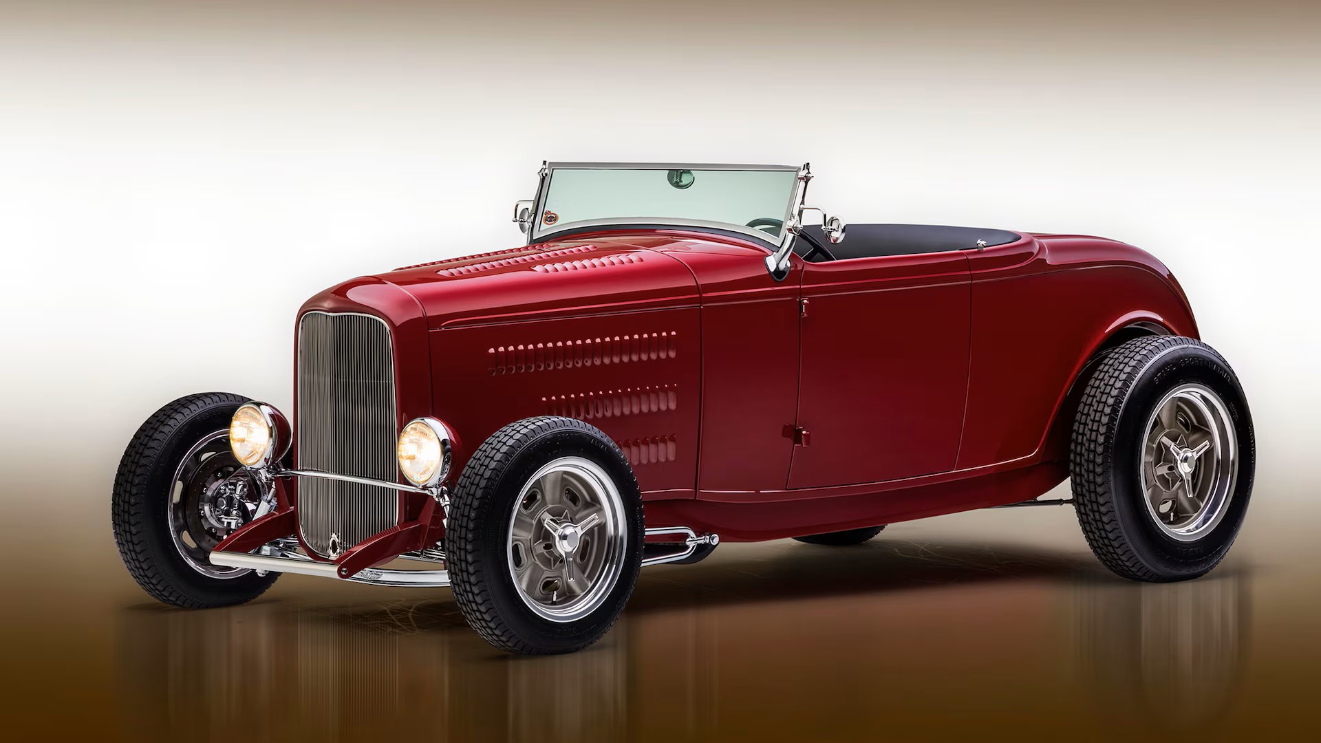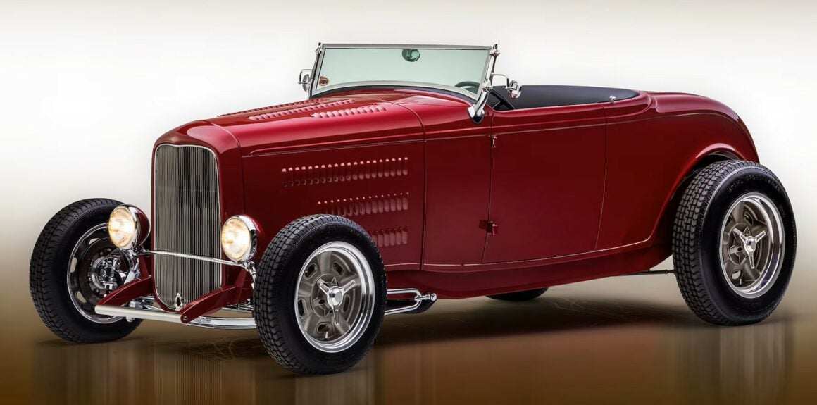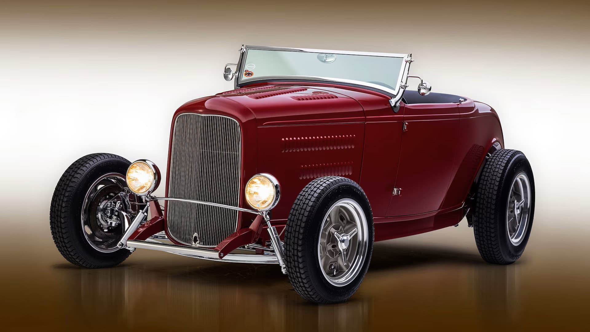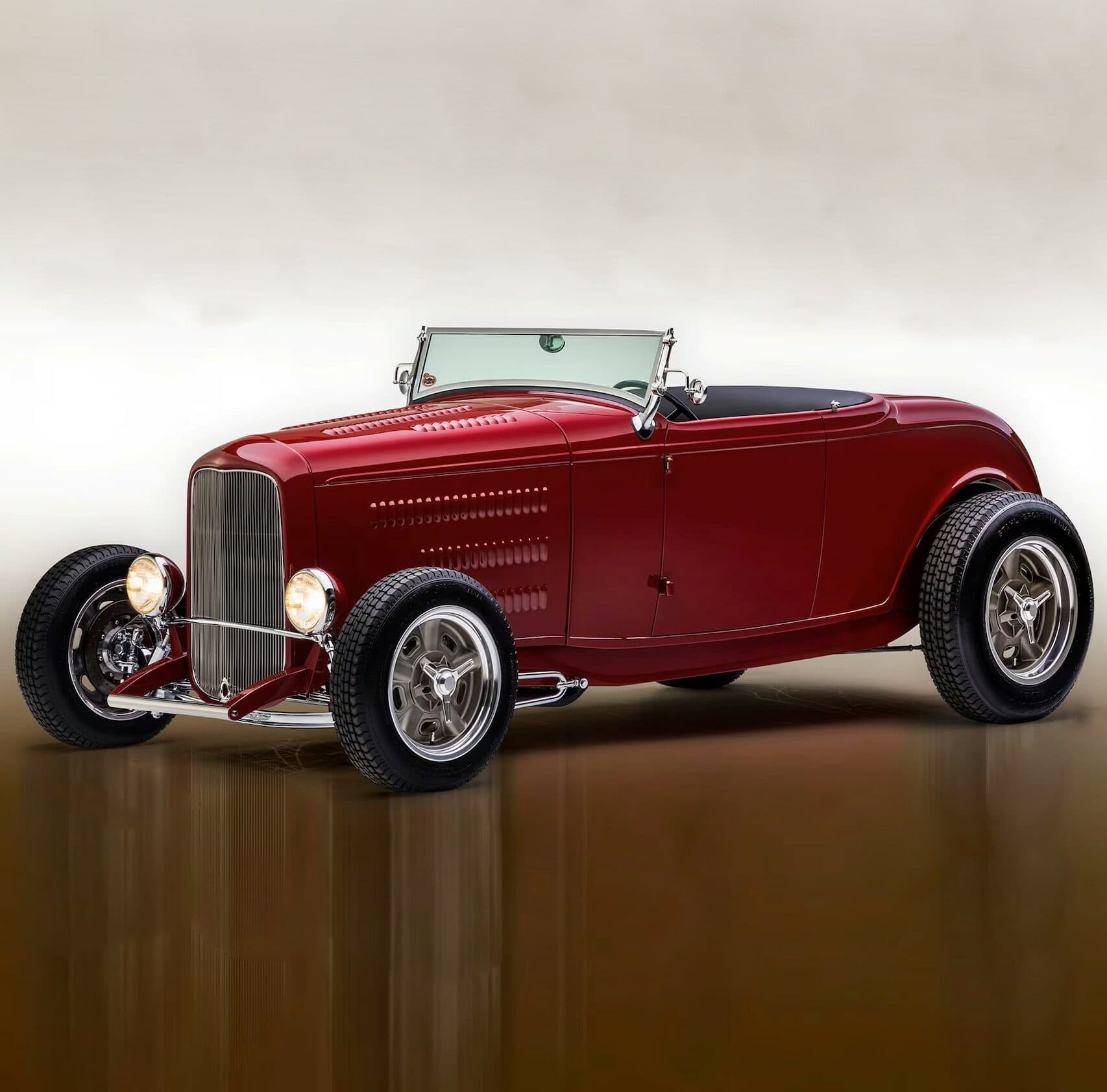 Des combinés filetés arrière QA1, ainsi que des barres Panhard construites par Brizio et des barres antiroulis So-Cal Speed Shop aux deux extrémités, complètent l’ensemble de suspension. Les freins à disque avant Wilwood de 12 pouces associés aux tambours arrière Currie garantissent une puissance de freinage fiable. Ni Roy Brizio ni Joe Rebozzi ne voulaient de modifications de carrosserie radicales qui éloigneraient ce Hot Rod Deuce du design qui en avait fait des classiques en premier lieu. Mais ce roadster a un tas de détails qui affinent son apparence extérieure. La carrosserie en acier de chez Brookville a été étirée d’un pouce à l’avant et la calandre Dan Fink a été abaissée d’un pouce. Trois pouces et demi ont été coupés des montants du pare-brise. Le capot en aluminium en trois parties de chez Jack Hageman a été perforé de 150 persiennes. Les phares So-Cal, les feux arrière Ford étaient des choix plus classiques.