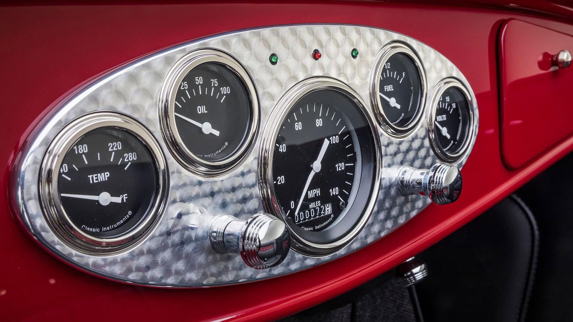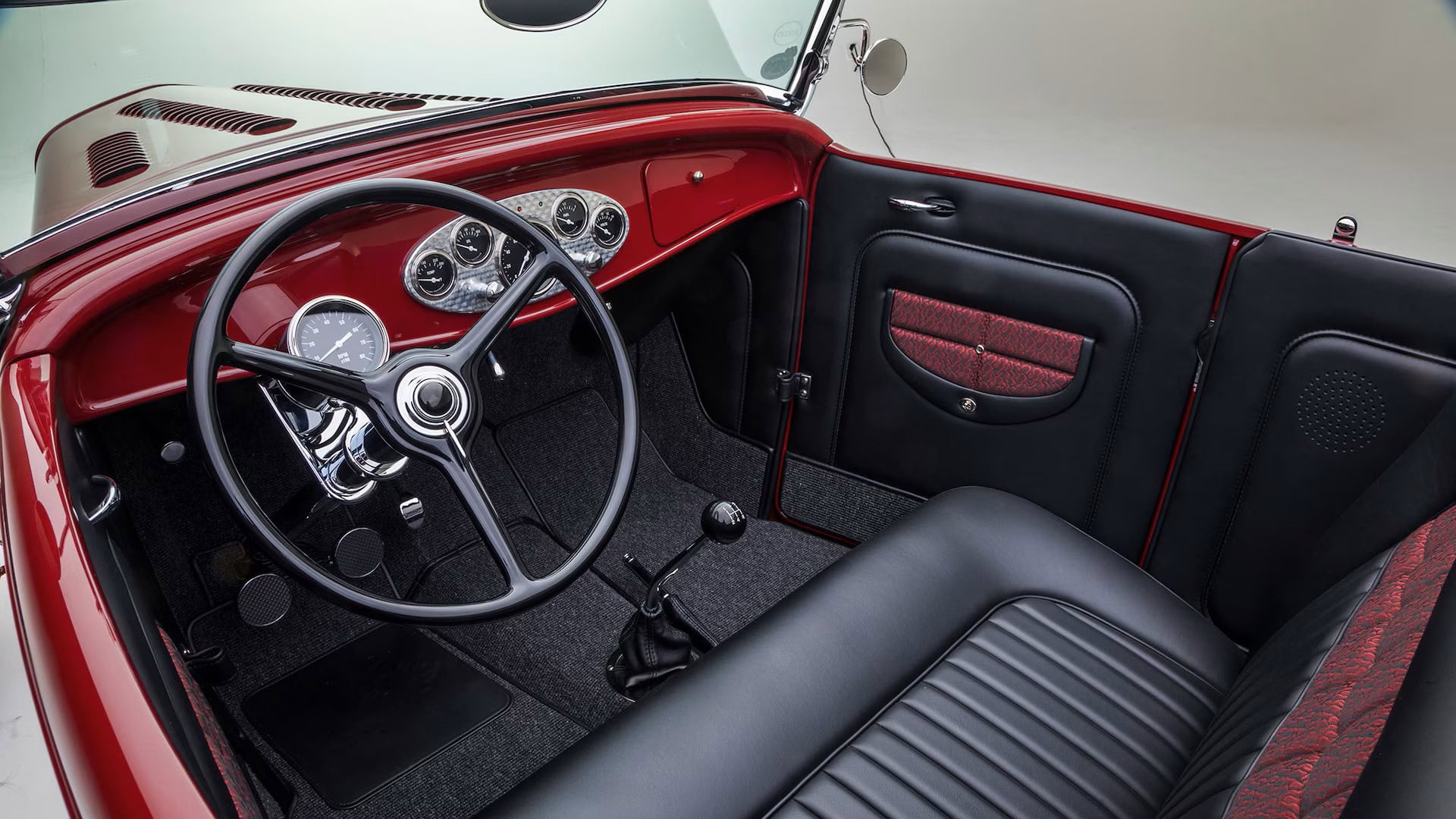 La transmission à cinq vitesses Tremec avec un embrayage et un volant d’inertie Modern Driveline transmettent le couple du V8 383ci à un arbre de transmission de service de transmission en route vers l’arrière Currie. Regardez les photos d’intérieurs de roadsters des années’60, et vous remarquerez à quel point ils sont simples. Les cockpits des roadsters sont compacts au départ, et les consoles, les écrans, les gadgets électroniques, les systèmes audio élaborés et même la climatisation ne faisaient pas partie de la conduite du hot rodder moyen à l’époque. Regardez les photos de l’intérieur des roadsters de Joe, et vous verrez le même genre de simplicité. Le tableau de bord Brookville abrite un insert de moteur Haneline tourné avec des jauges Classic Instruments. Un tachymètre CI est monté sur la colonne de direction Lineworks, derrière la roue de style Ford 32 de Dennis Crooks Quality Restorations.